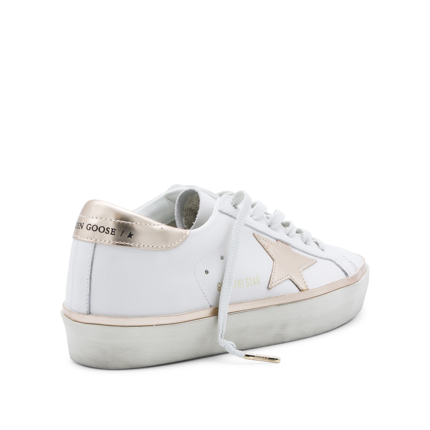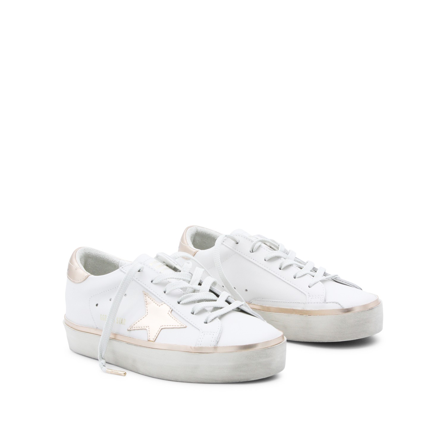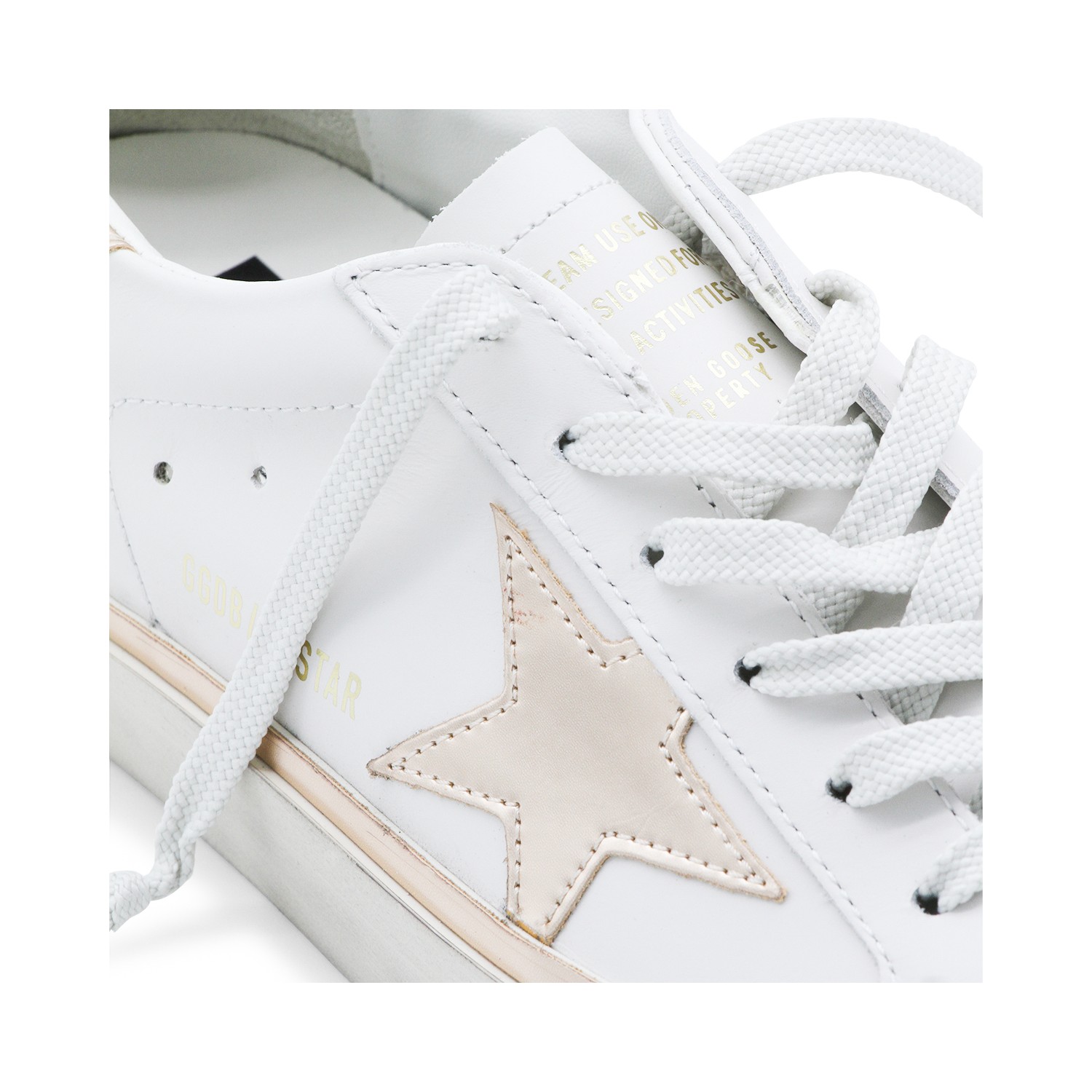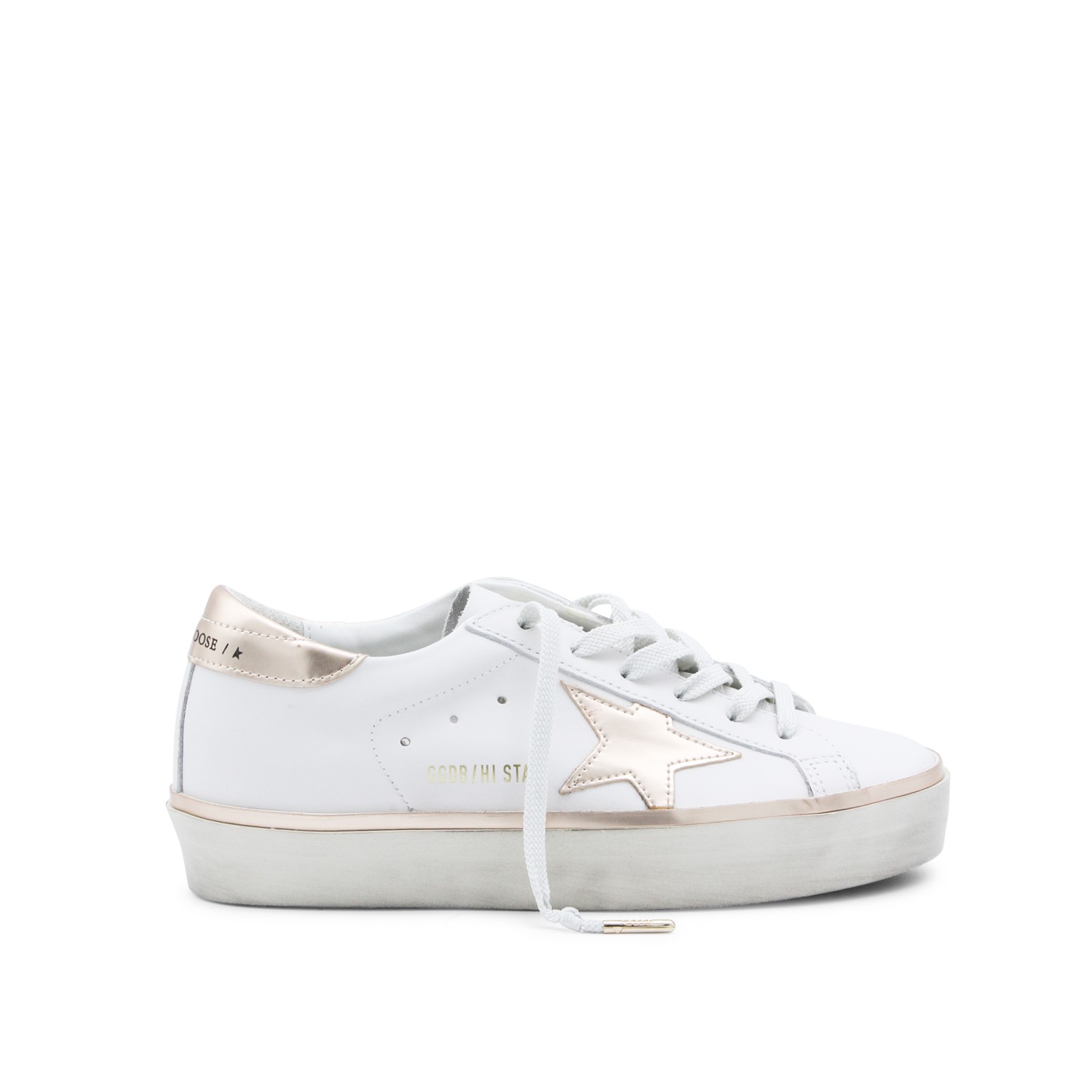 White leather Hi-Star sneakers from Golden Goose featuring round toe, cotton lace-up fastening, lateral logo signature, metallic silver heel tab and star patch, vintage treatment and platform sole.