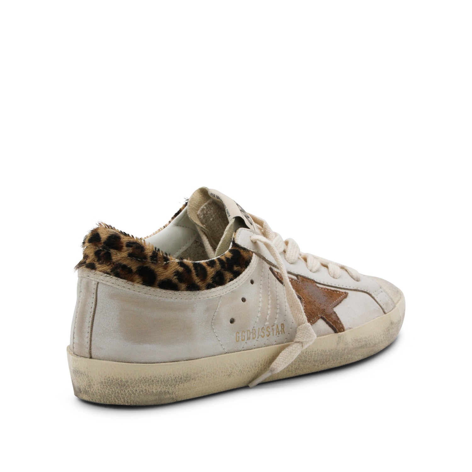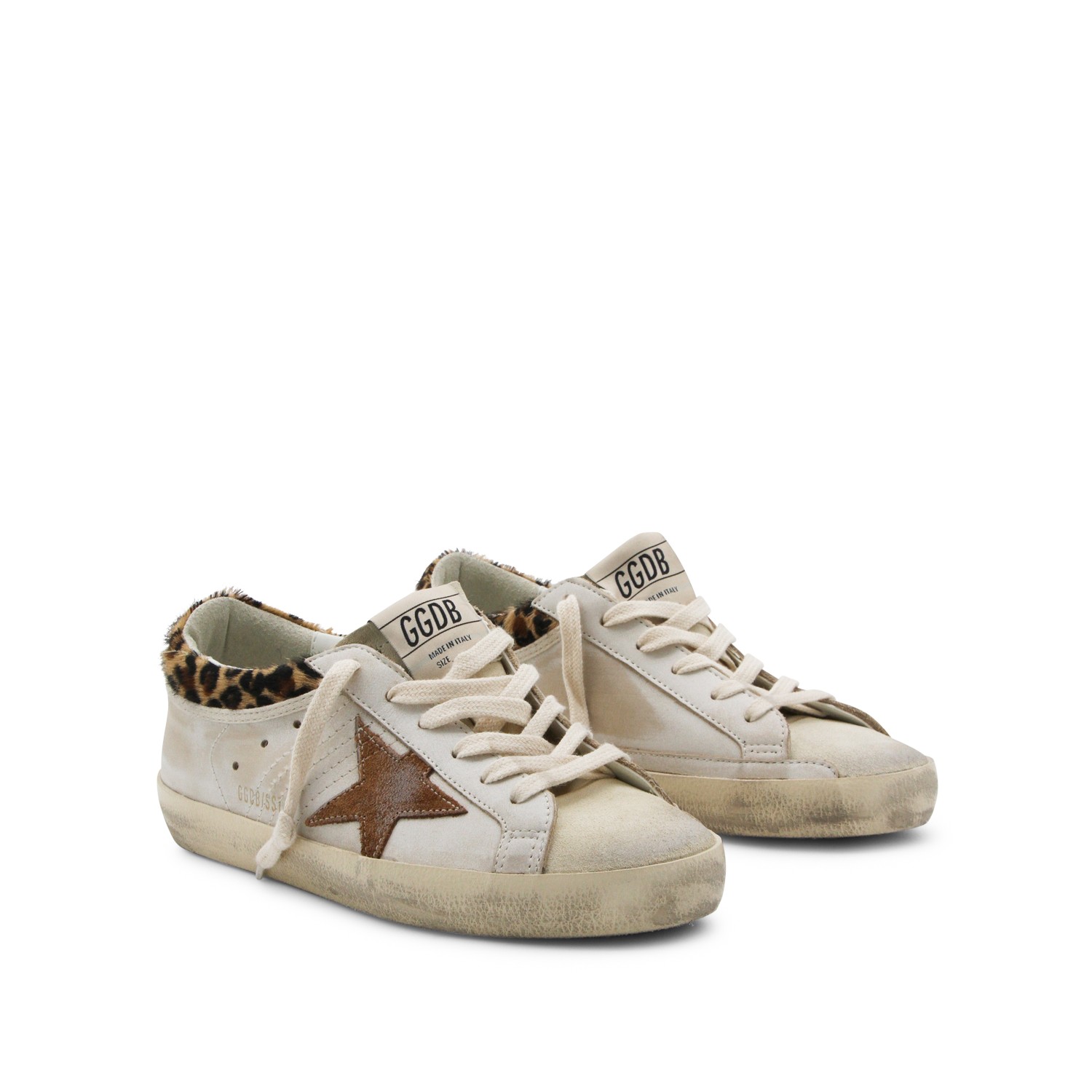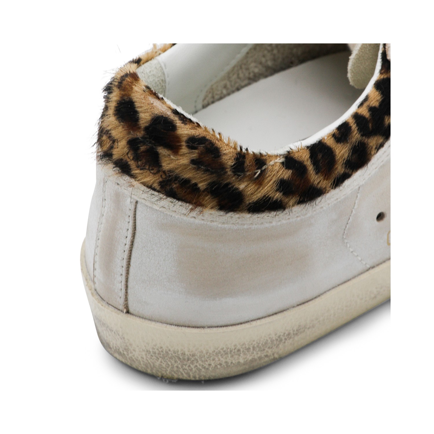 Beige and leopard leather Superstar sneakers from Golden Goose featuring round toe, cotton lace up fastening, suede details on the back, rubber sole, branded insole, logo and star patch.