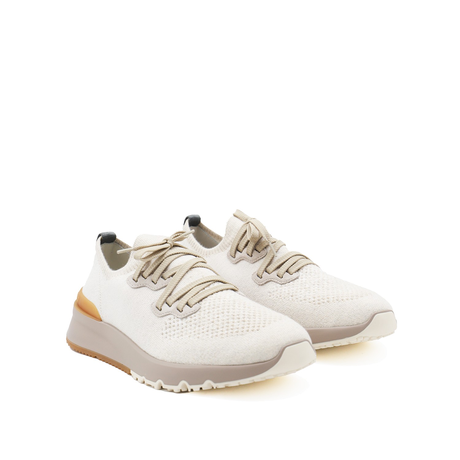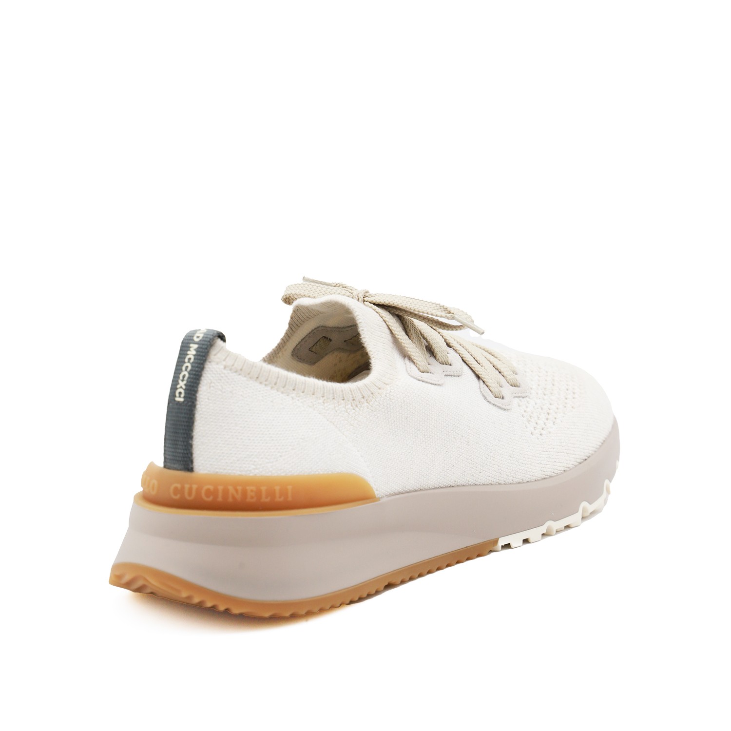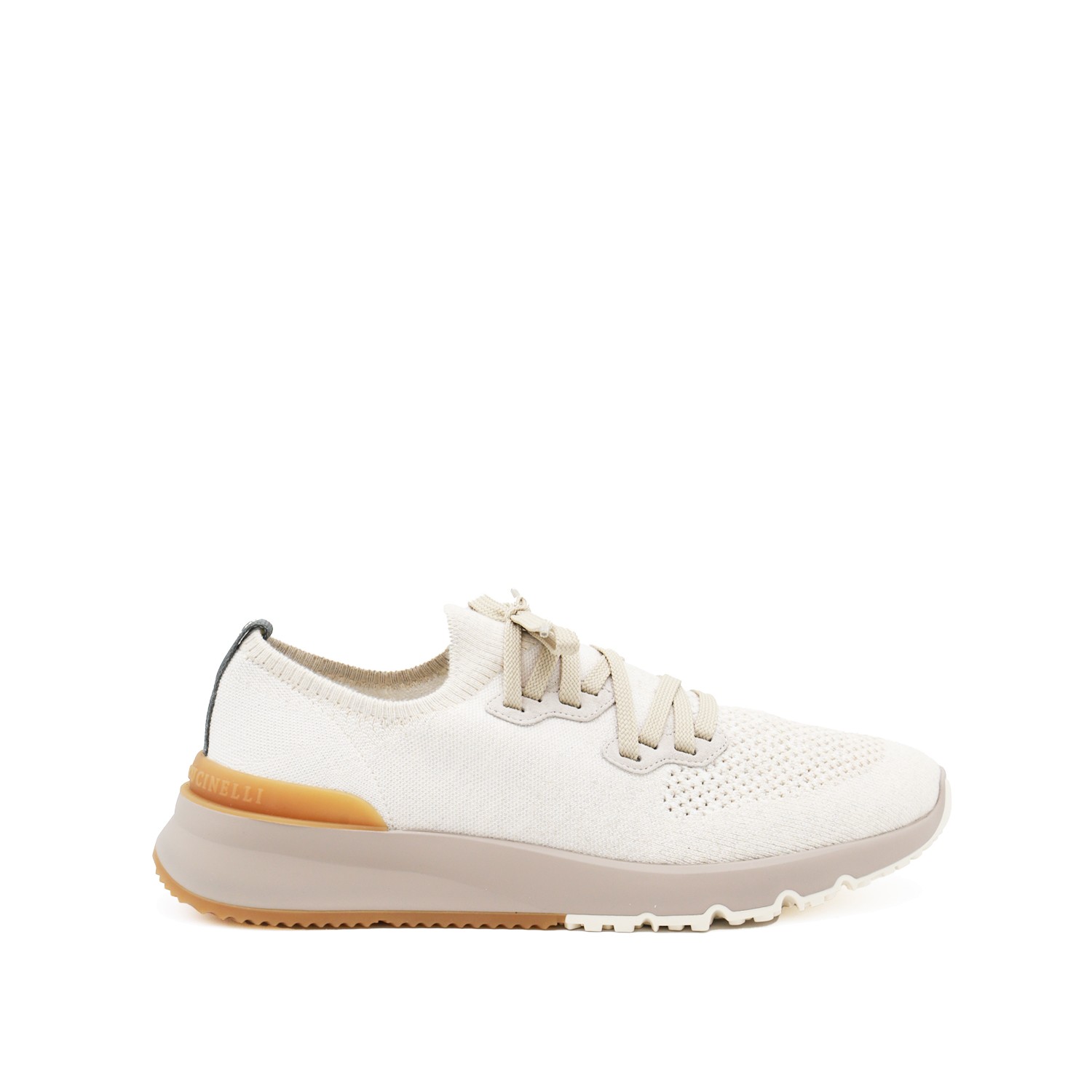 White knit sneakers from Brunello Cucinelli with sole in lightweight micro rubber, semi polished calfskin trim and flat fabric laces.