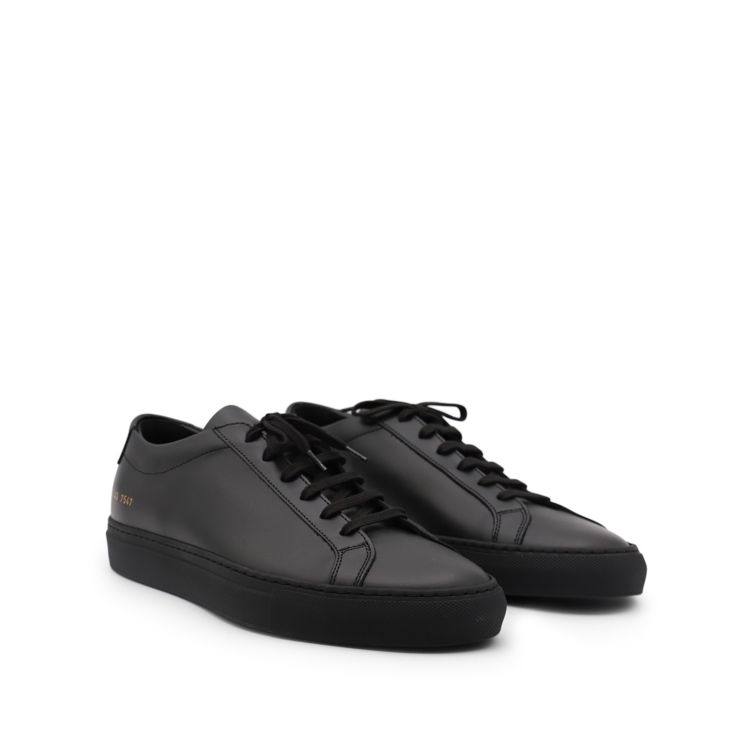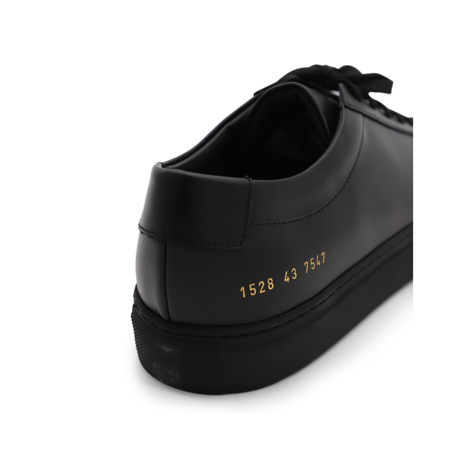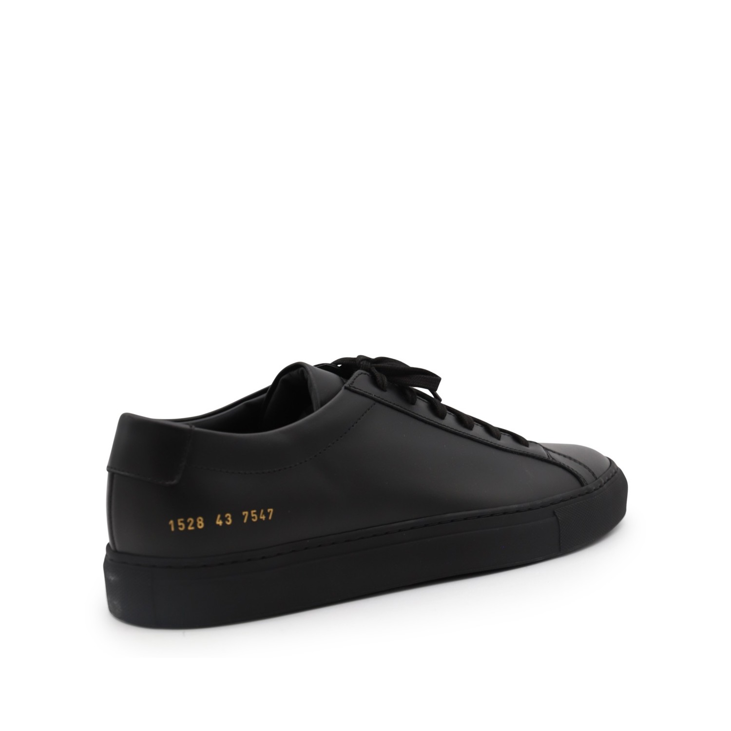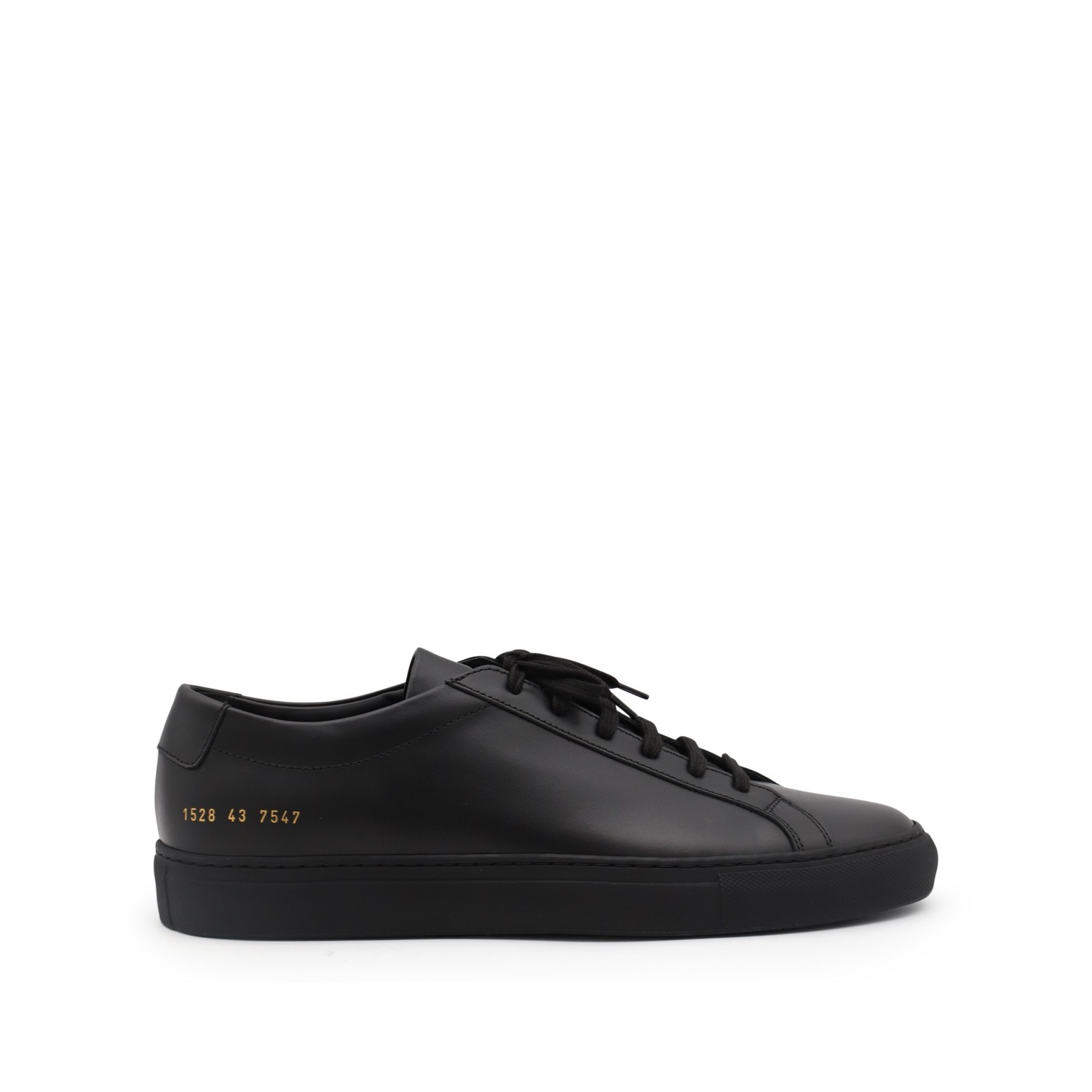 Black leather Achille low sneakers from Common Projects featuring round toe, lace-up fastening, lateral printed logo and flat rubber sole.