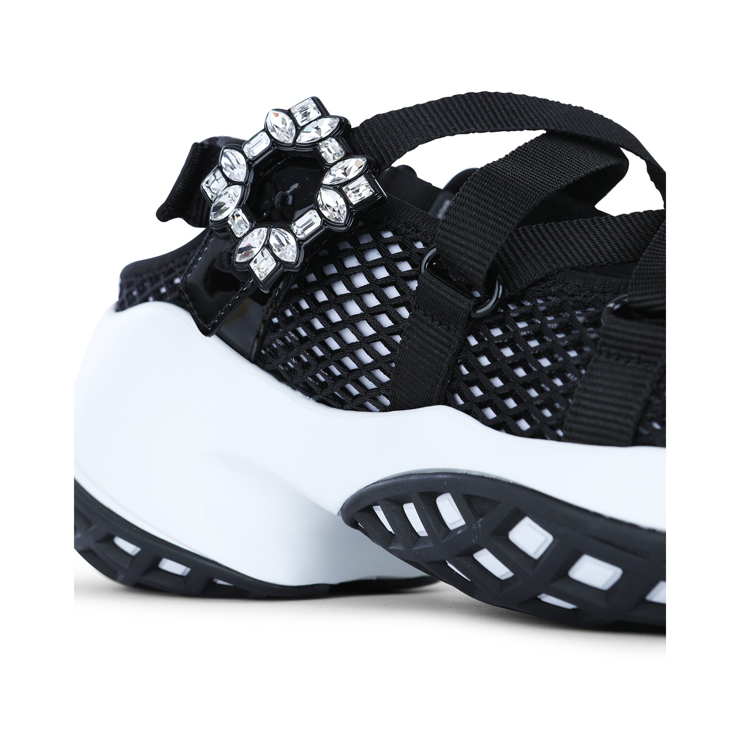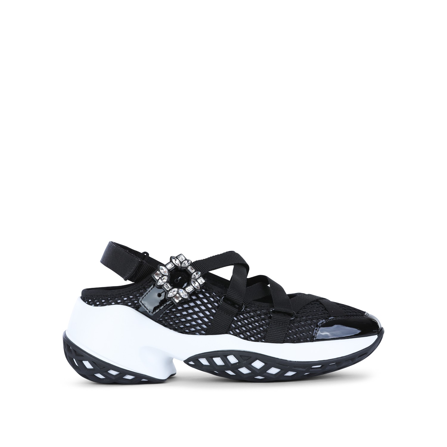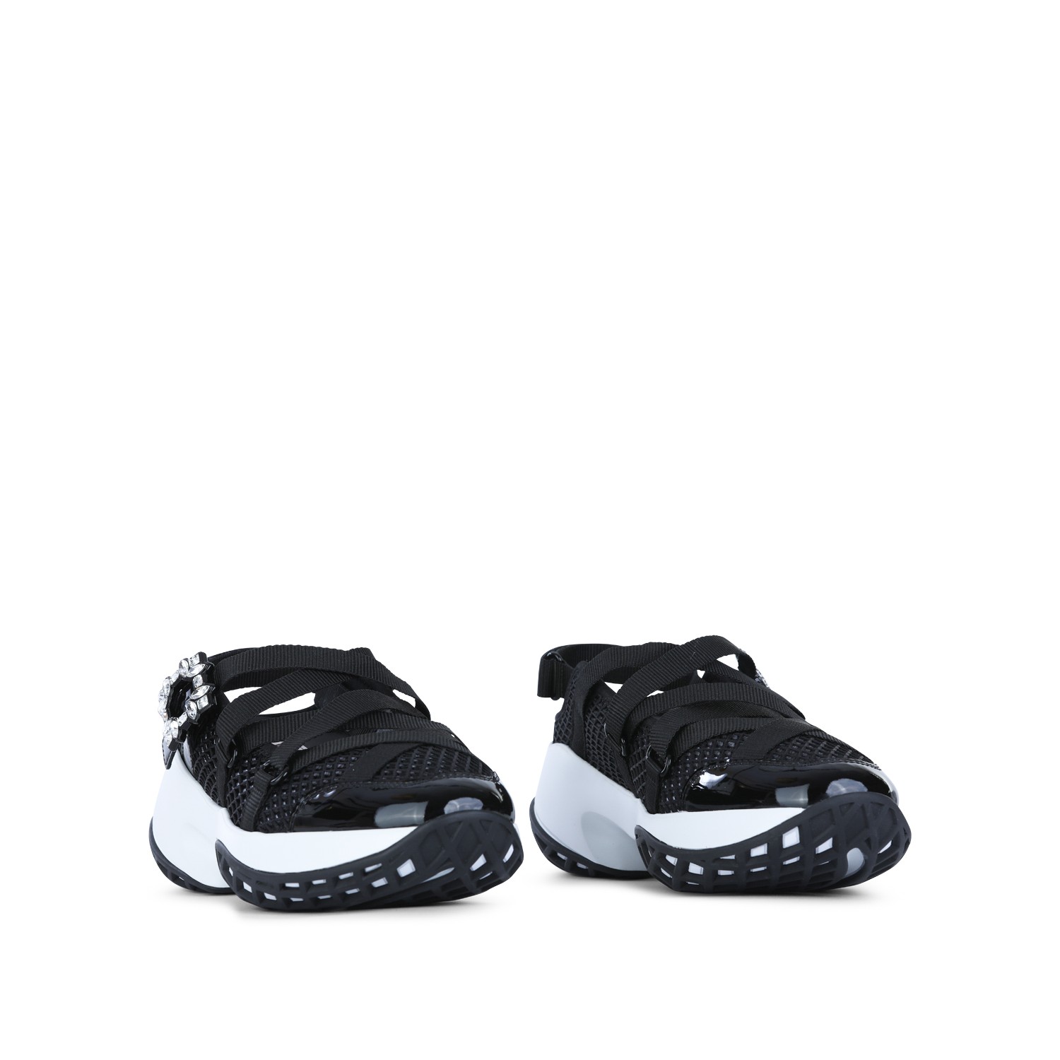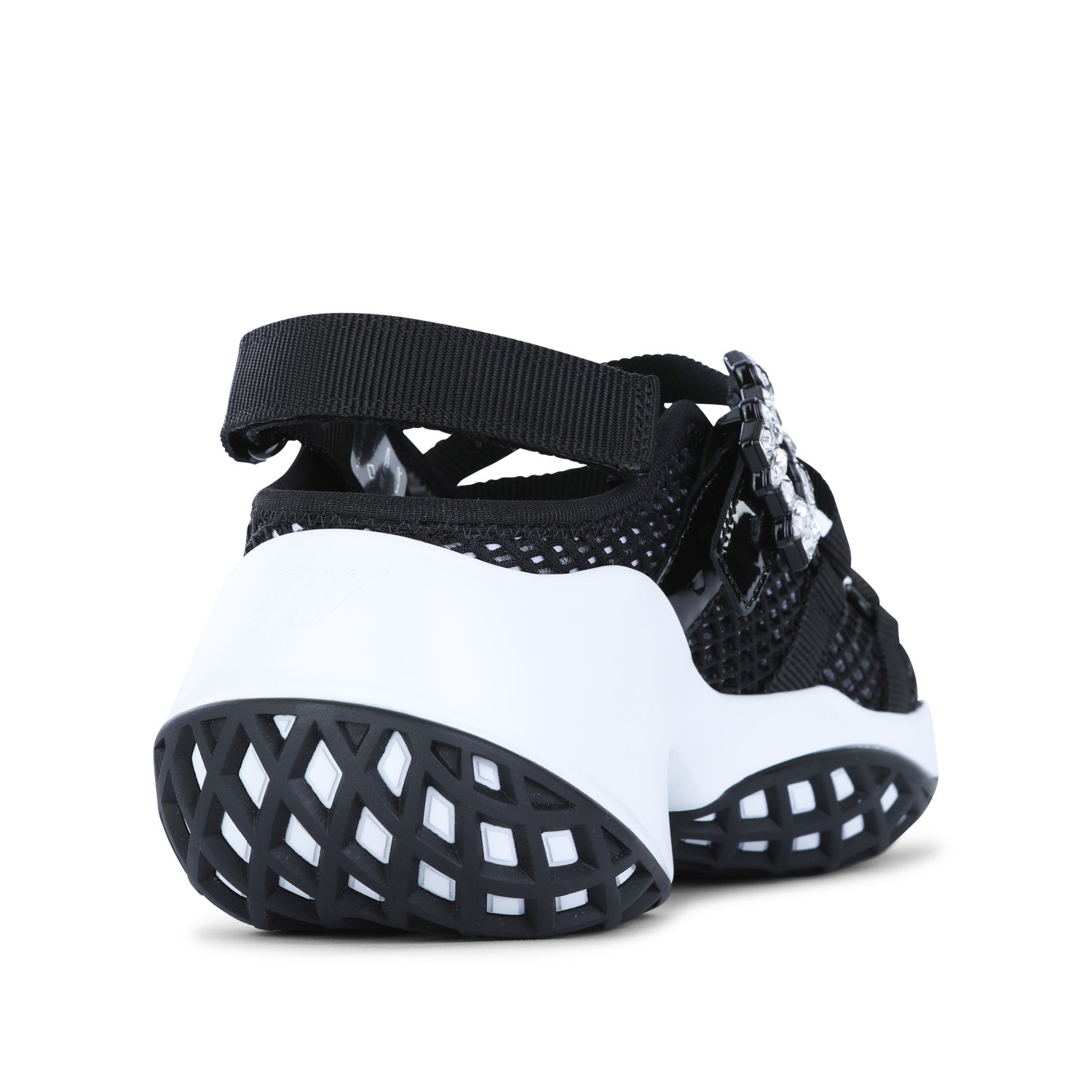 Black and white sneakers from Roger Vivier featuring round toe, bands details, mesh inserts, crystal embellishment, adjustable ankle closure and rubber sole.