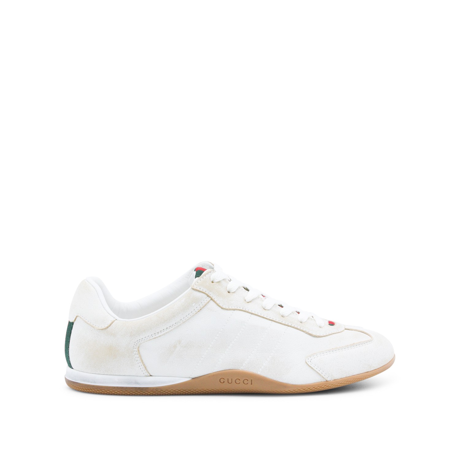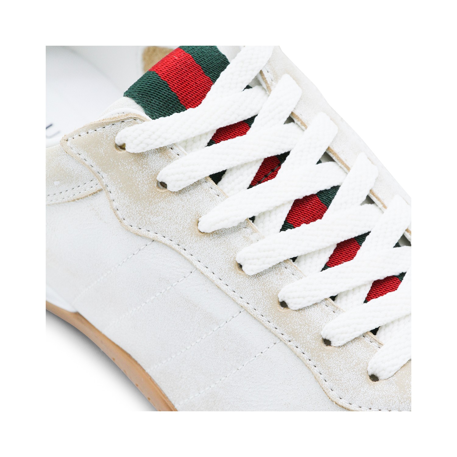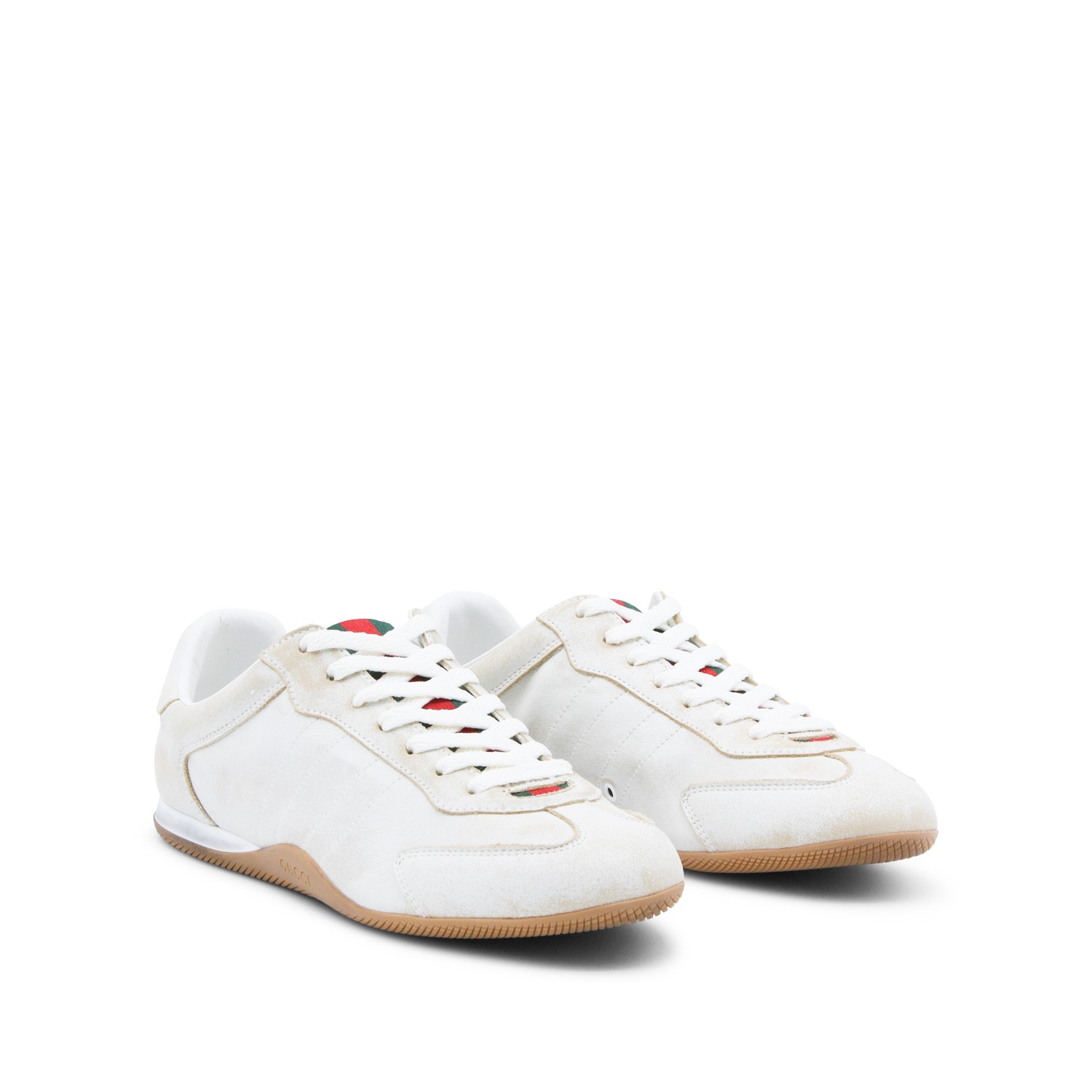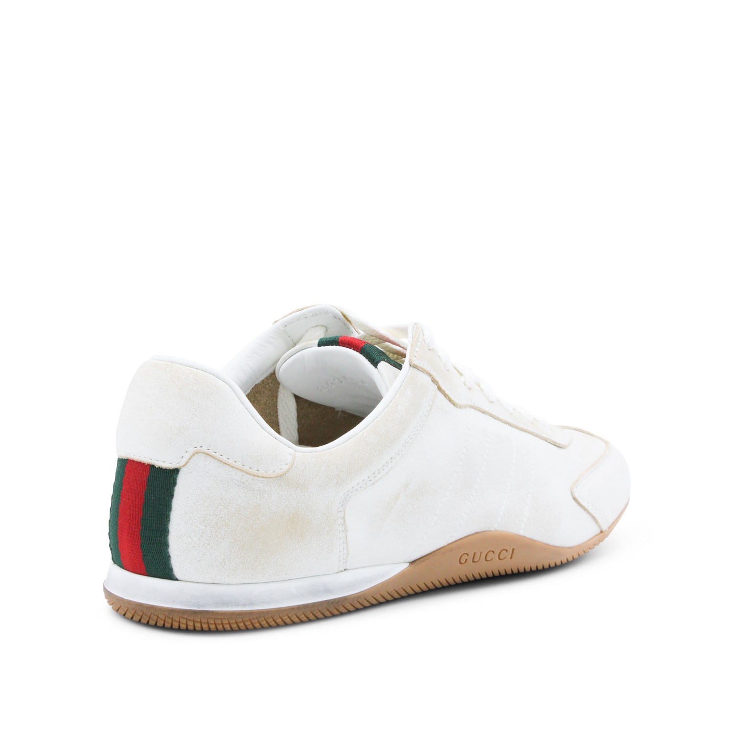 White leather sneakers from Gucci featuring round toe, laces fastening, web band details, branded insole and rubber sole.