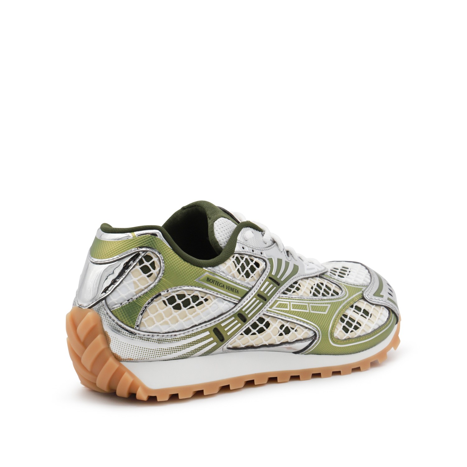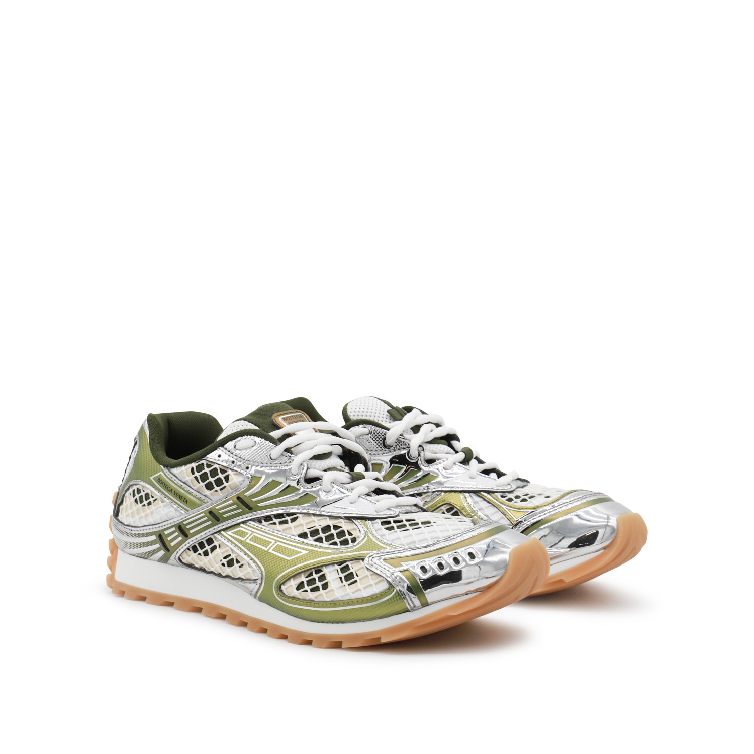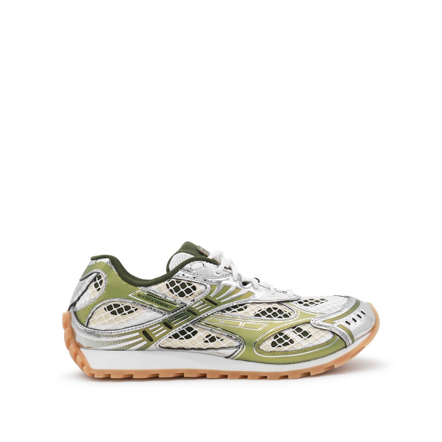 White and green Orbit sneakers from Bottega Veneta featuring round toe, cotton laces fastening, leather sole, details and regular vestibility.