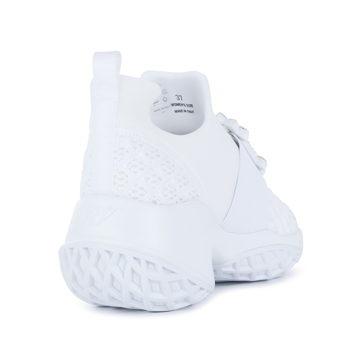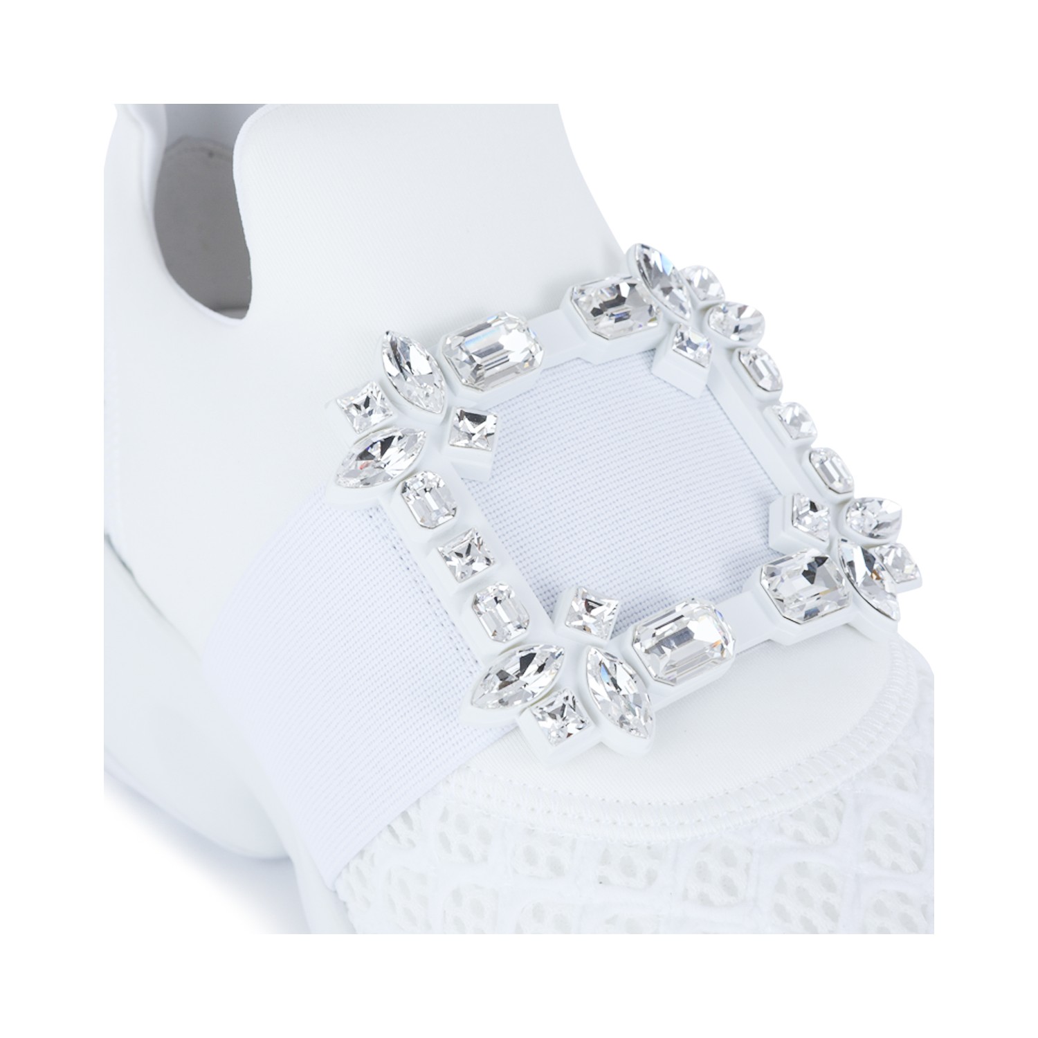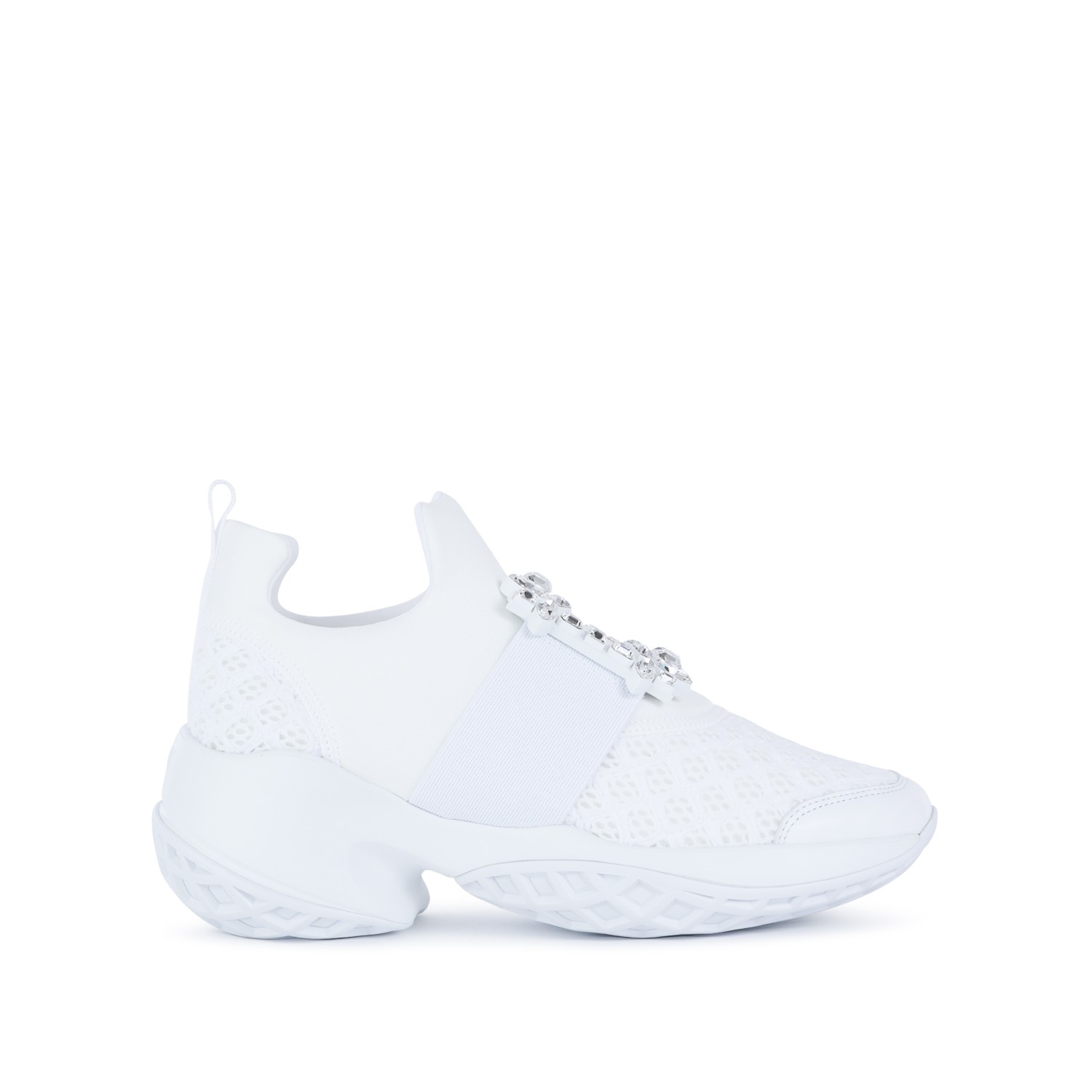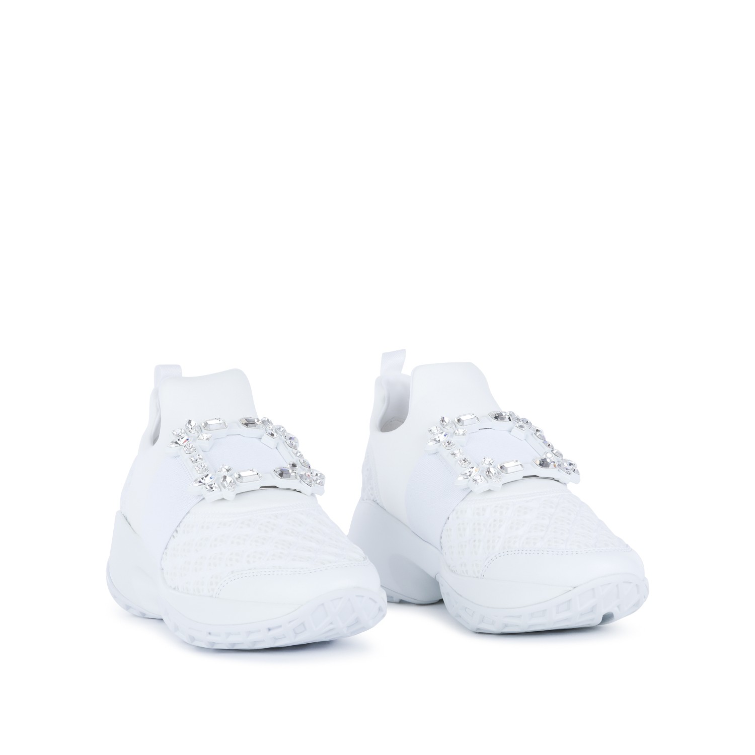 White sneakers from Roger Vivier featuring round toe, frontal silver tone embellishment, branded insole and rubber sole.