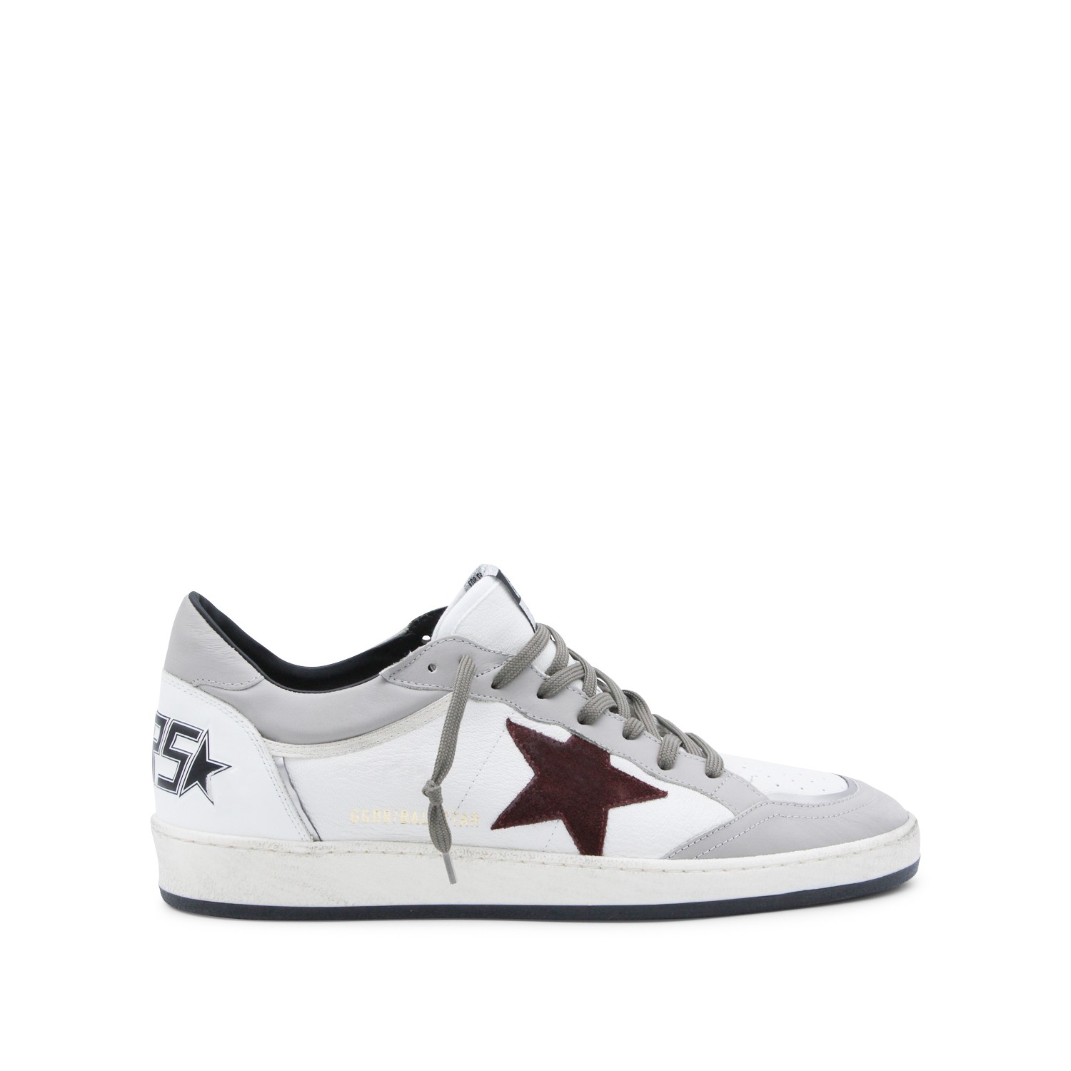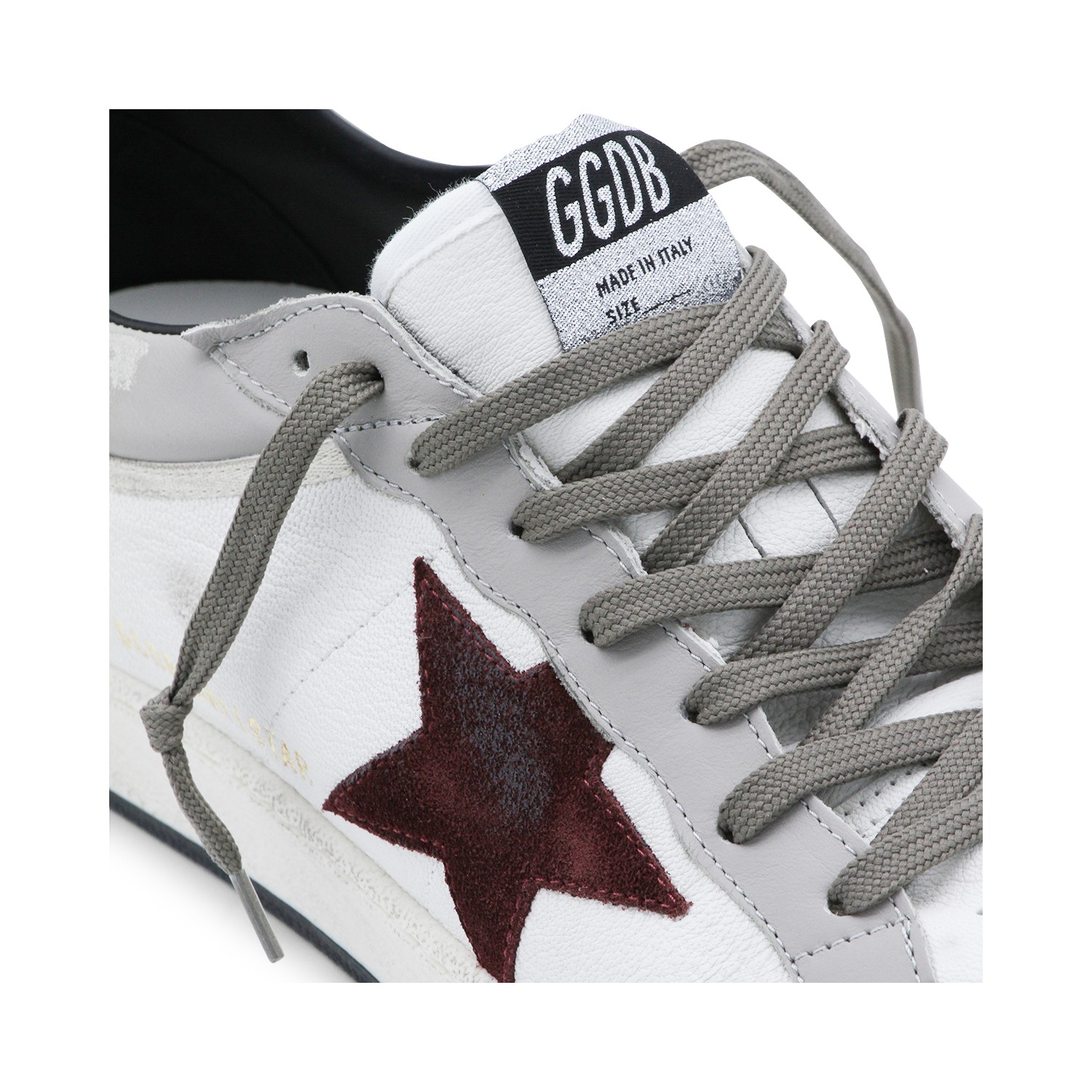 White and bordeaux leather Ballstar sneakers from Golden Goose featuring round toe, cotton laces fastening, lateral star patch, grey inserts, branded insole and rubber sole.