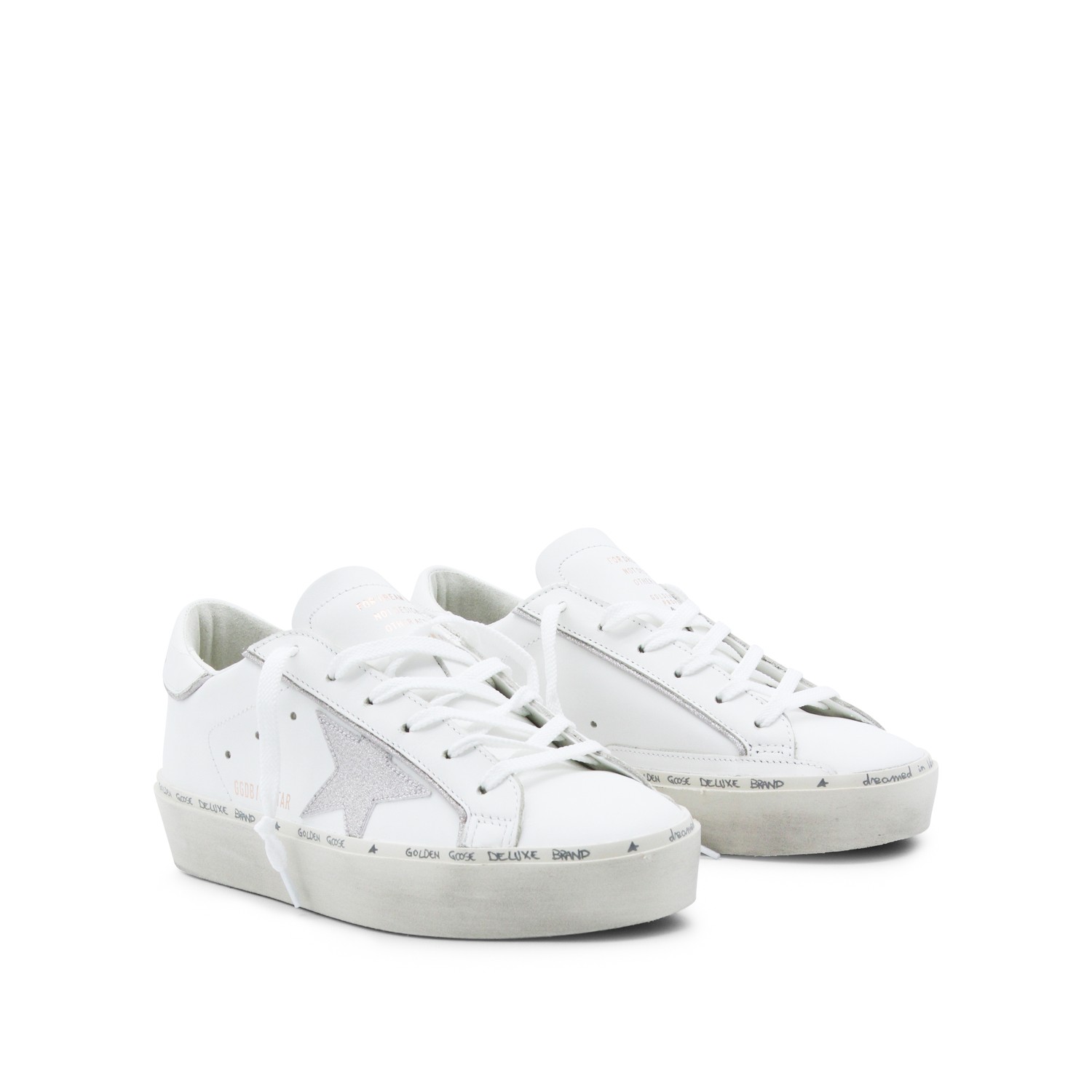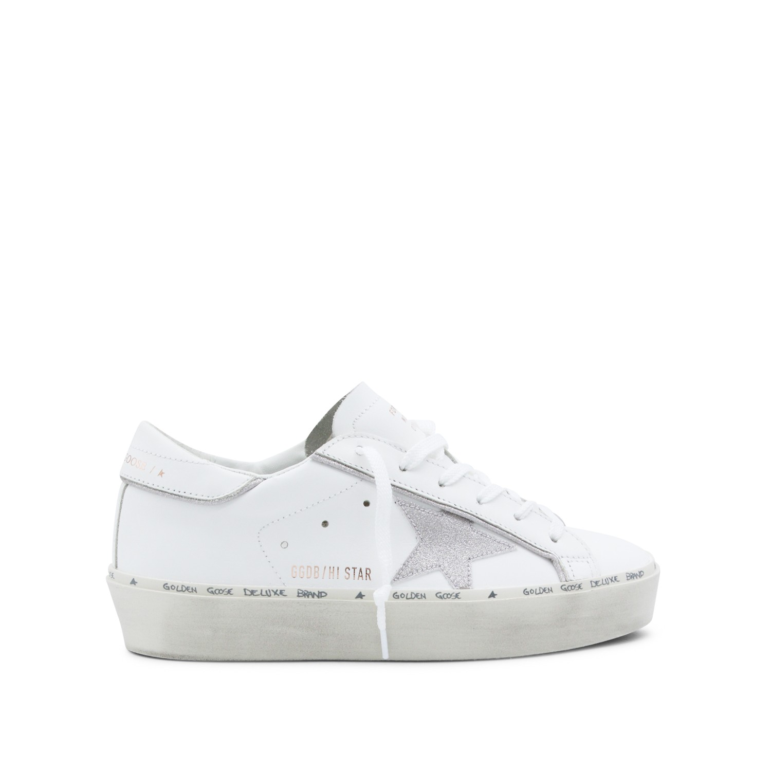 White and platinum leather Hi Star sneakers from Golden Goose featuring round toe, laces fastening, suede details and mid platform sole.