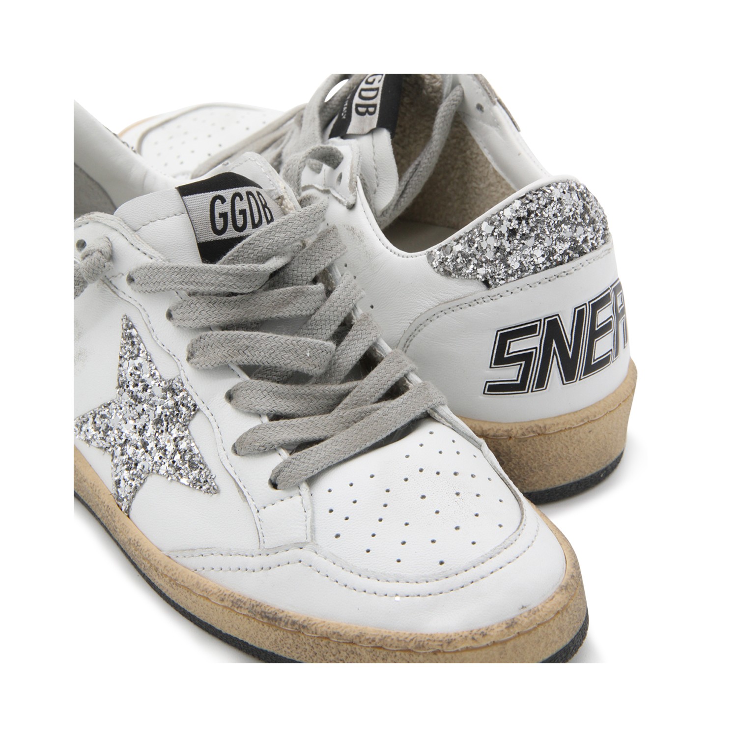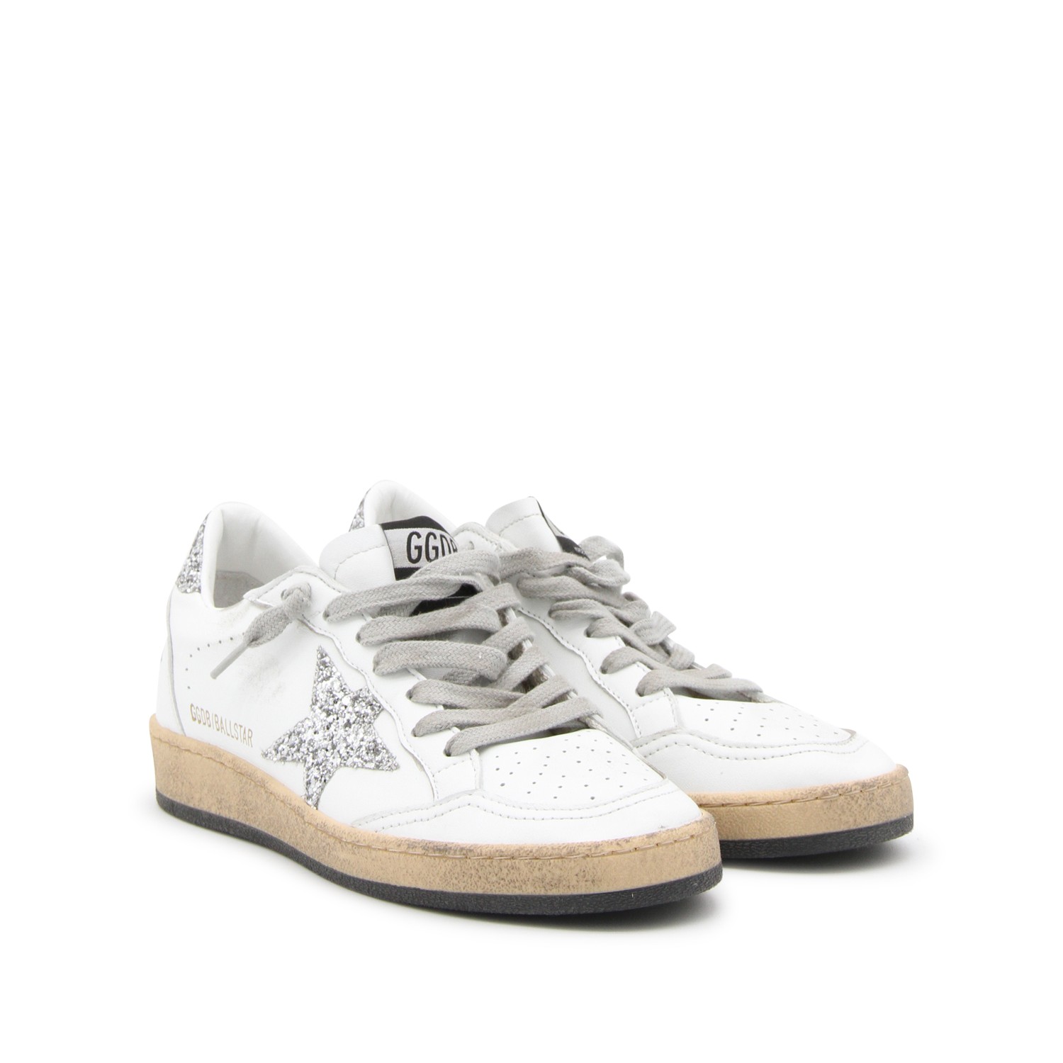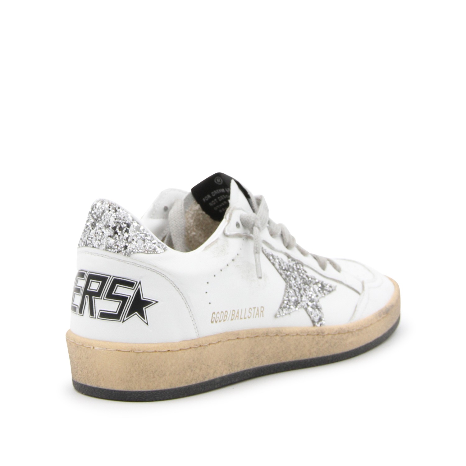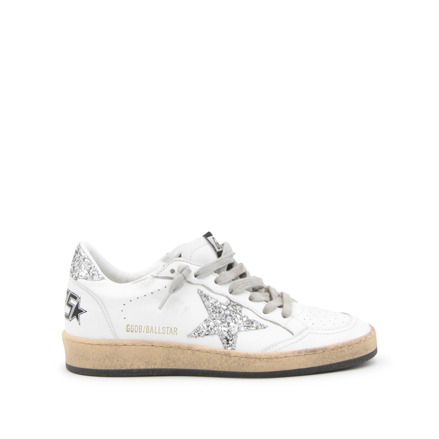 White and silver Ballstar sneakers from Golden Goose featuring round toe, cotton laces fastening, back logo, details and leather sole.