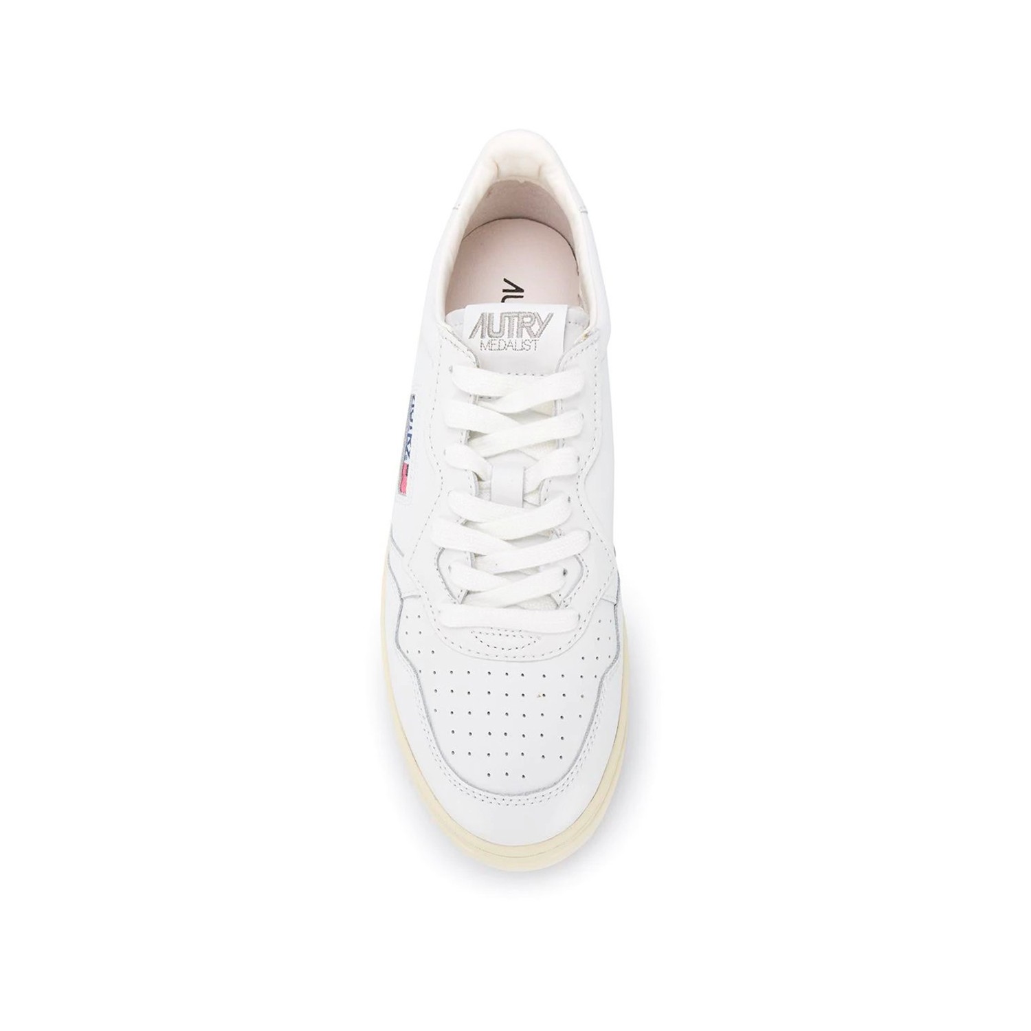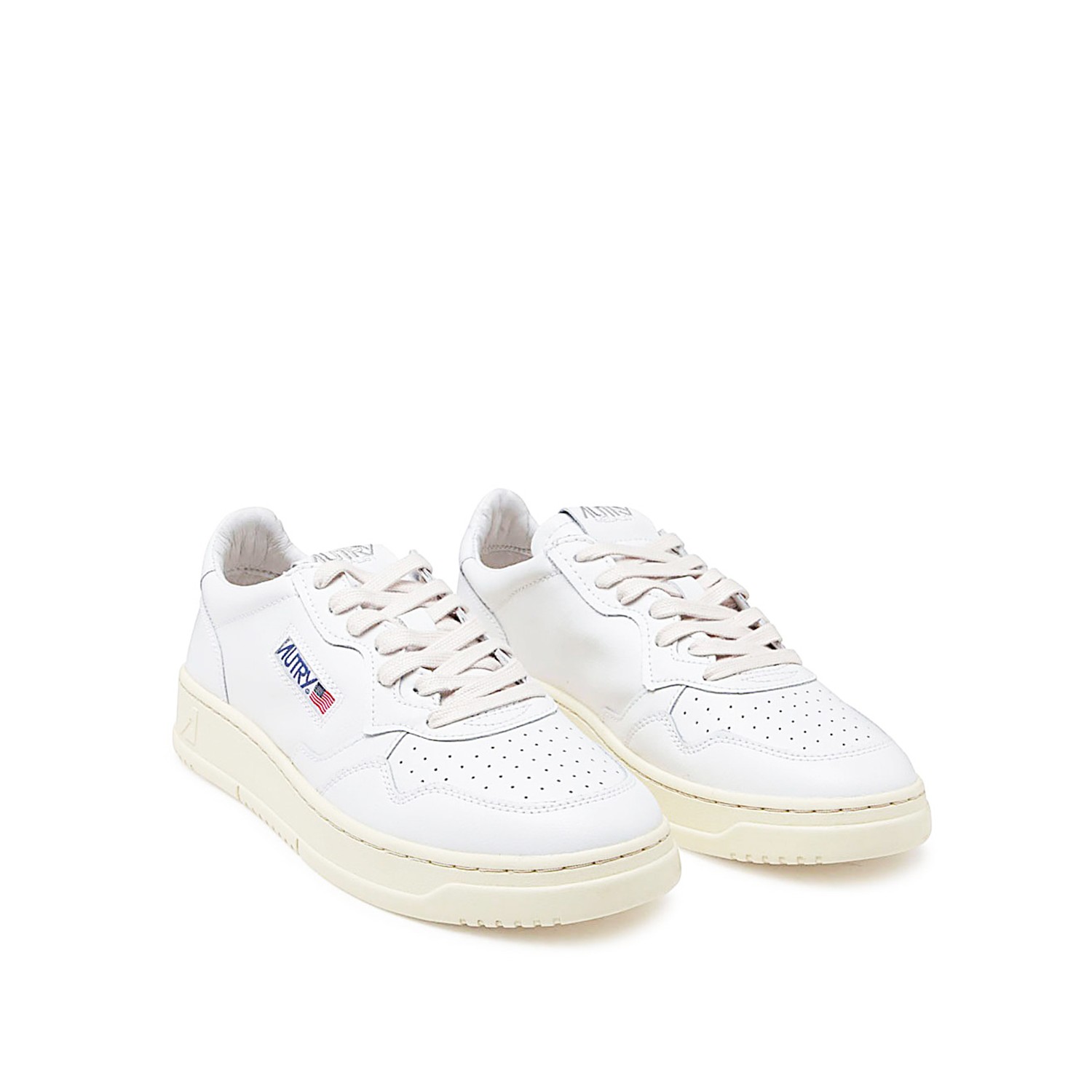 White leather Action sneakers from Autry featuring round toe, front lace-up fastening, side logo print, panelled design and flat rubber sole.