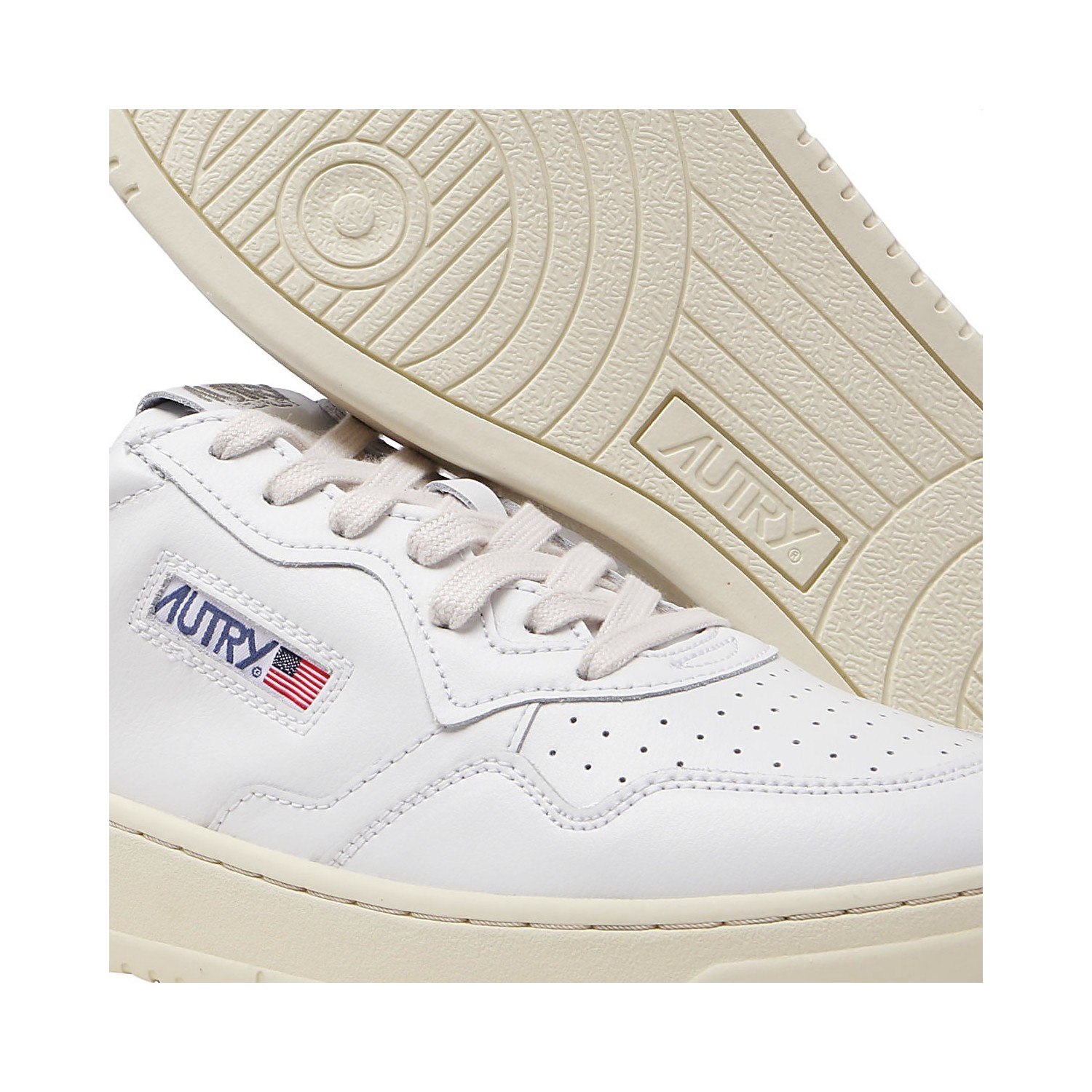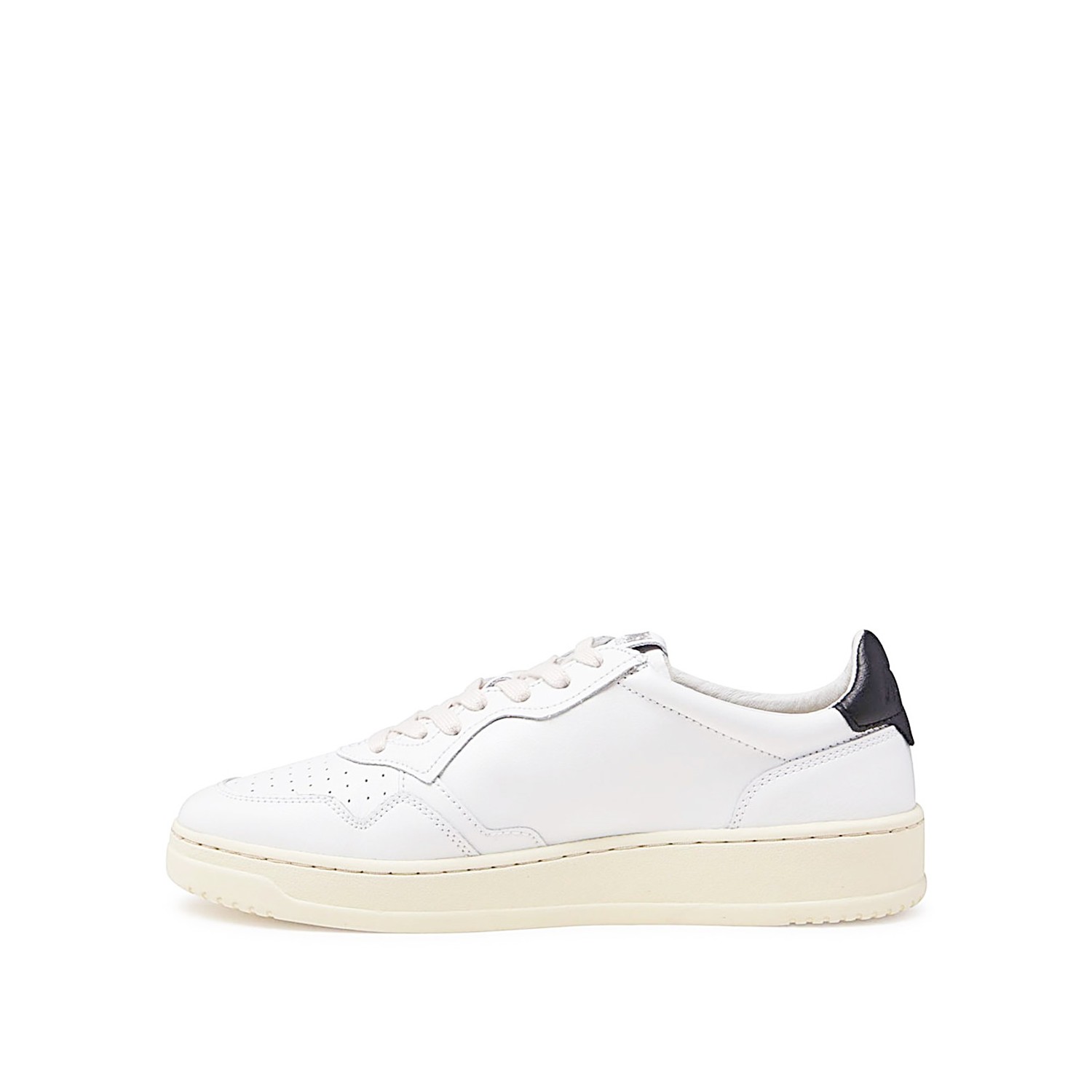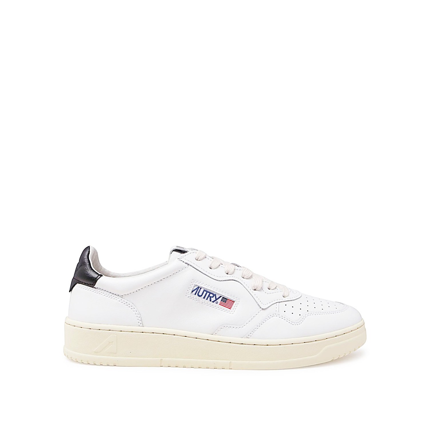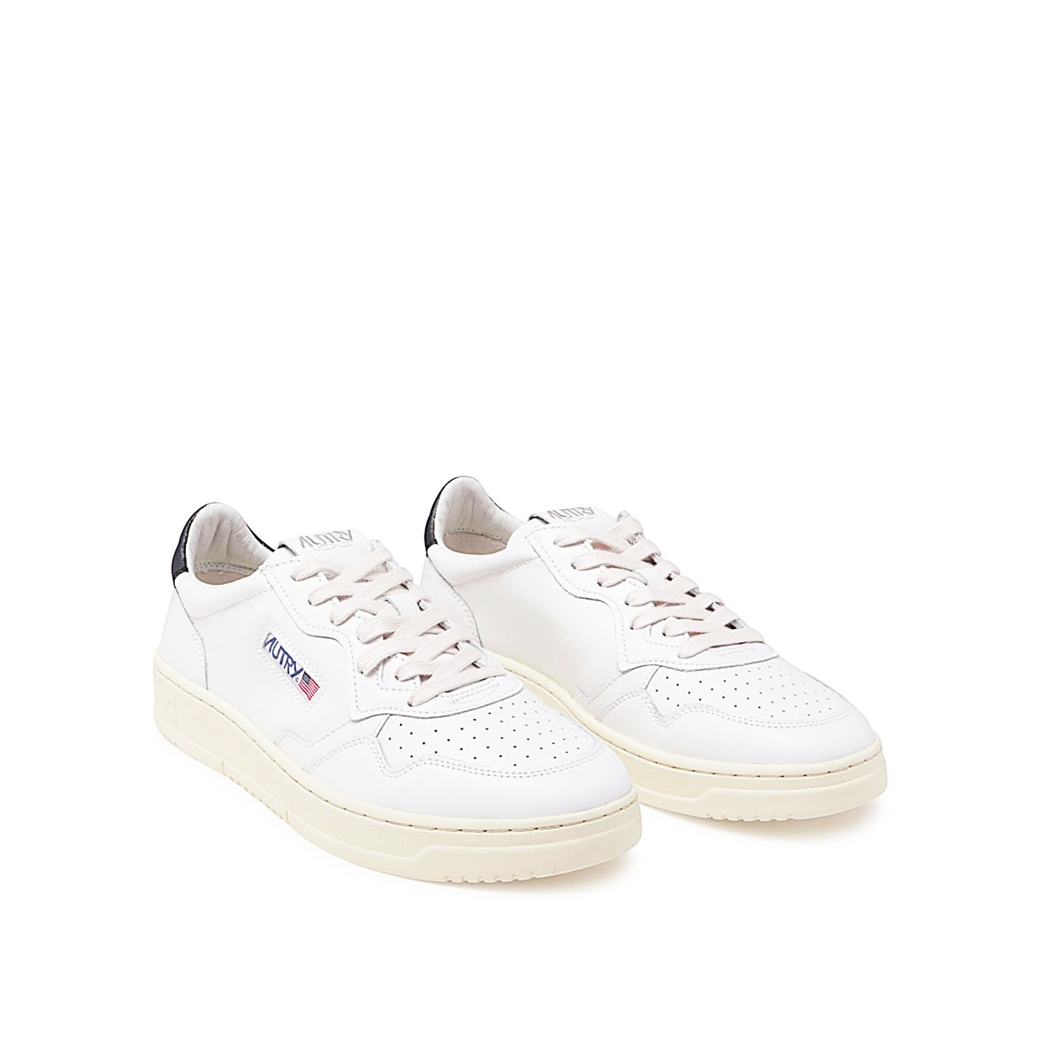 White and black leather Medalist sneakers from Autry featuring logo patch to the side, perforated detailing, contrasting heel counter, logo patch at the tongue, branded insole, branded heel counter, round toe, front lace-up fastening and flat rubber sole.