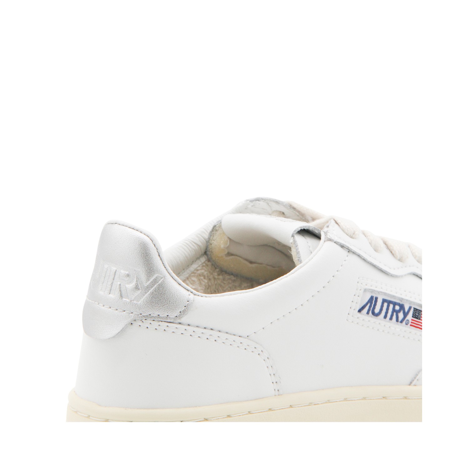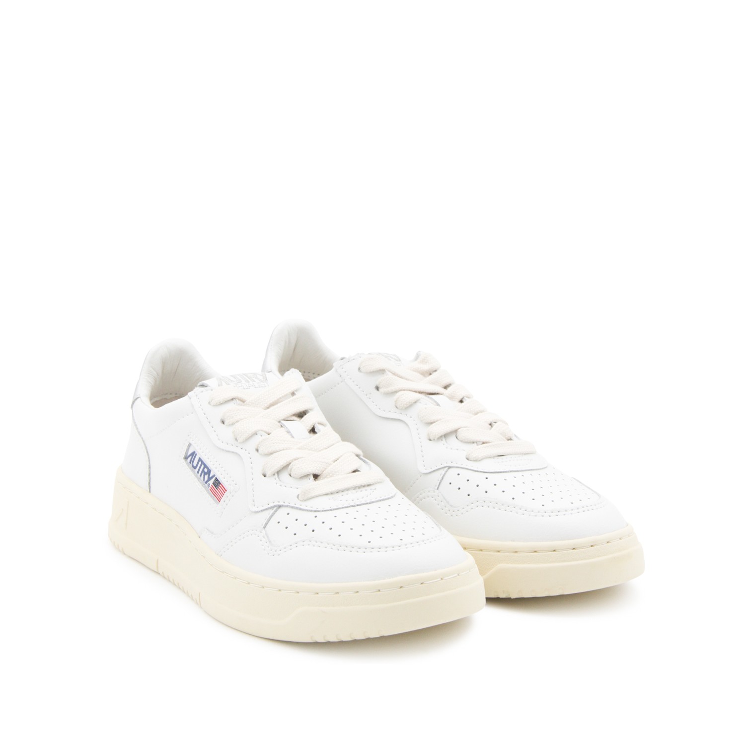 White and silver leather 01 low top sneakers from Autry featuring rubber sole, round toe, perforated details, logo label and silver metal leather counter on the heel.