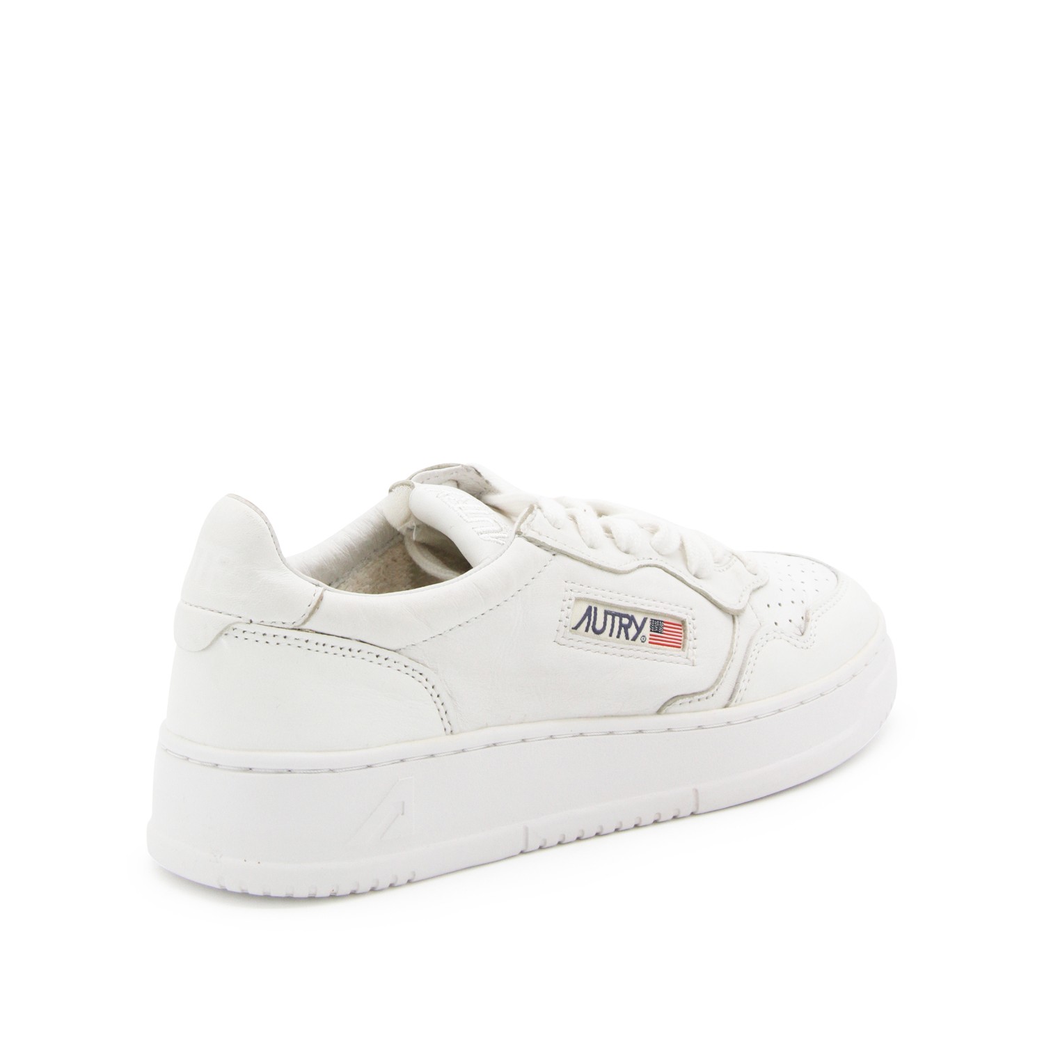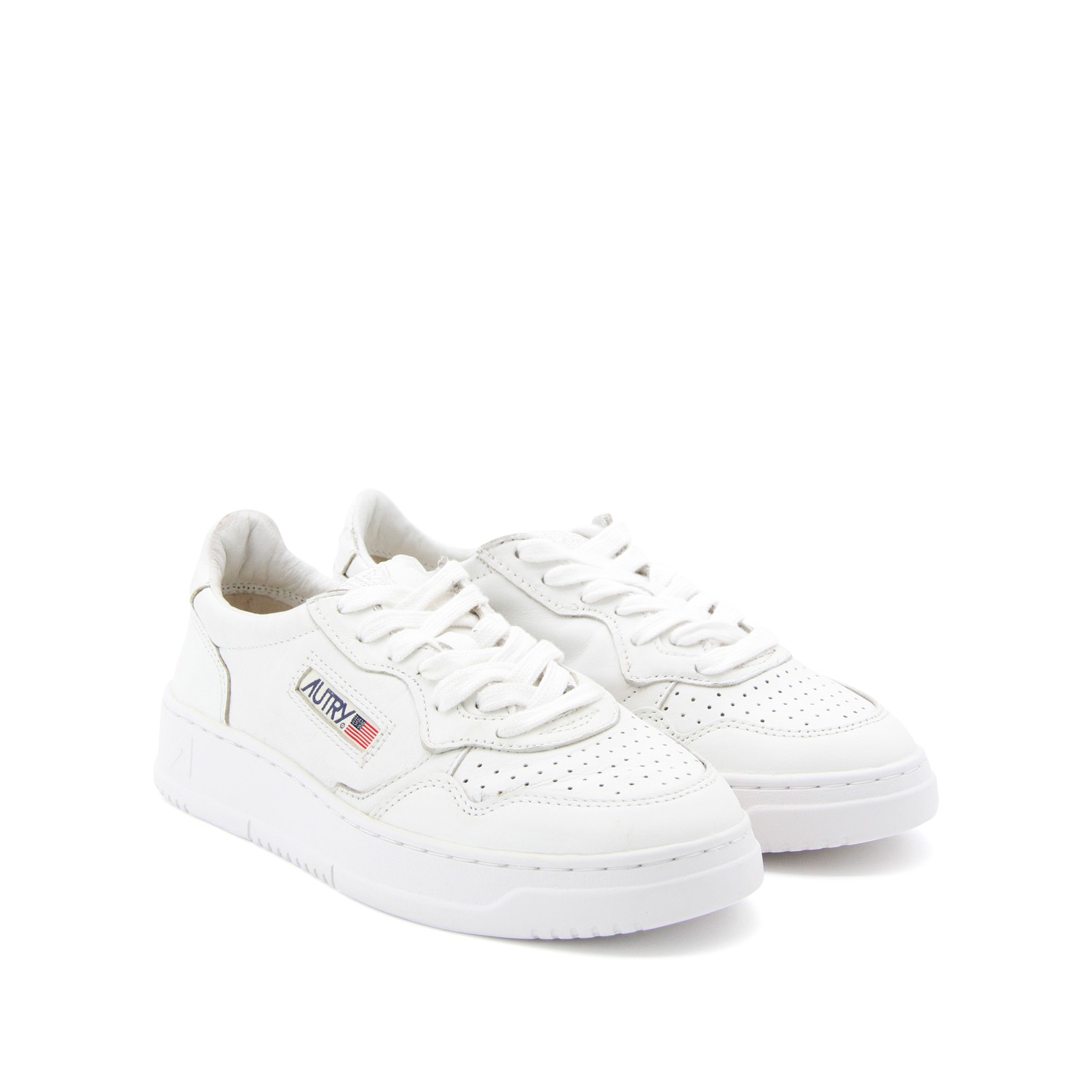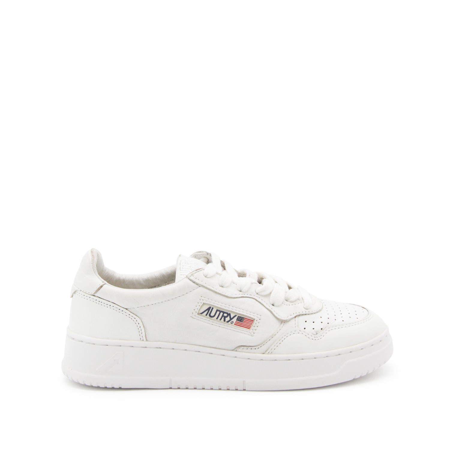 White leather Medalist sneakers from Autry featuring panelled design, logo patch to the side, logo patch at the tongue, branded heel counter, branded insole, perforated toebox, round toe, front lace-up fastening and flat rubber sole.