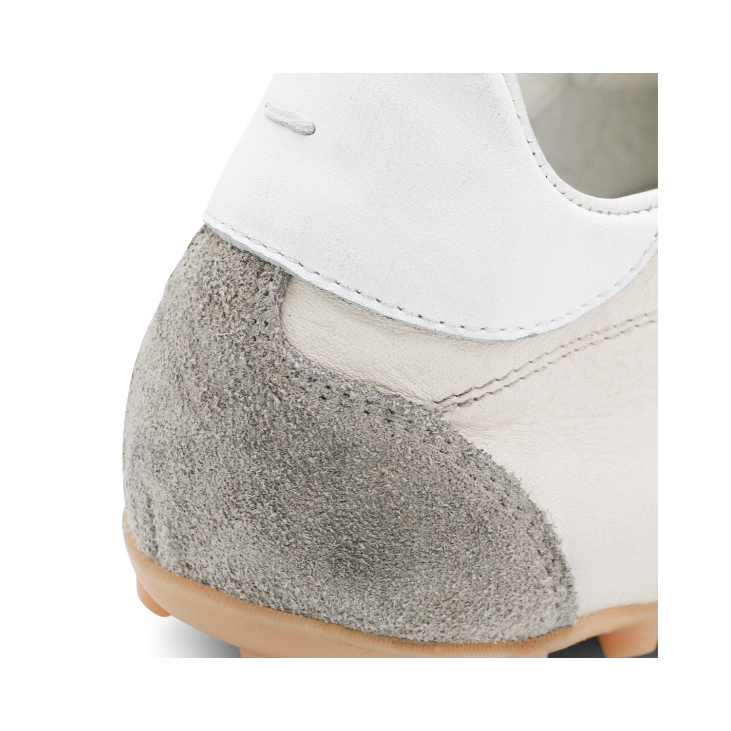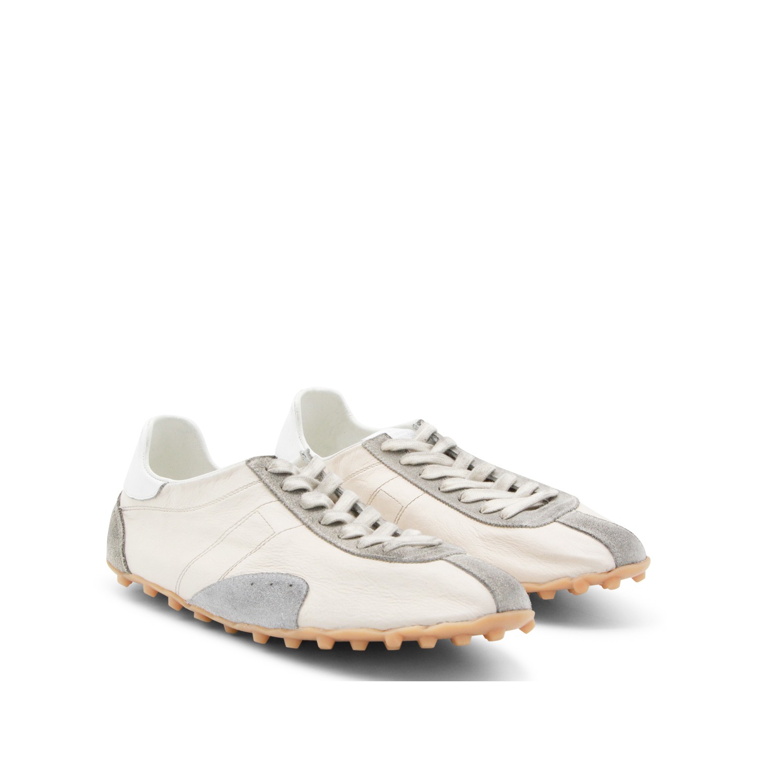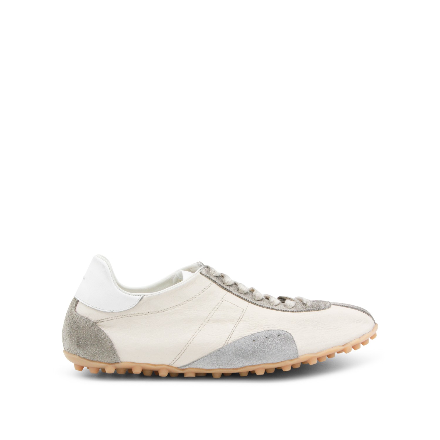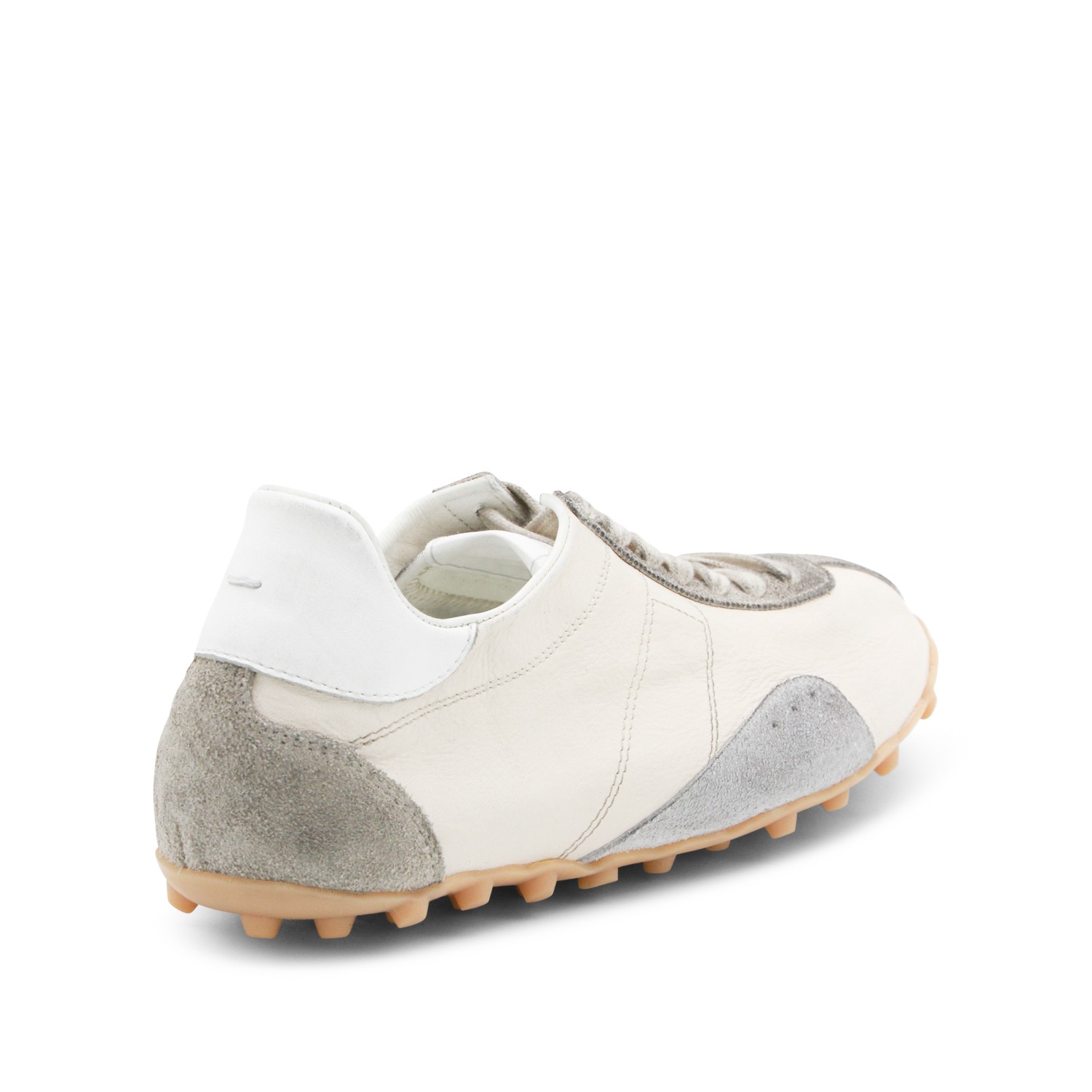 Off white leather sneakers from Maison Margiela featuring round toe, cotton laces fastening, branded heel, cotton details, rubber sole and furry suede with vintage treatment.