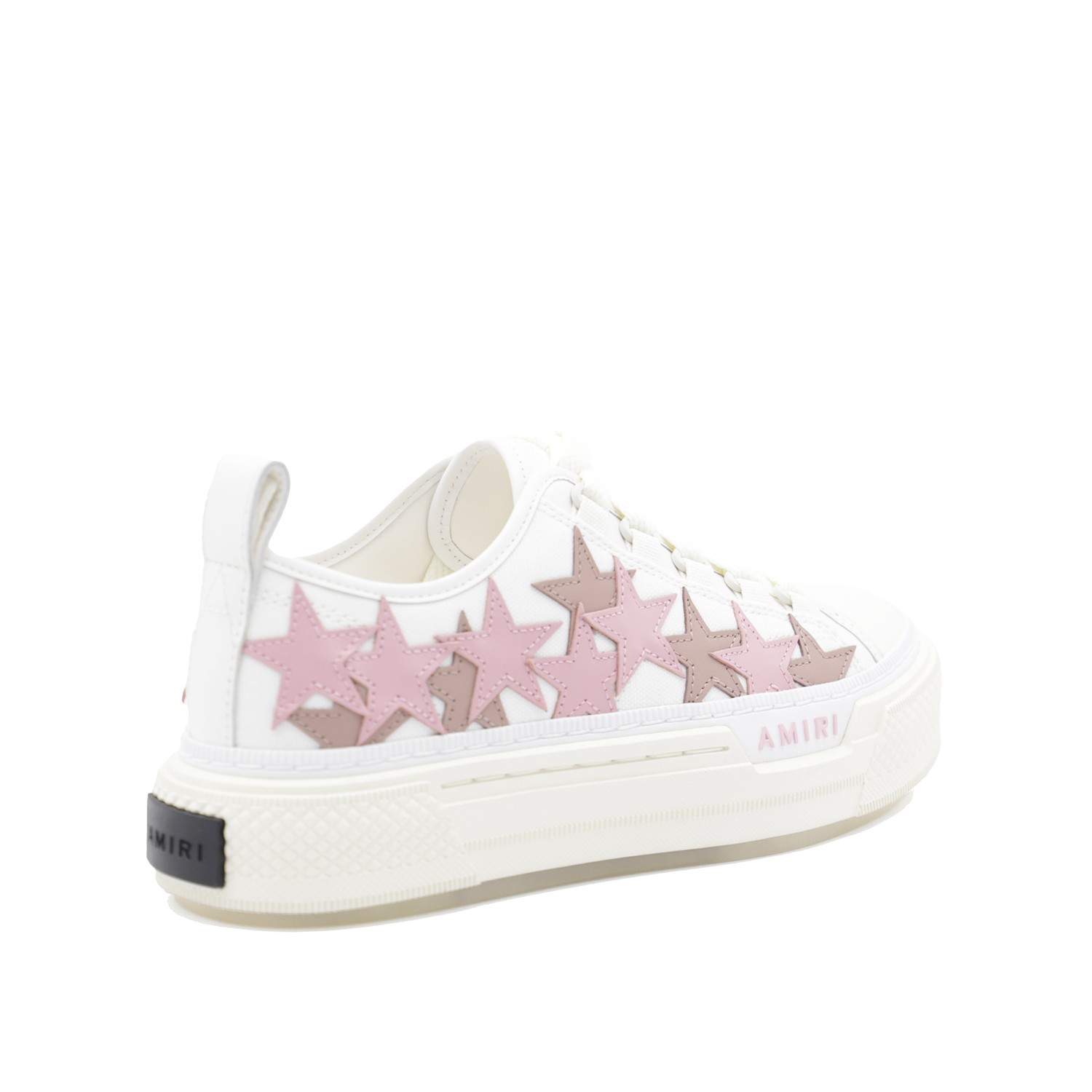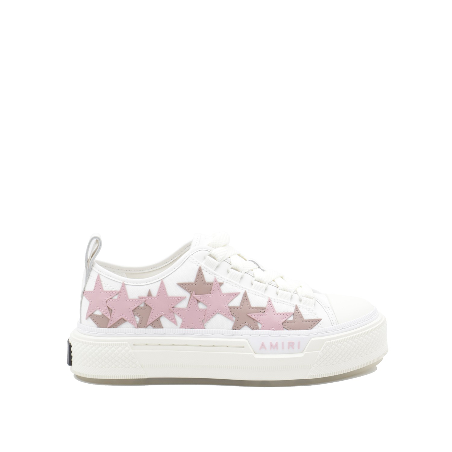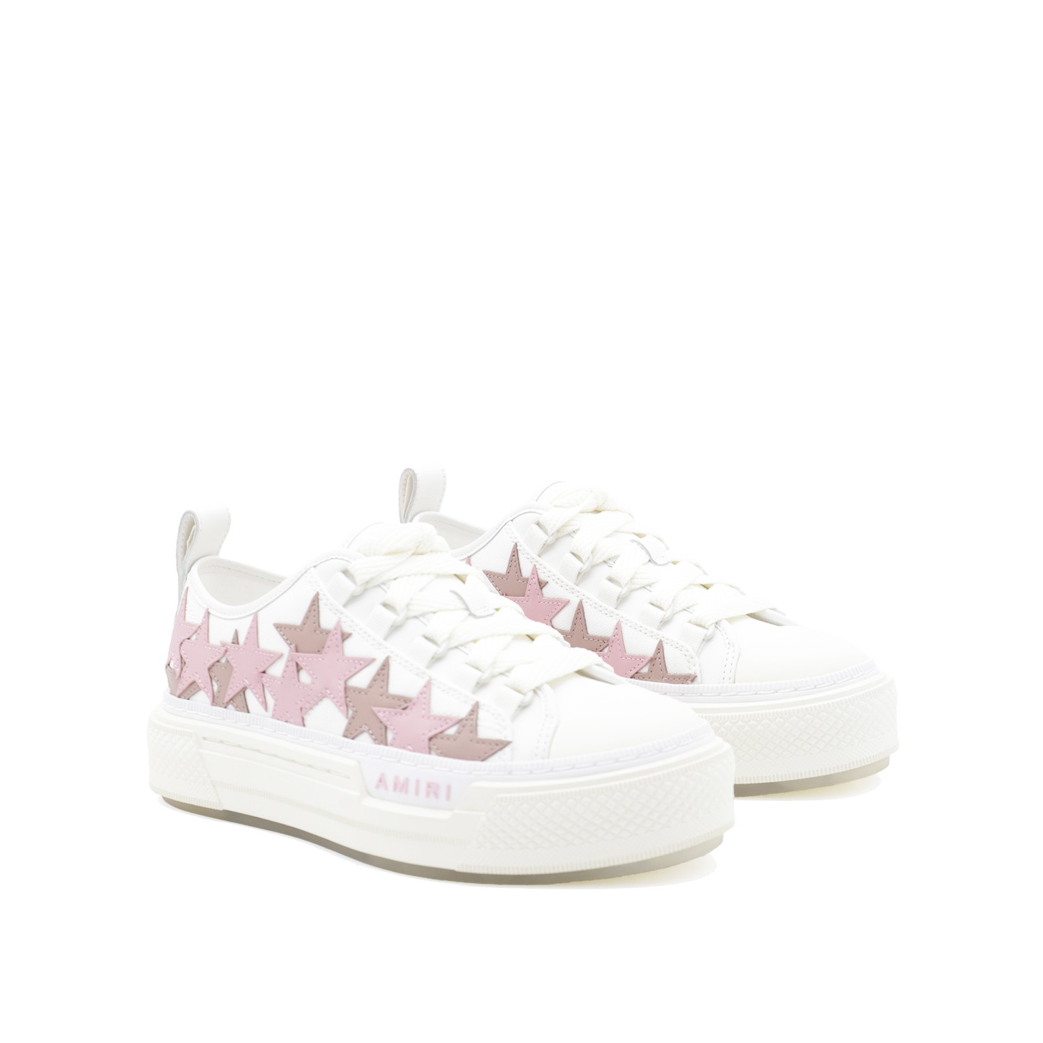 White and pink leather Stars Court sneakers from Amiri featuring round toe, lateral stars, lace up fastening and rubber sole.