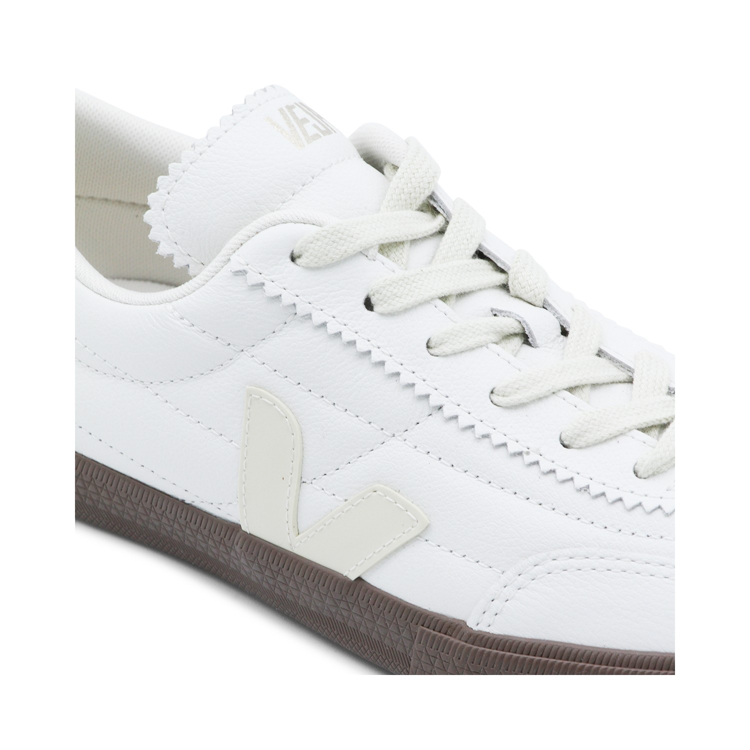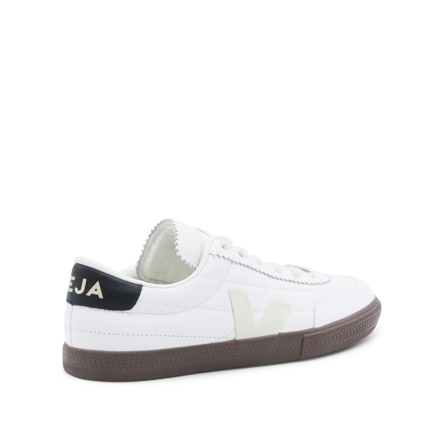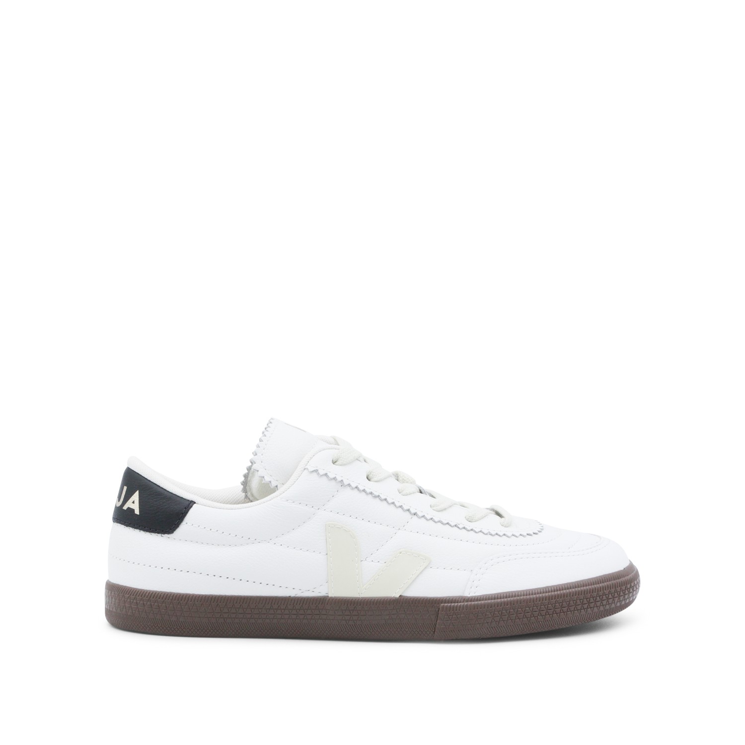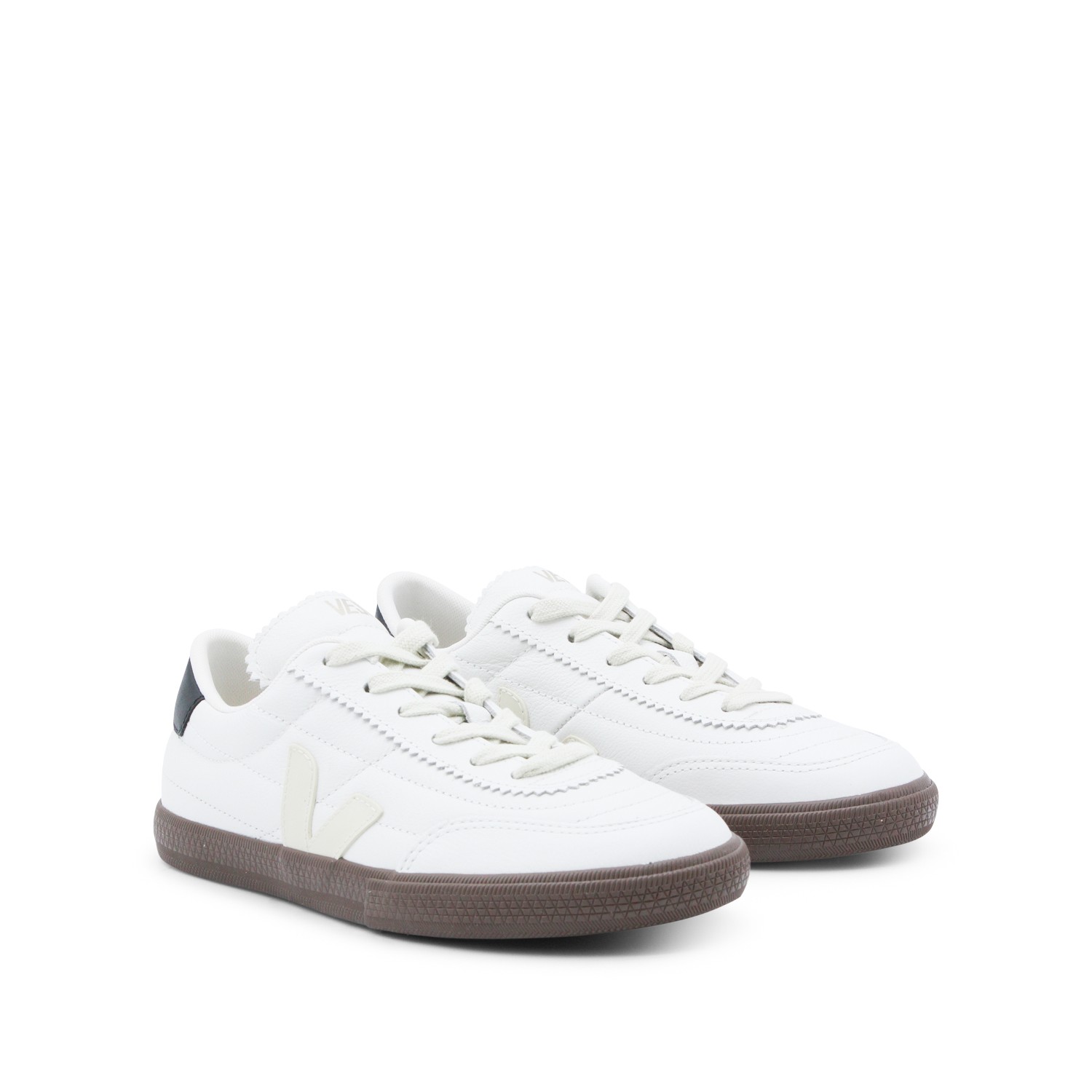 White and dark brown leather Panenka sneakets from Veja featuring round toe, visible stitching, branded heel counter and rubber sole.