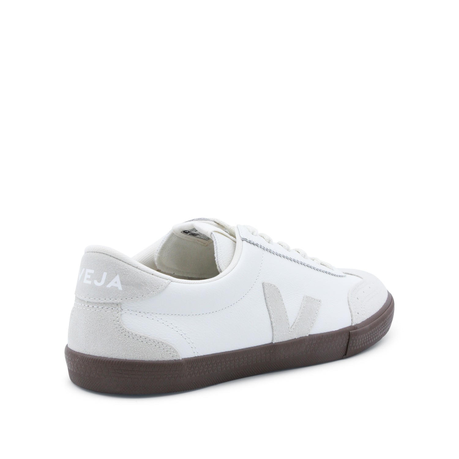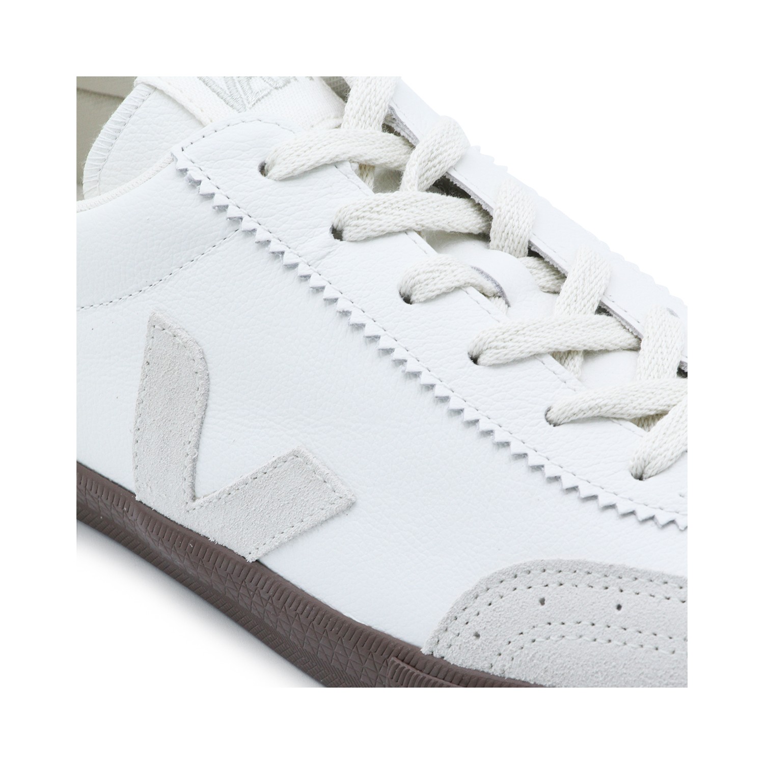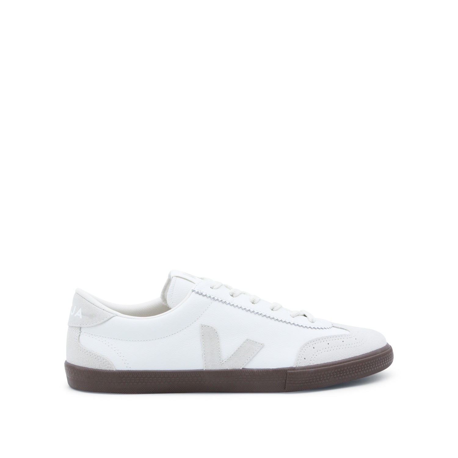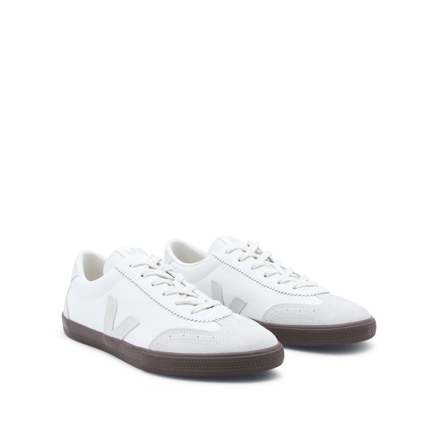 White and natural Volley sneakers from Veja featuring contrasted rubber sole, round toe, cotton laces, branded insole and V detail at side.