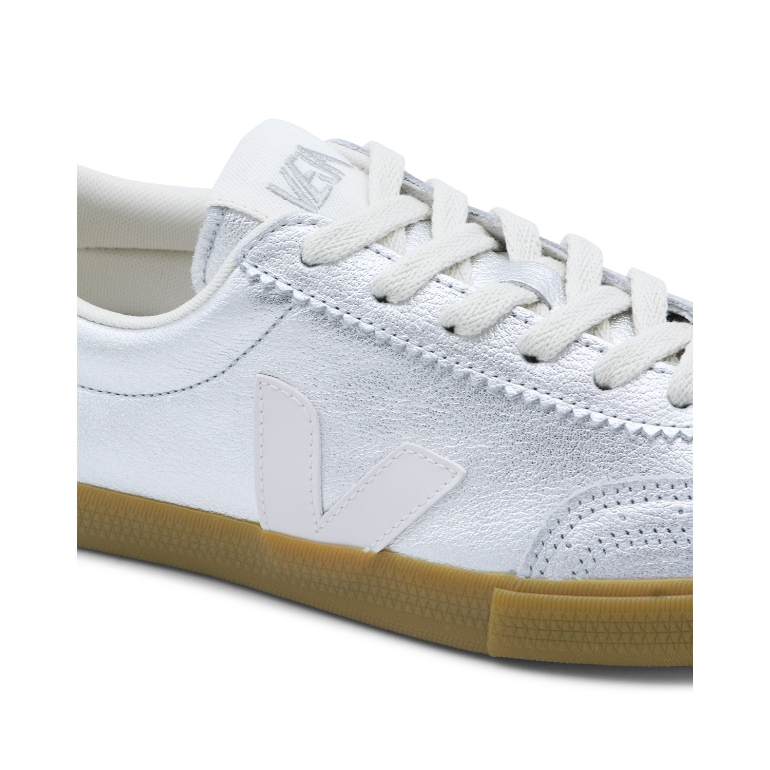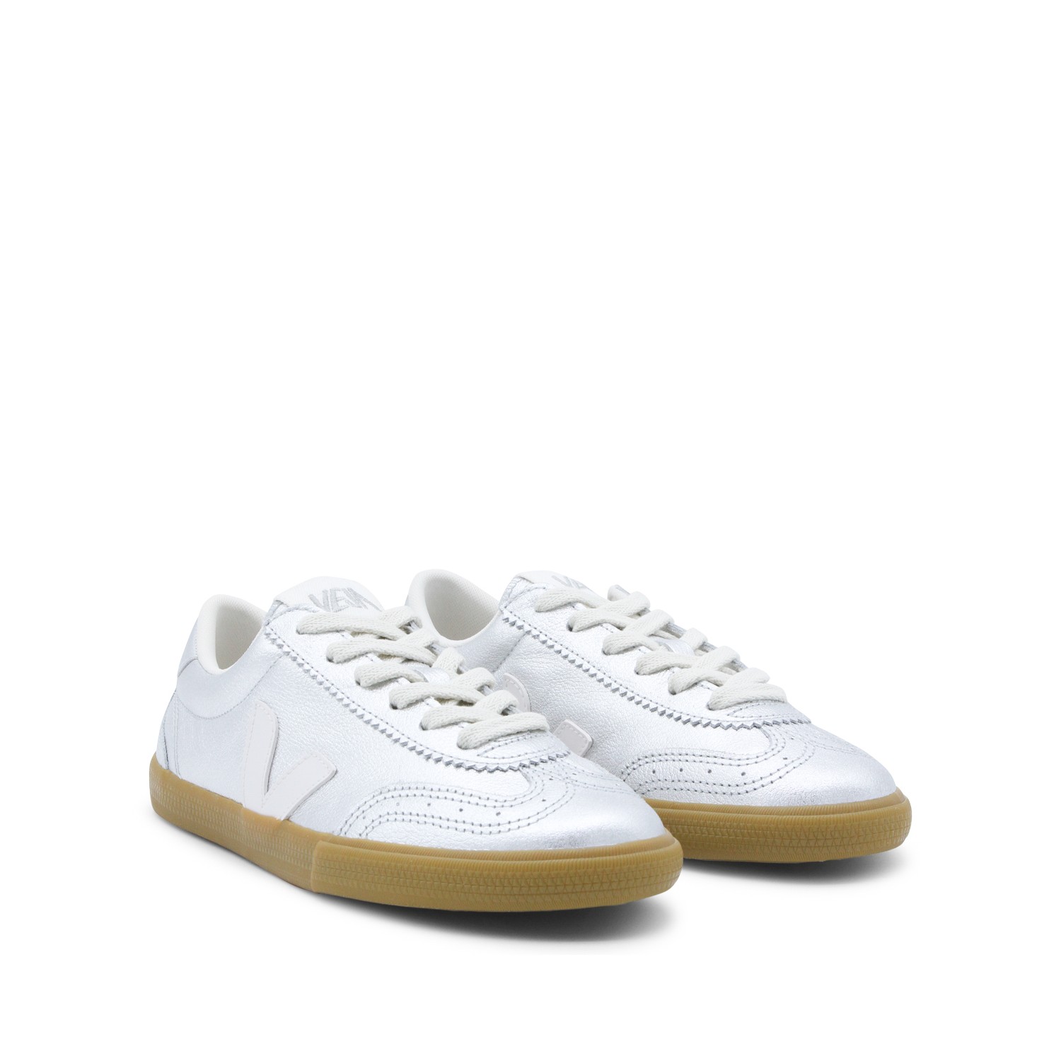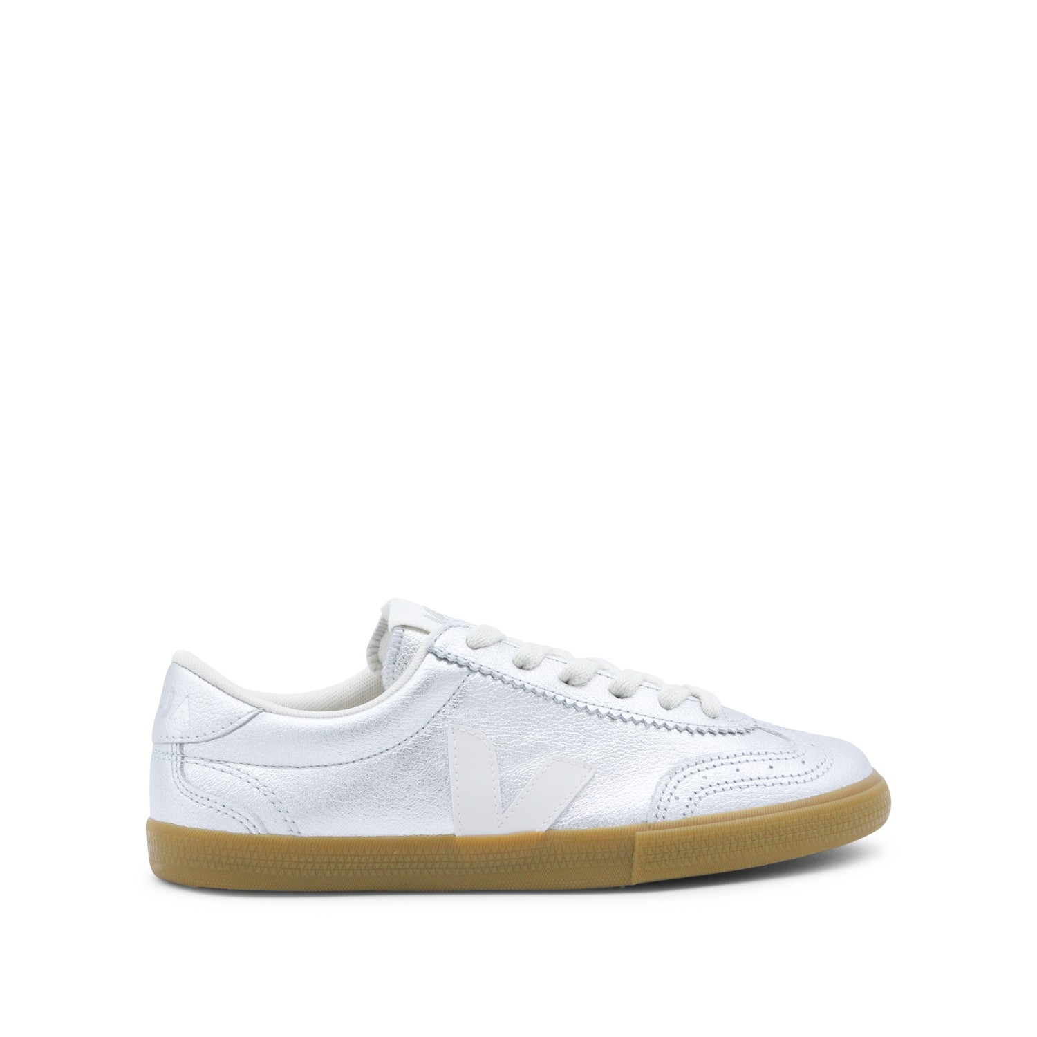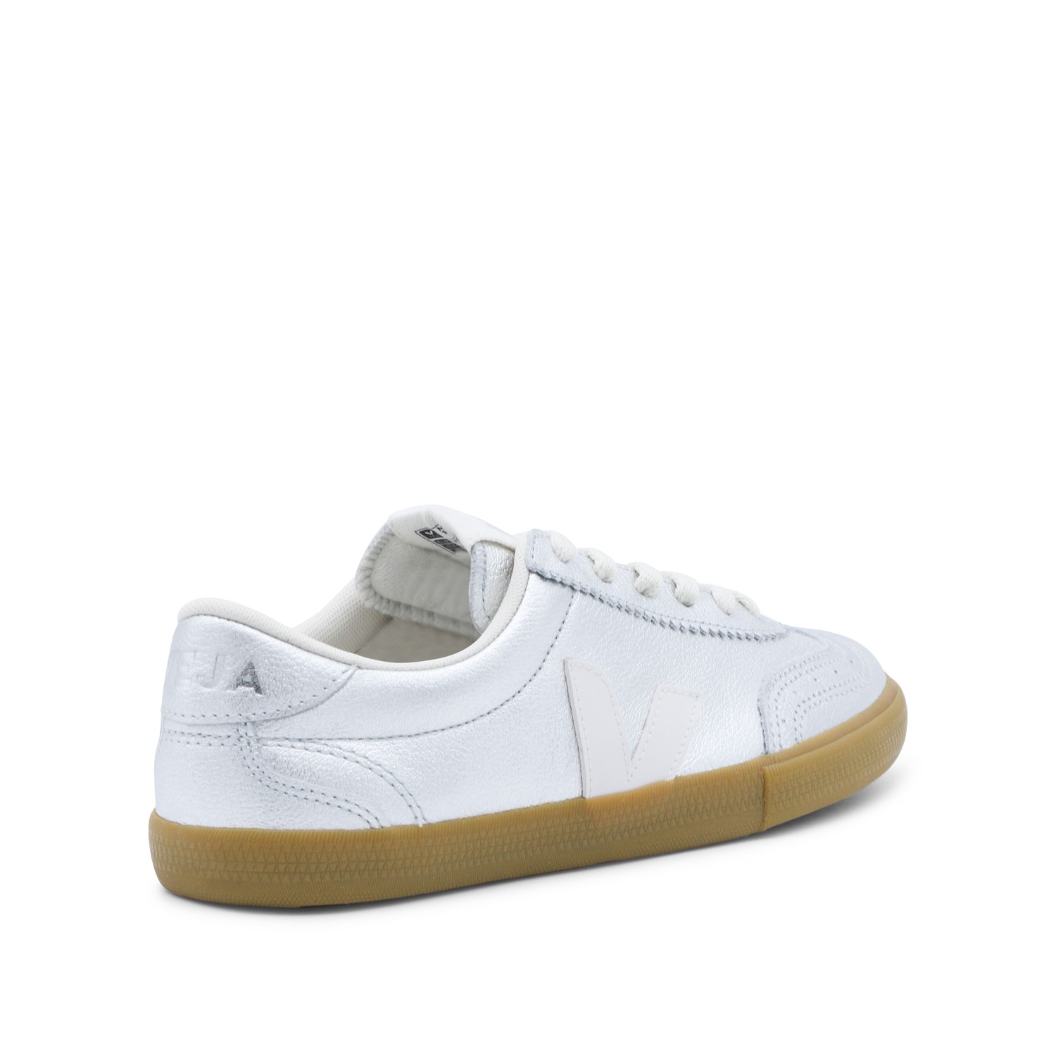 Silver Volley sneakers from Veja featuring contrasted rubber sole, round toe, cotton laces, branded insole and V detail at side.