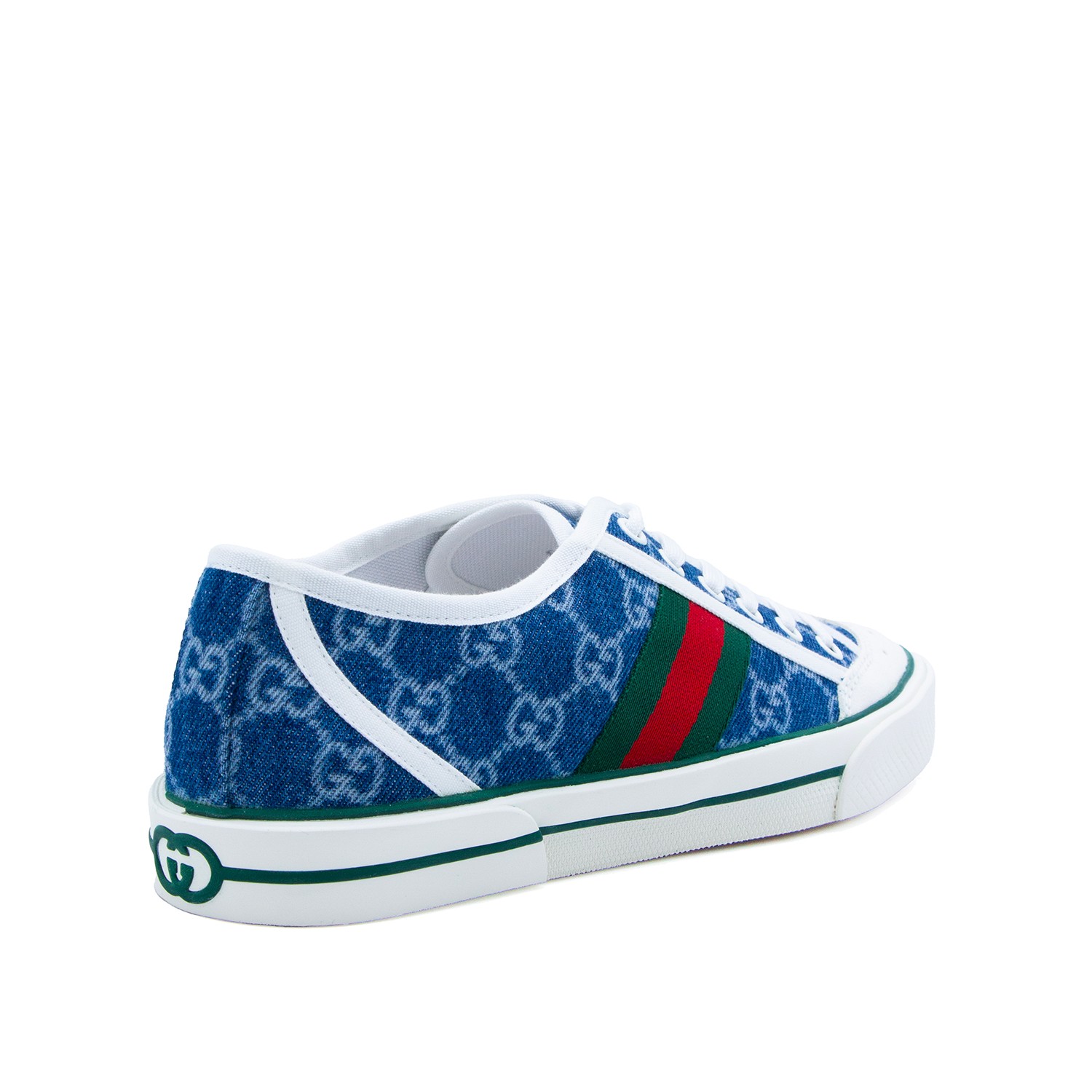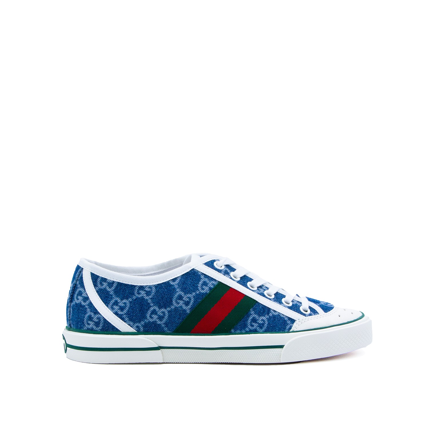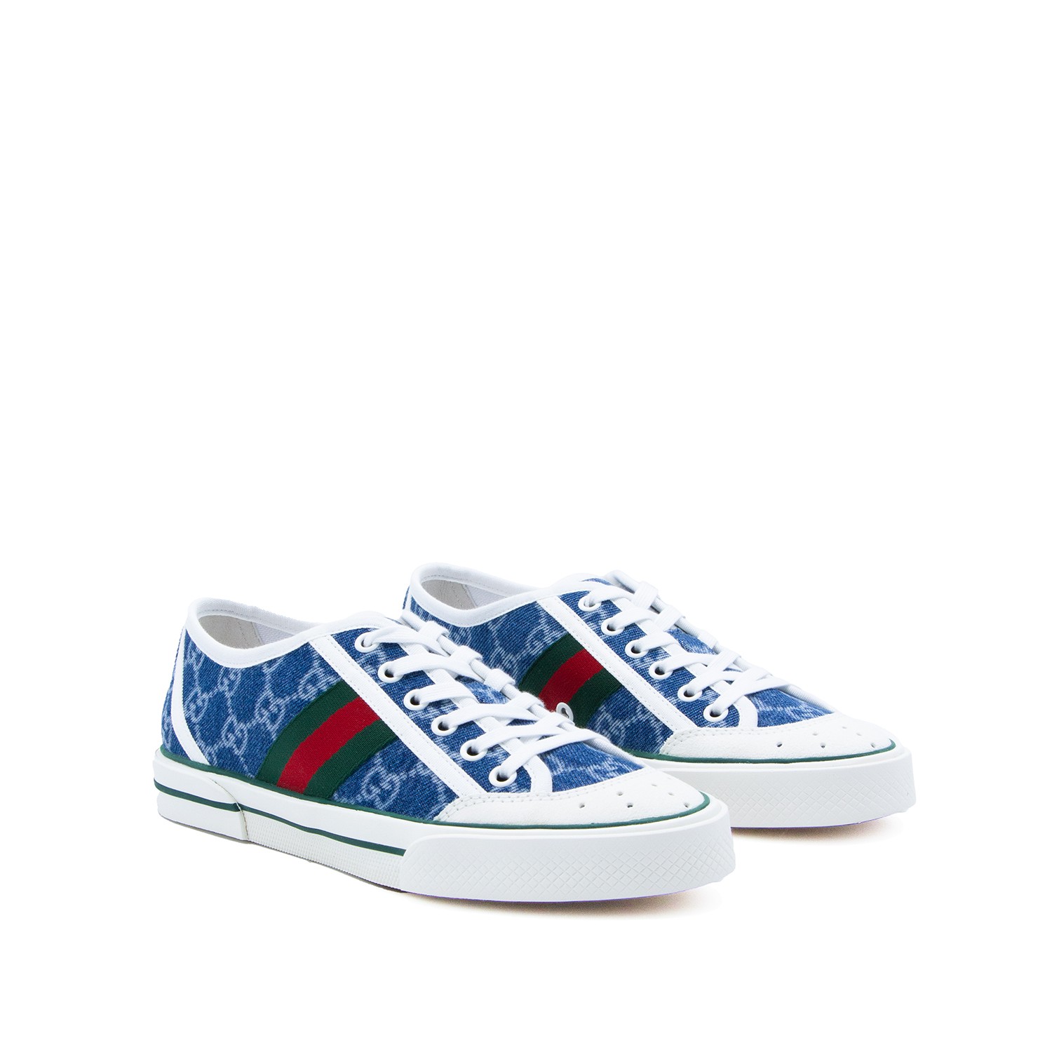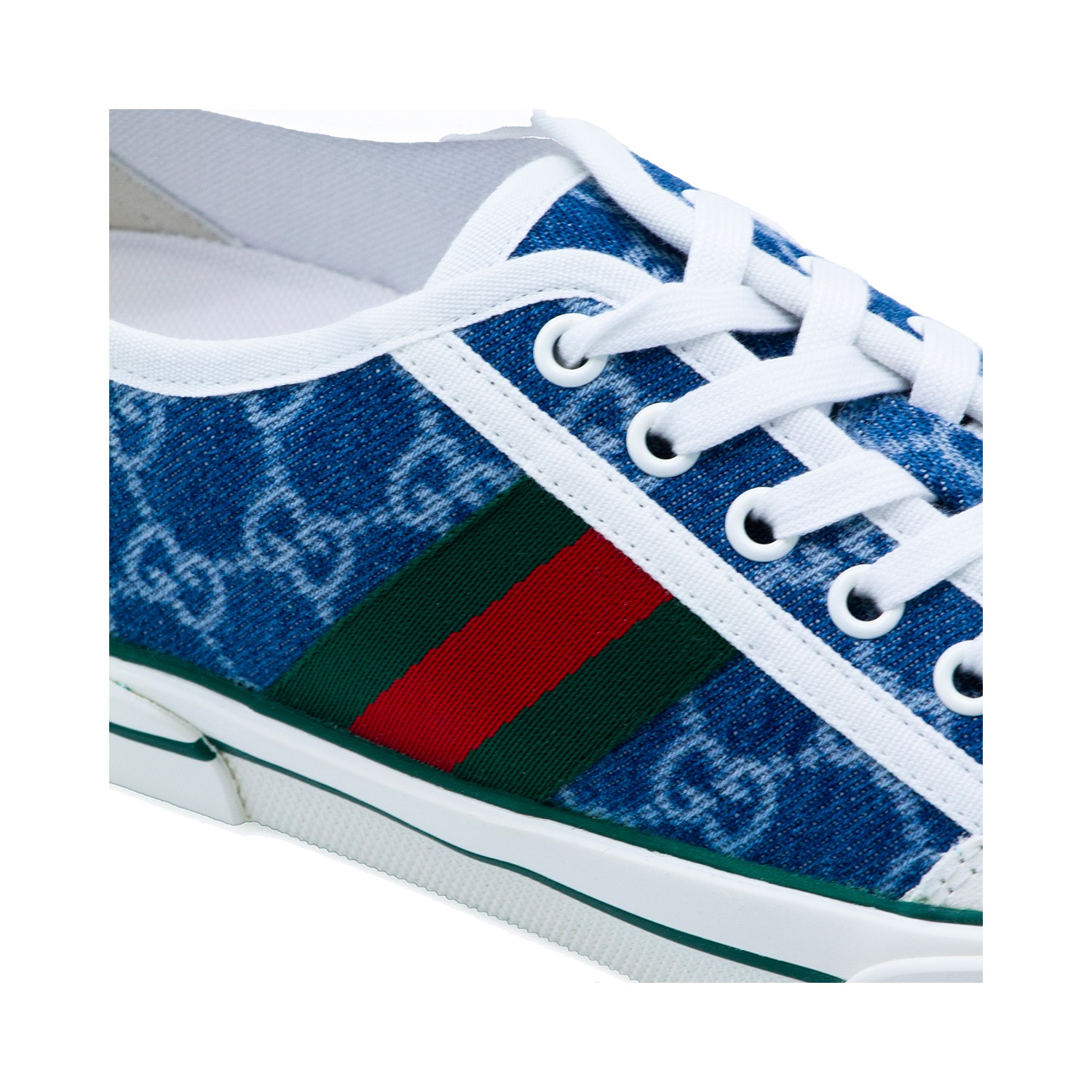 White and blue leather sneakers from Gucci featuring round toe, laces fastening and logo pattern.