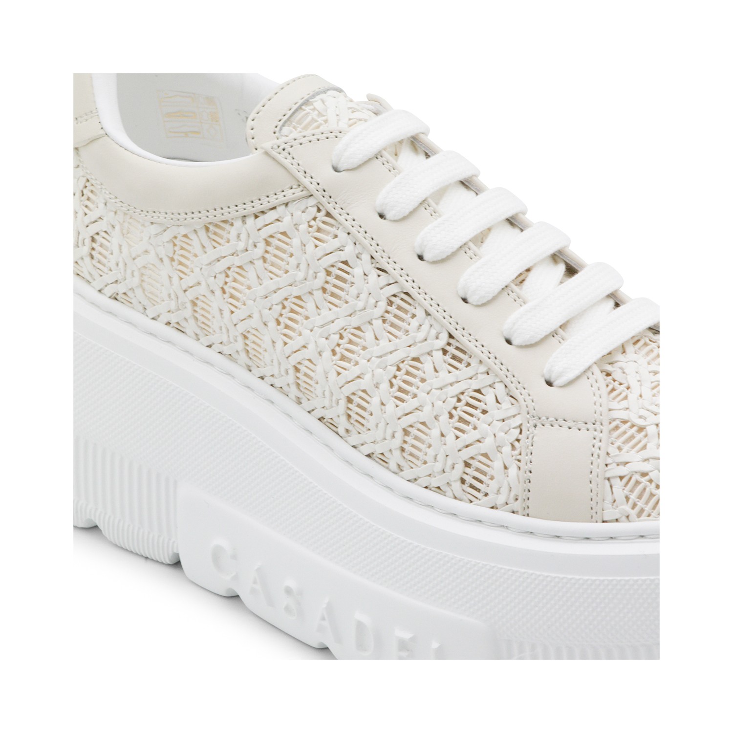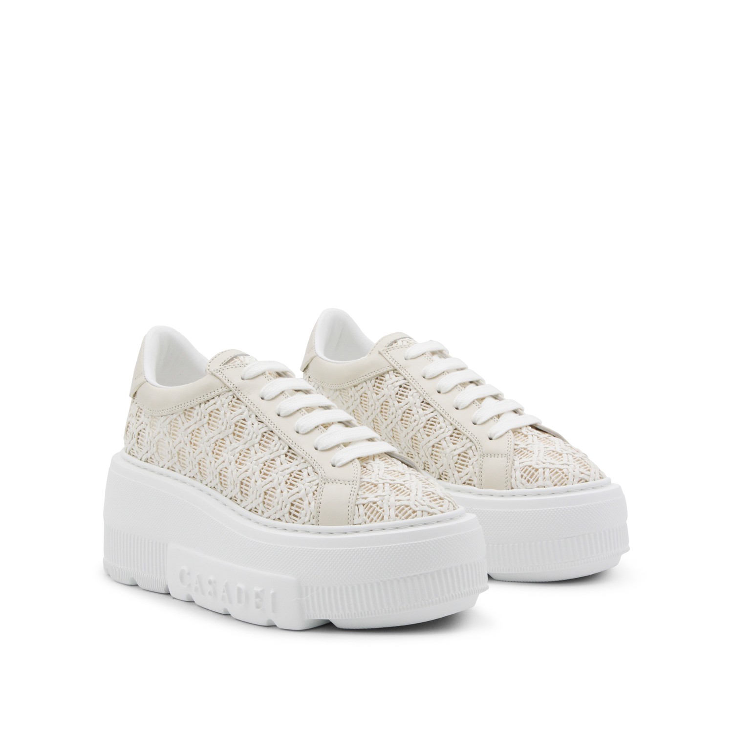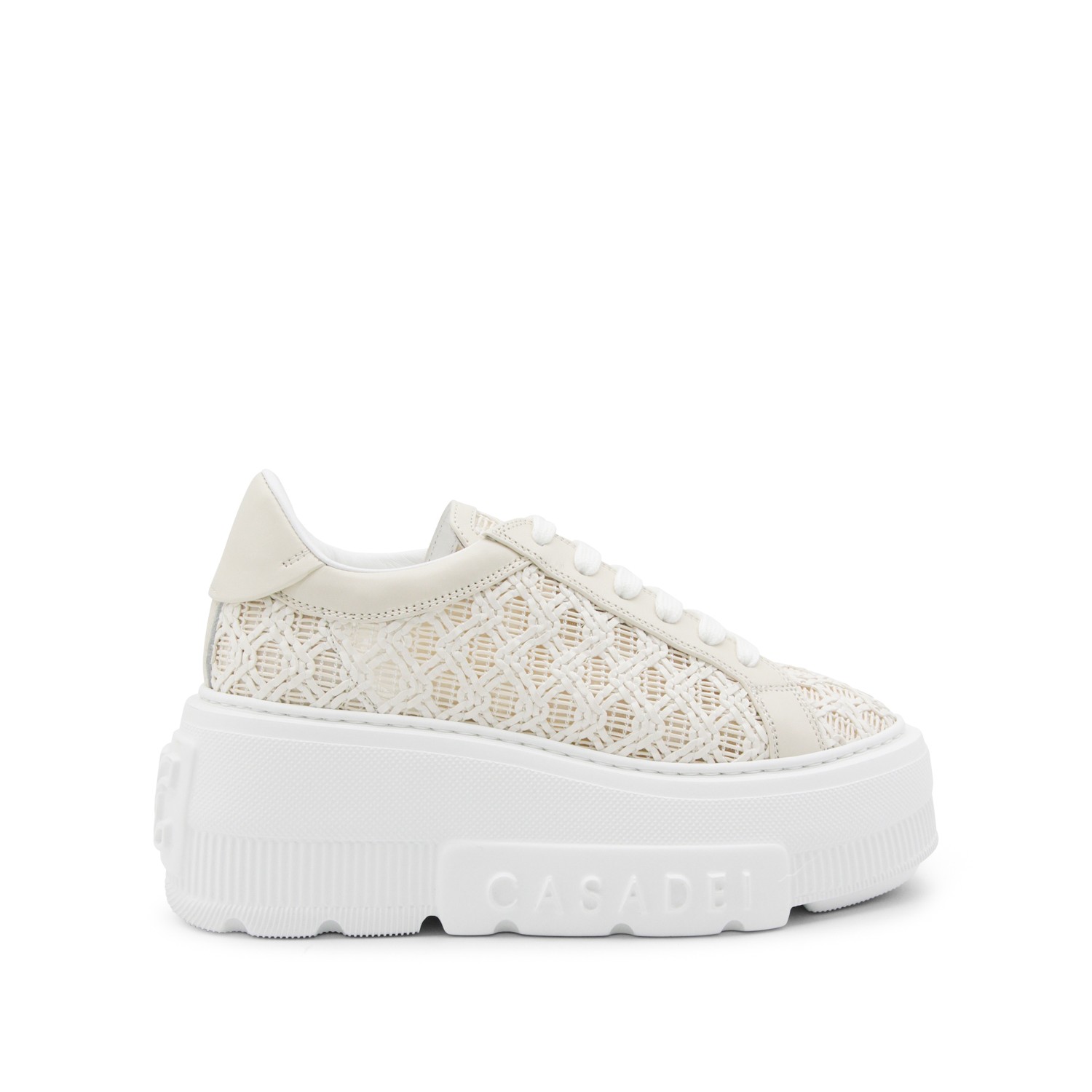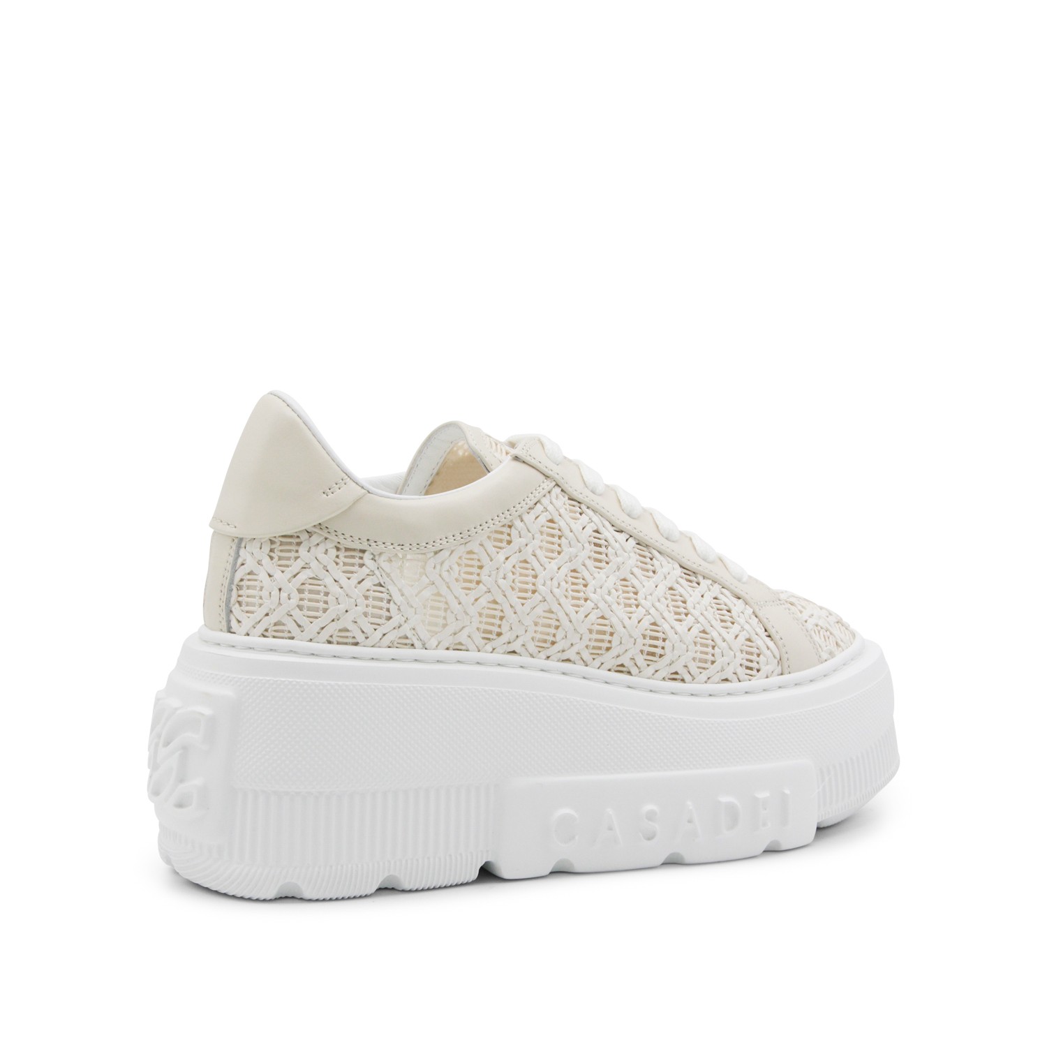 Beige leather sneakers from Casadei featuring round toe, laces fastening, mesh details, embossed logo on the sole, branded insole and platform.
