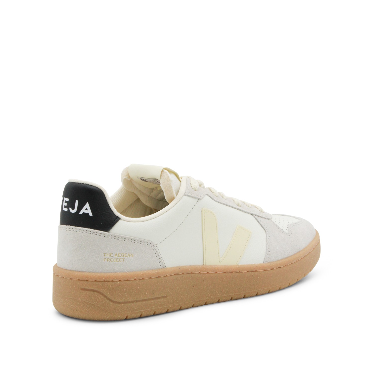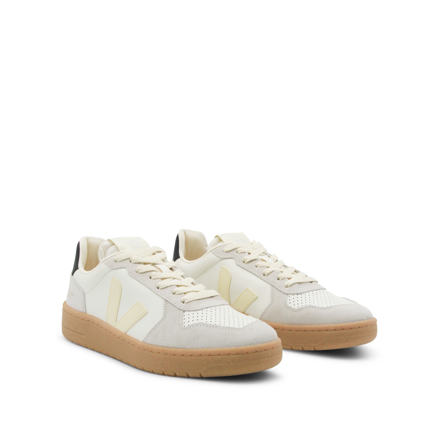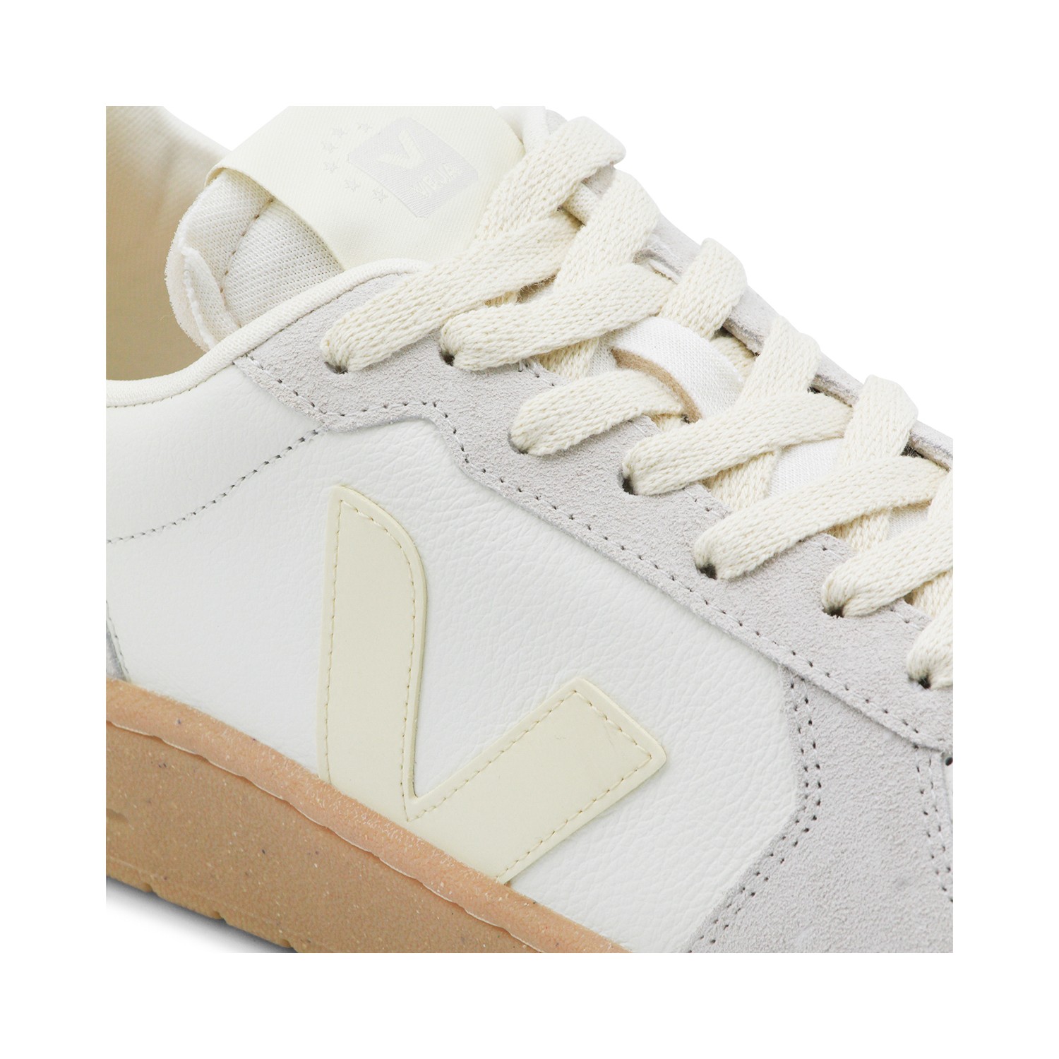 White and beige leather V-82 sneakers from Veja featuring round toe, laces fastening, paneled design, contrasting heel counter with logo and flat rubber sole.