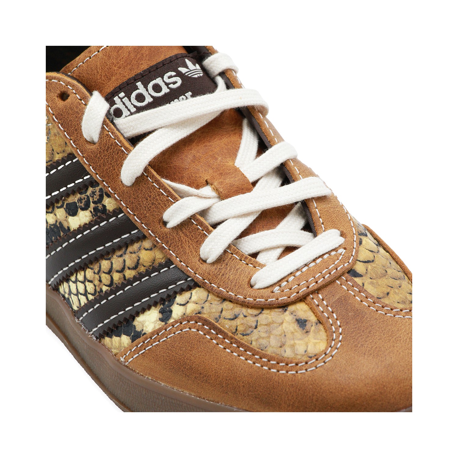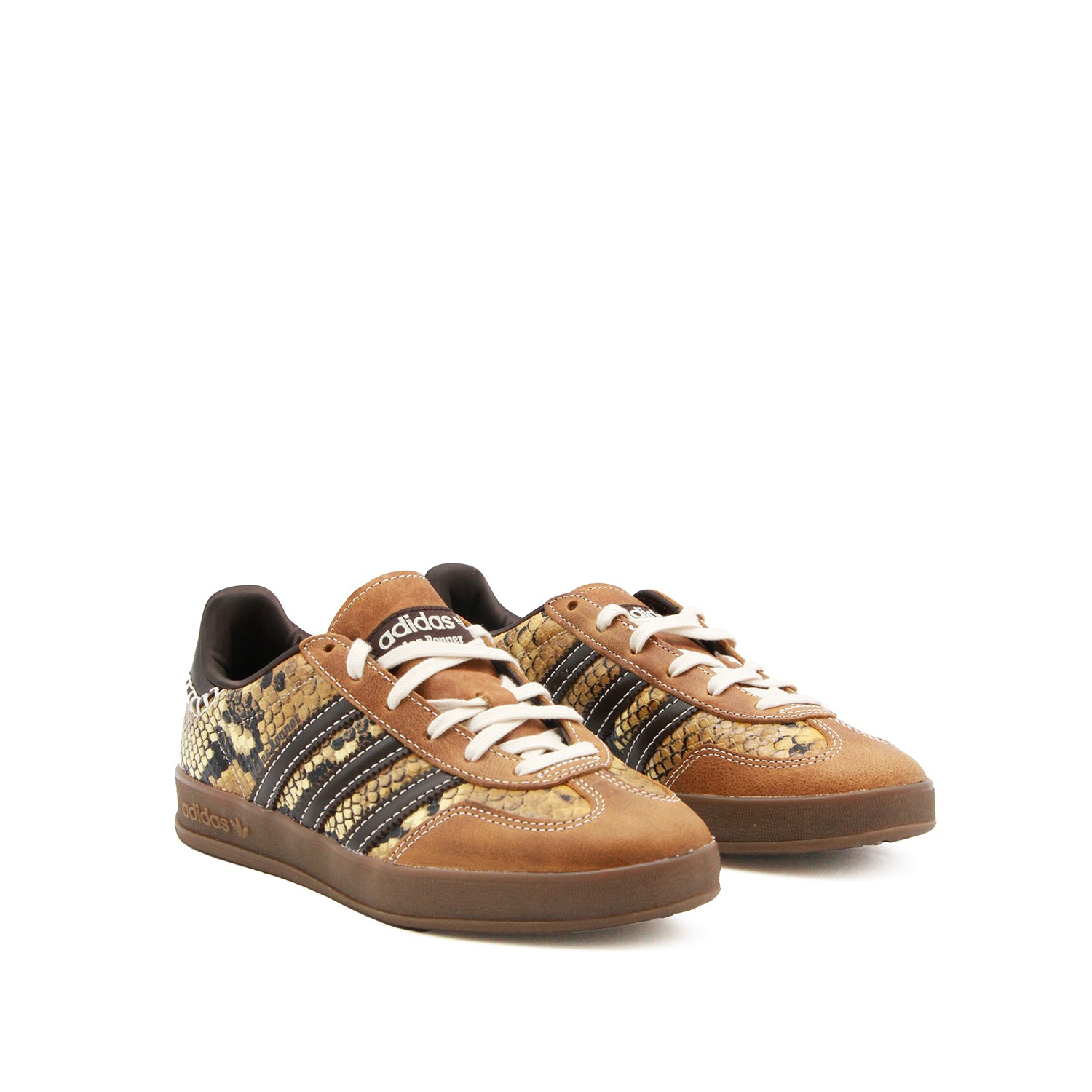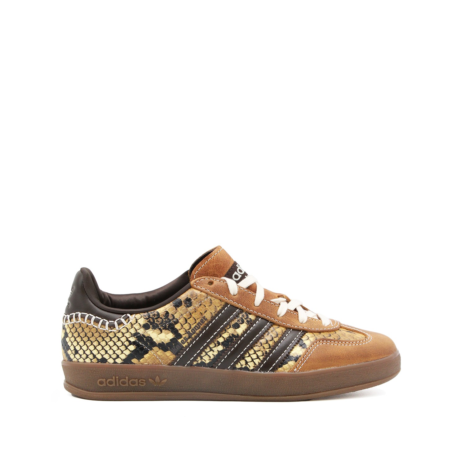 Brown and yellow leather Gazelle Snake sneakers from Adidas By Wales Bonner featuring round toe, snake pattern, laces fastening, stripes at side, branded insole and flat rubber sole.