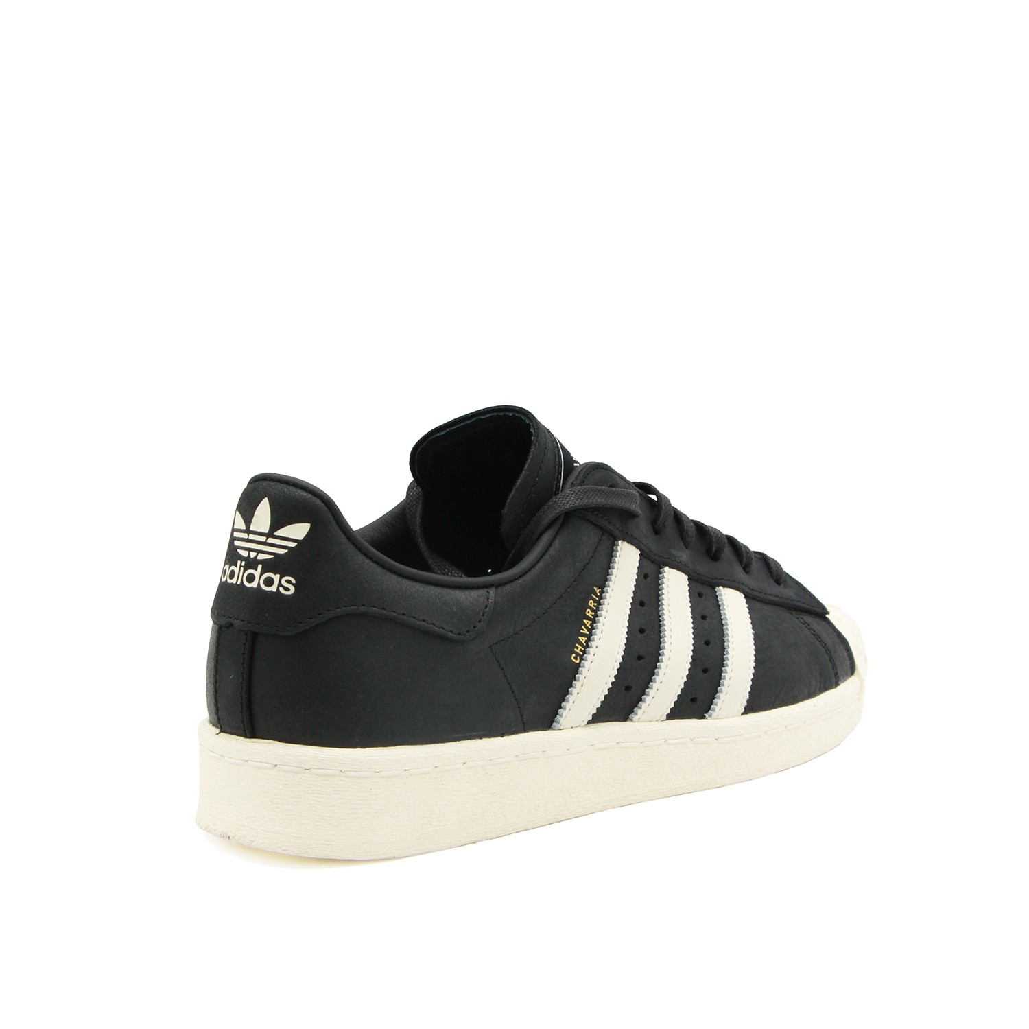 Black and white leather Superstar from Adidas X Willy Chavarria featuring round toe, laces fastening, Stripes to the side, logo, branded tongue and rubber sole.