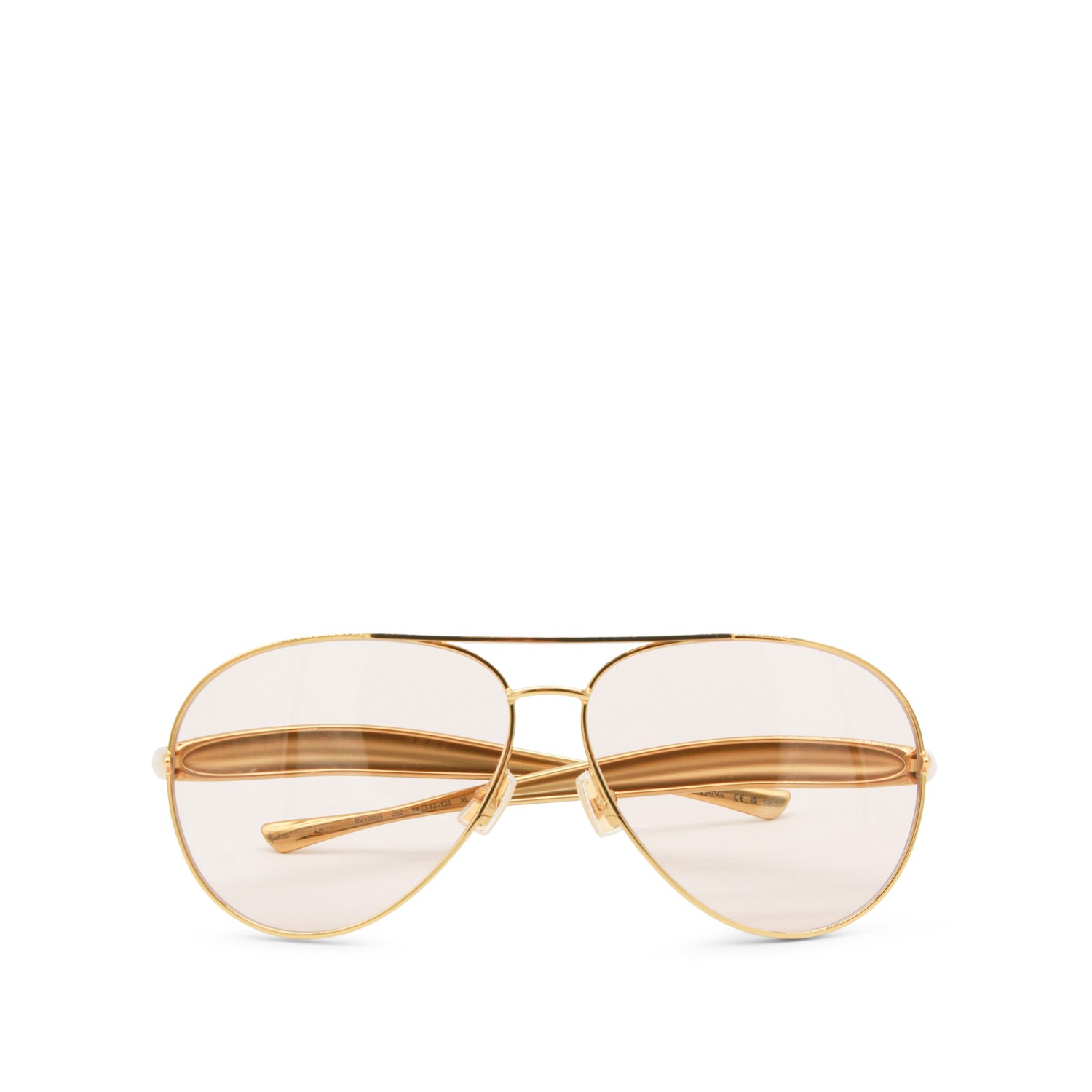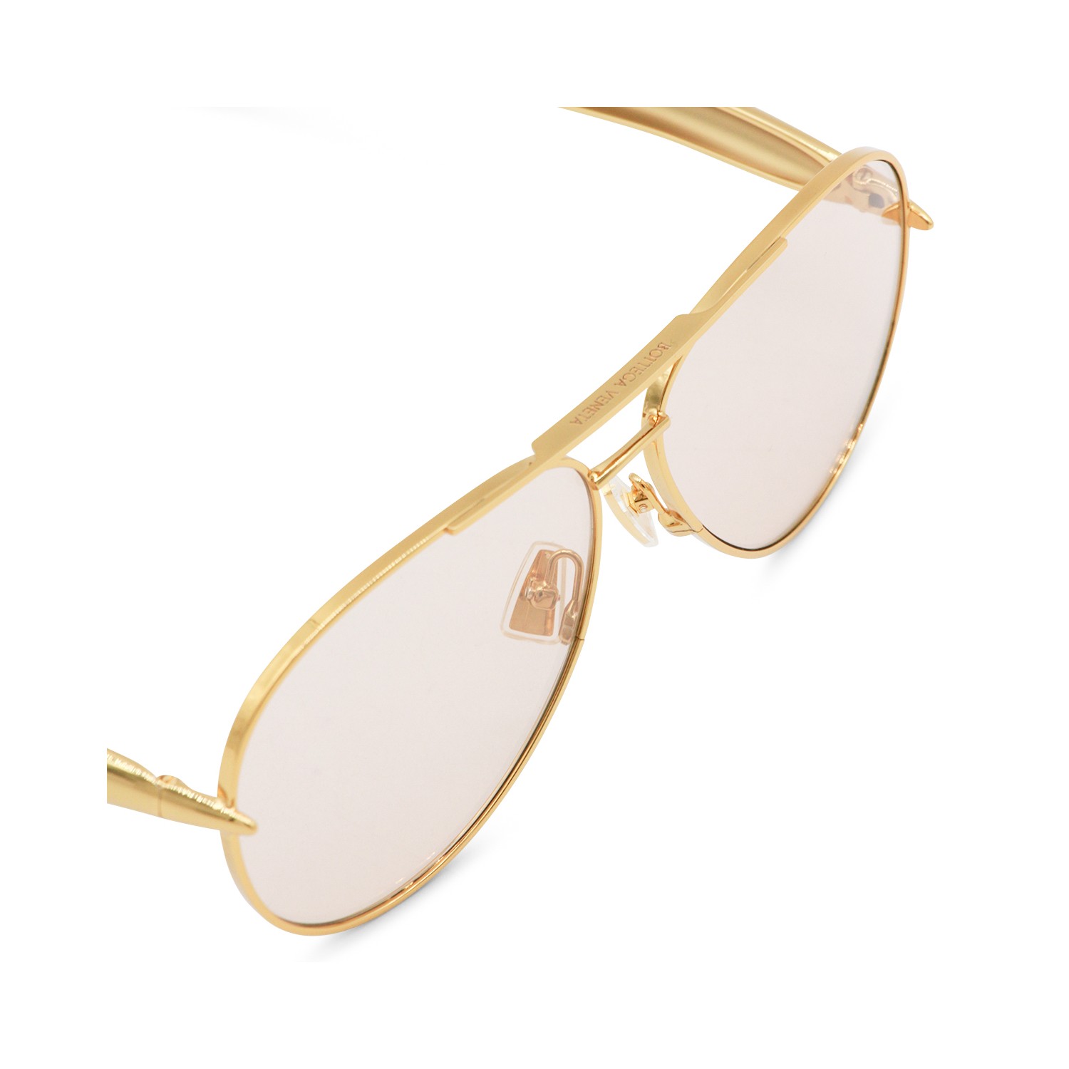 Gold and brown metal sunglass from Bottega Veneta featuring aviator style, sardine-shaped metal temples and gradient lenses.