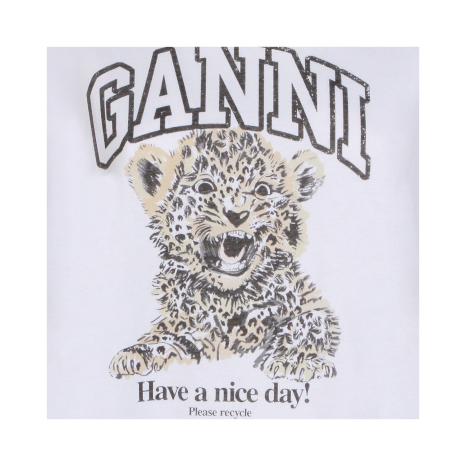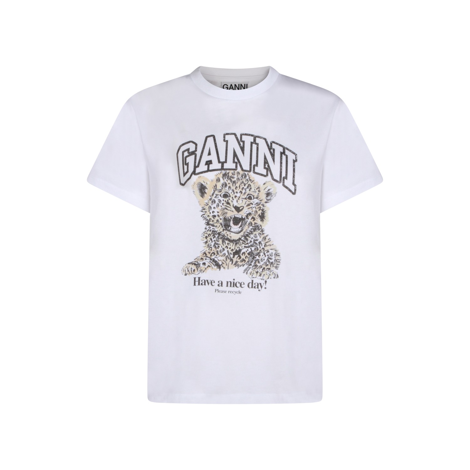 White cotton t-shirt from Ganni featuring crew neckline, short sleeves, frontal stamp and regular vestibility.