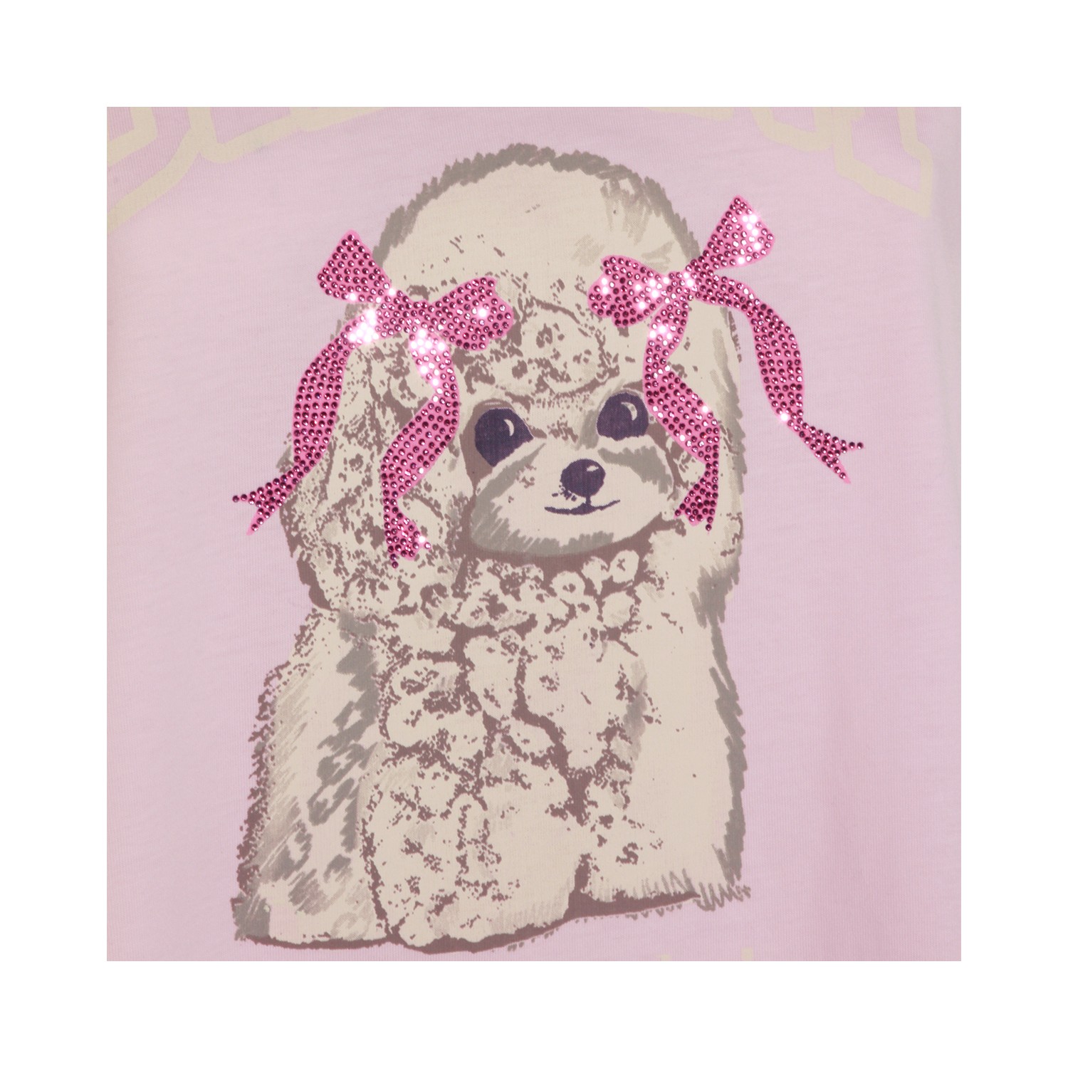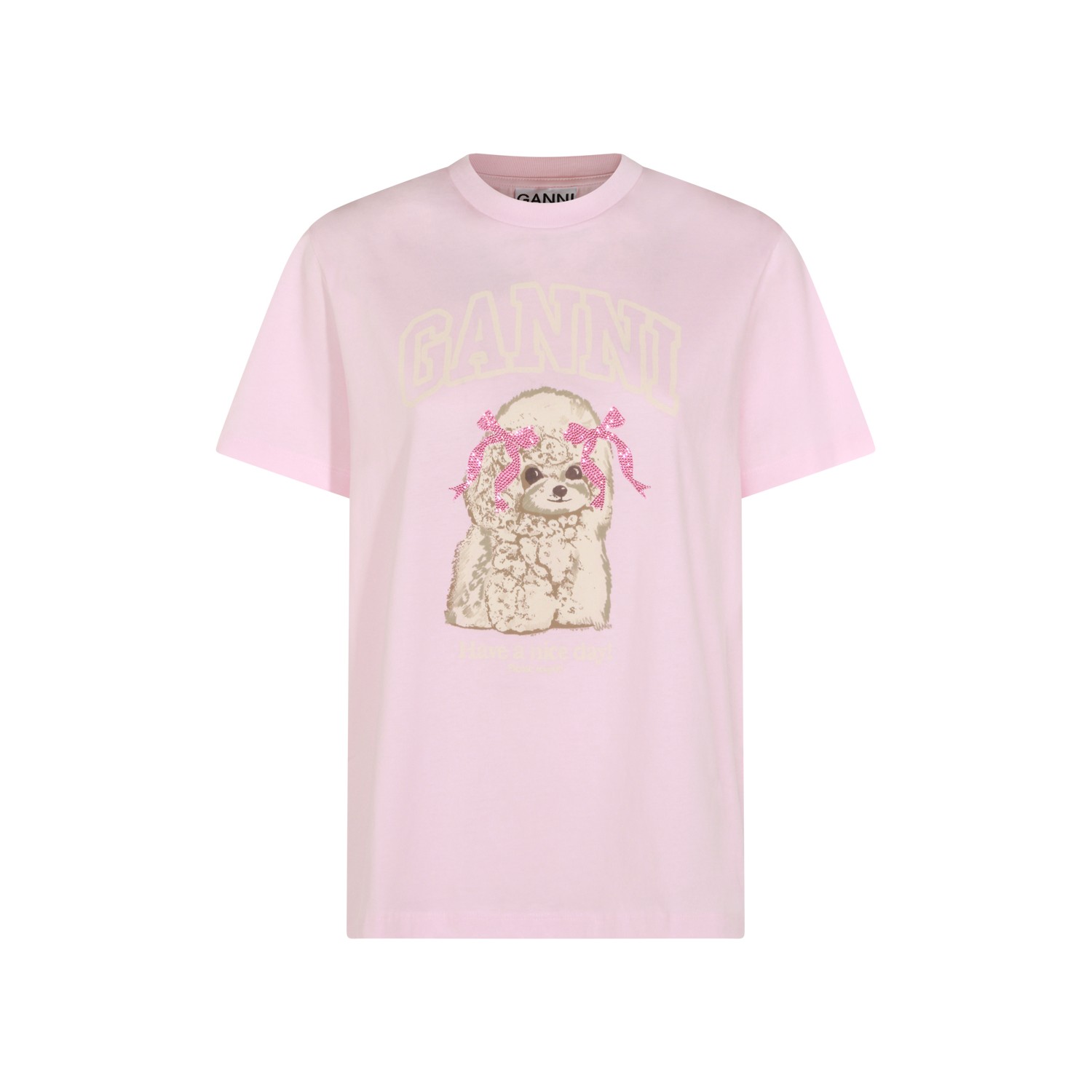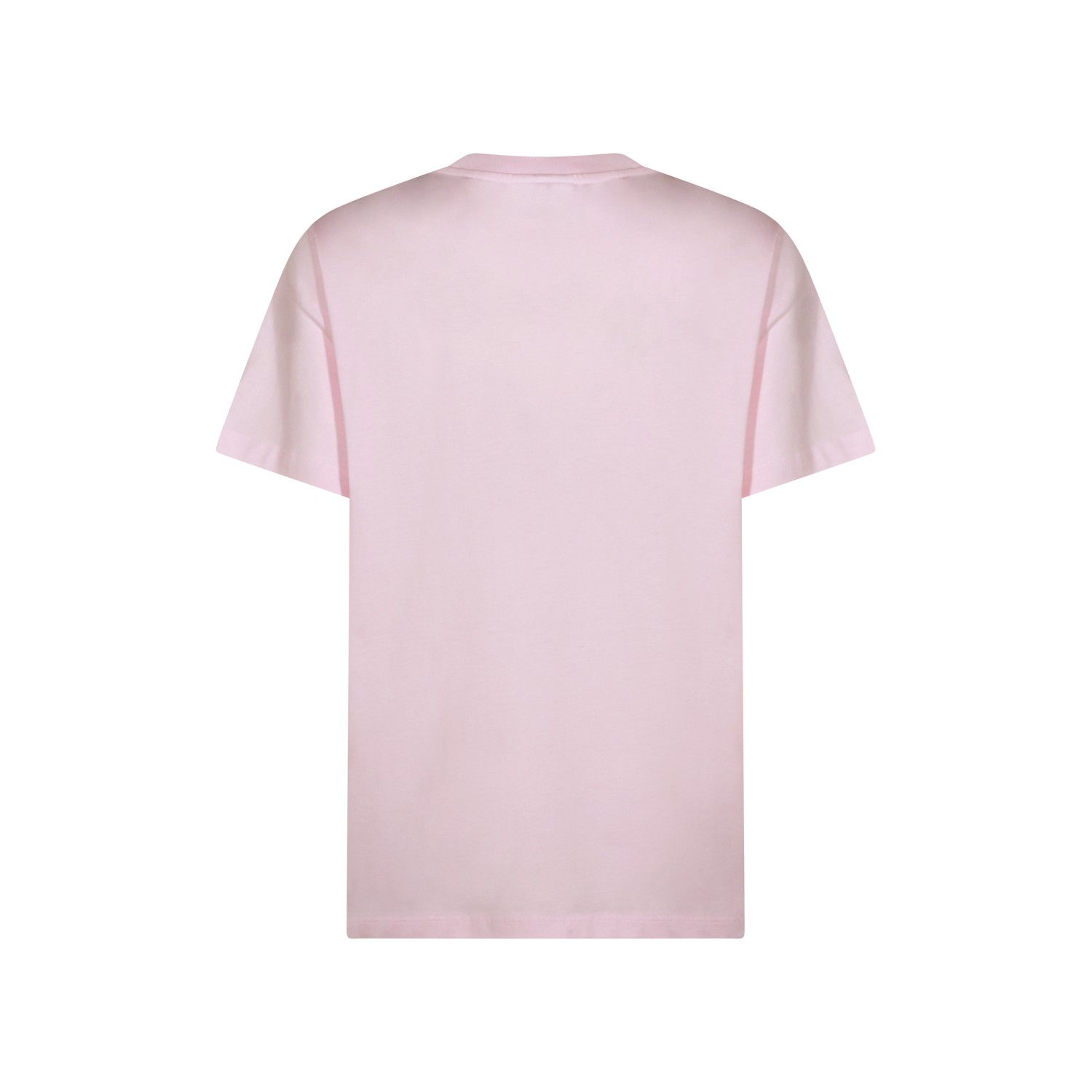 Chalk pink cotton t-shirt from Ganni featuring crew neckline, short sleeves, frontal stamp and regular vestibility.