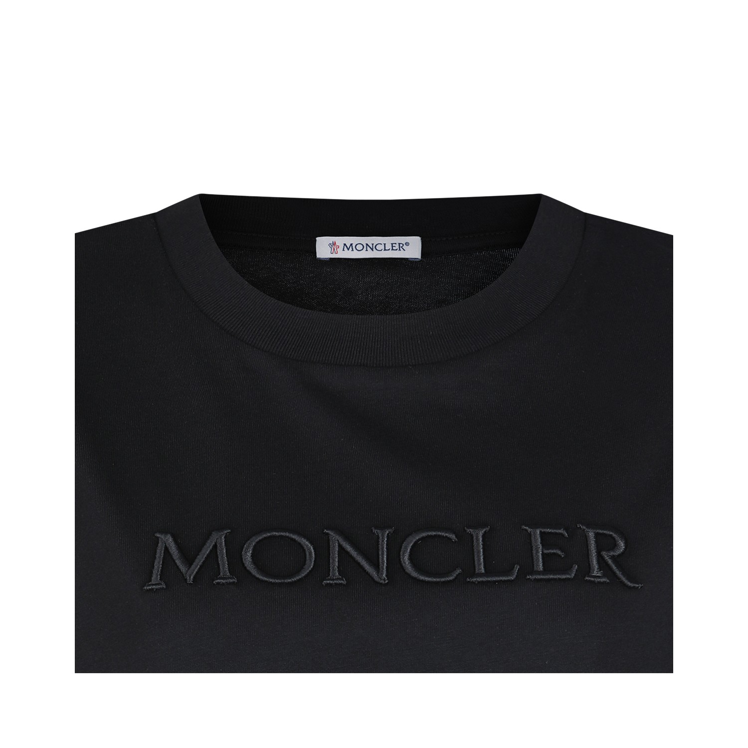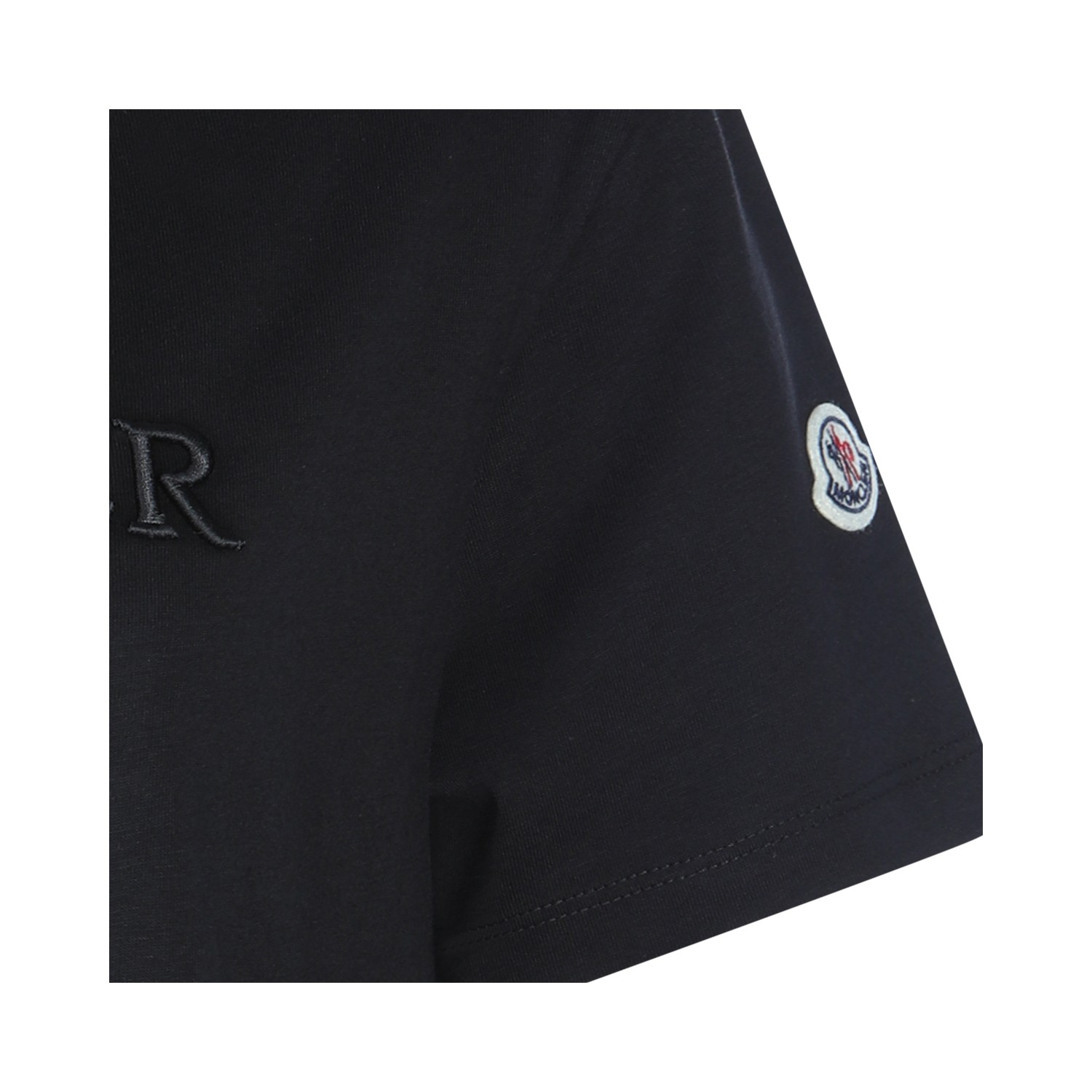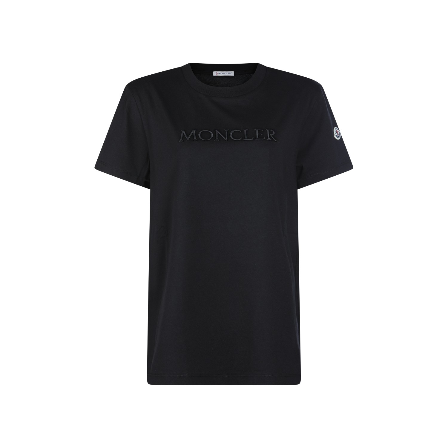 Black cotton t-shirt from Moncler featuring crew neck, short sleeves, lateral logo patch, frontal logo and regular vestibility.