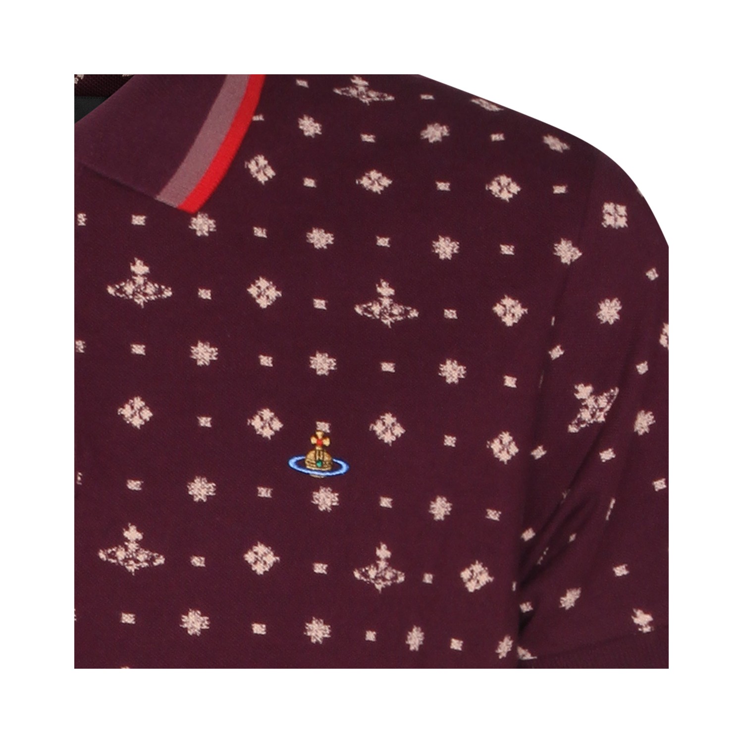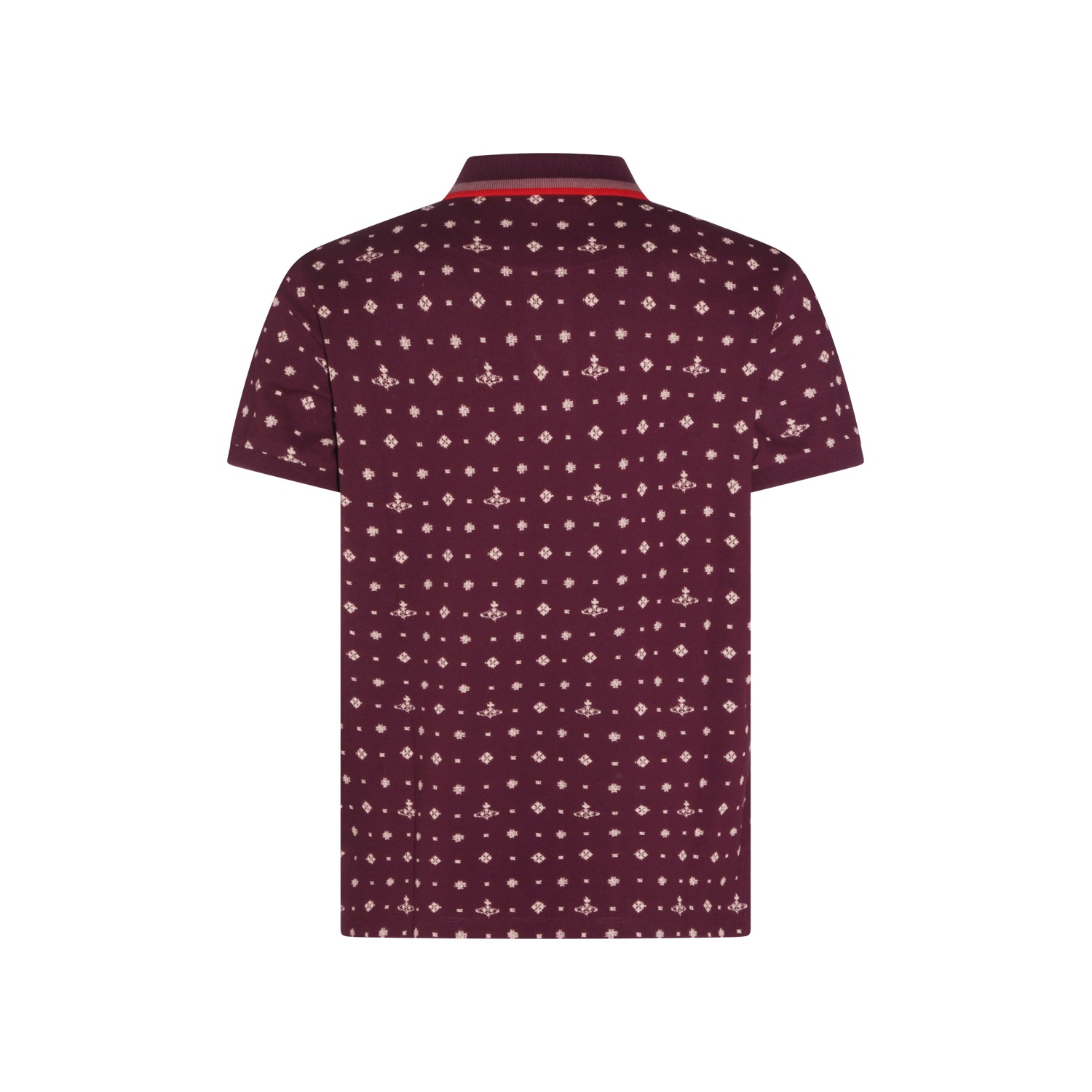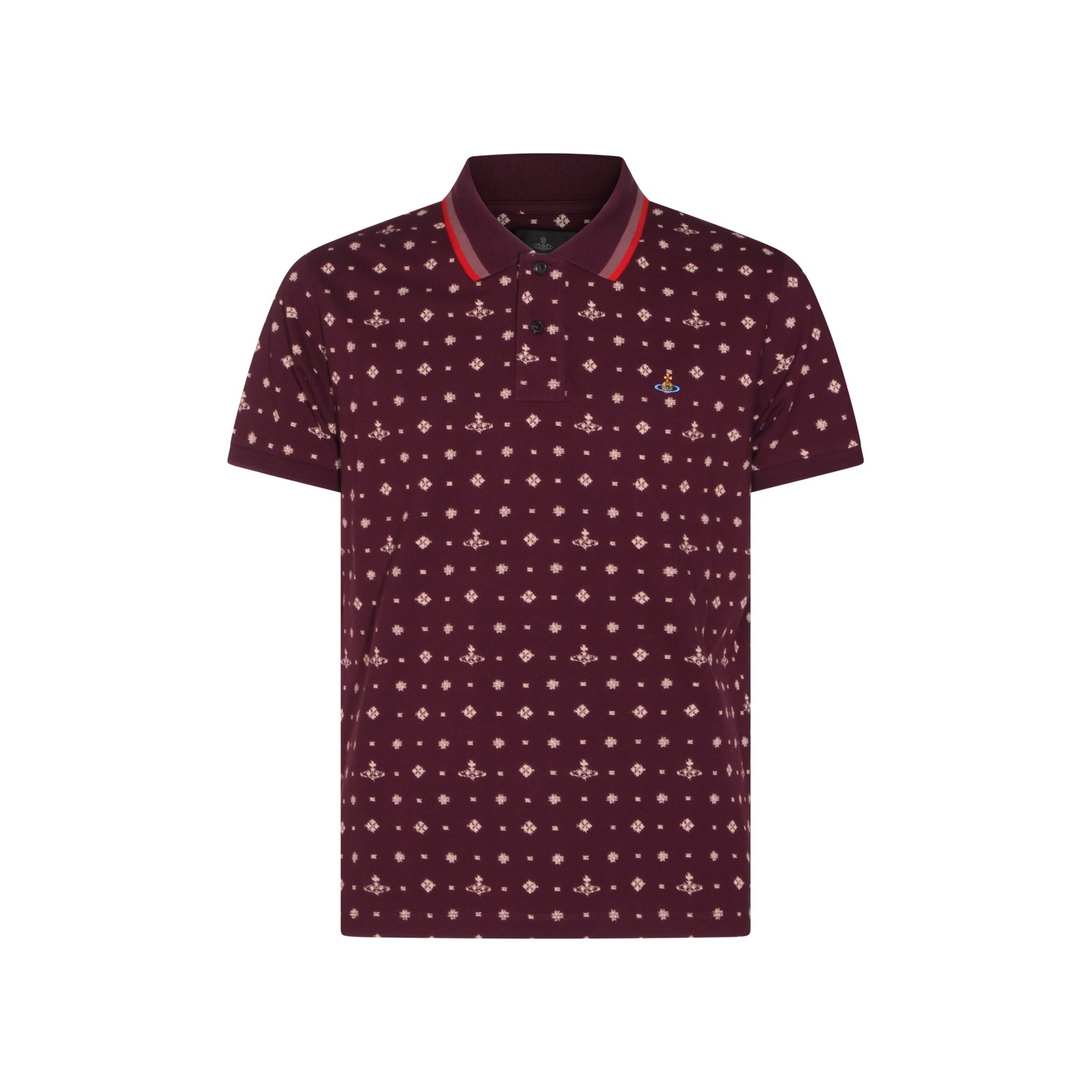 Burgundy cotton polo shirt from Vivienne Westwood featuring classic polo shirt collar, short sleeves, all over Orb pattern and regular fit.