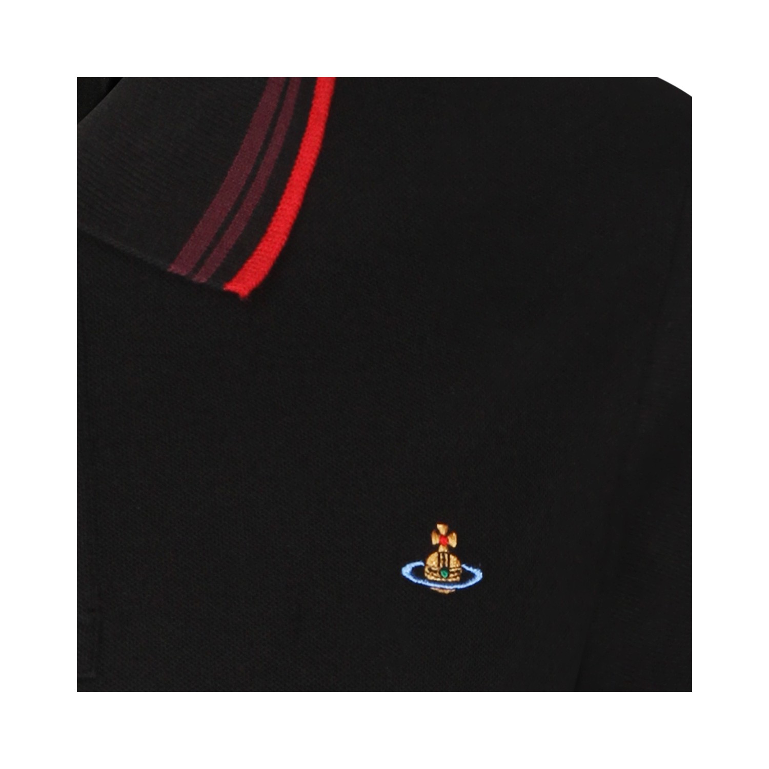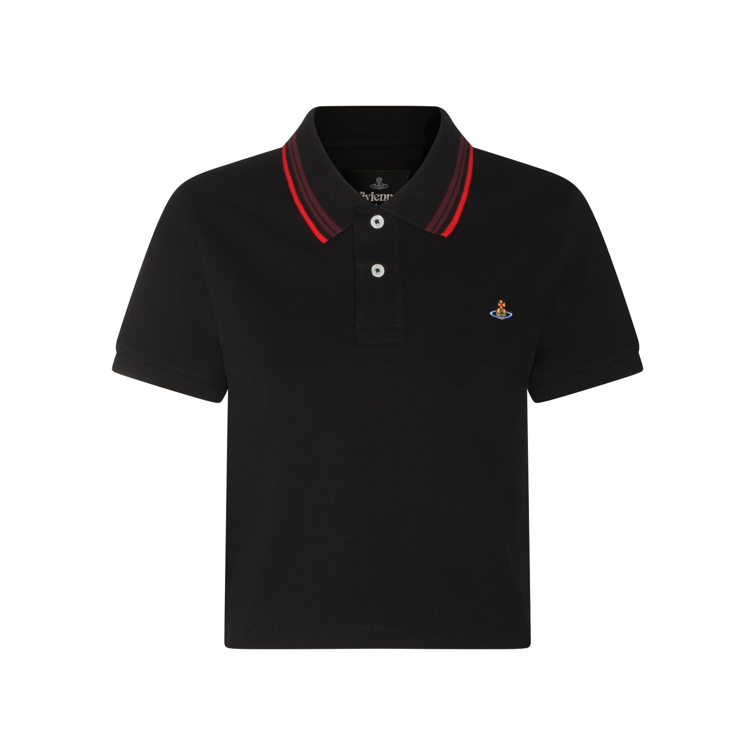 Black cotton polo shirt from Vivienne Westwood featuring regular neck, buttons fastening, short sleeves, logo and short length.