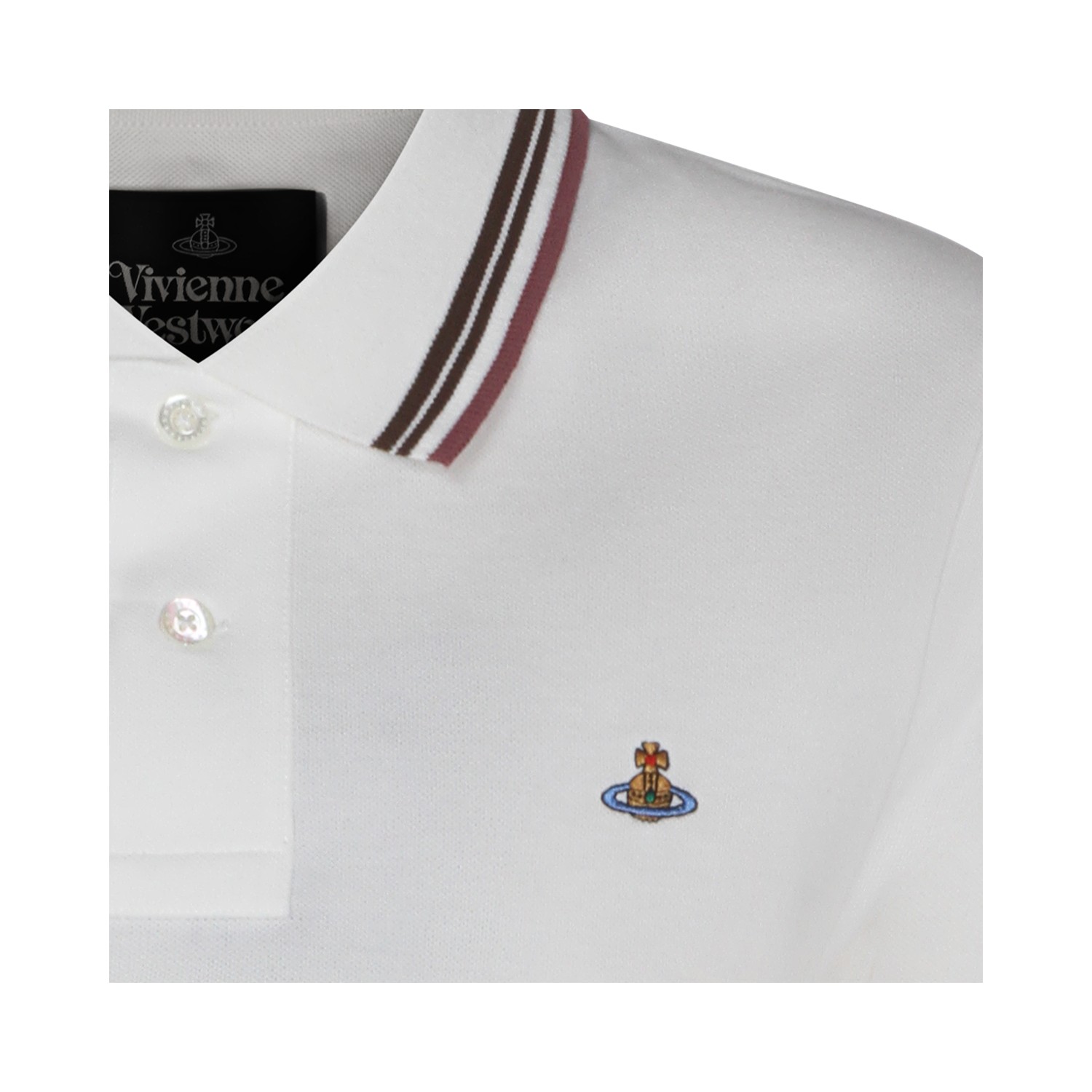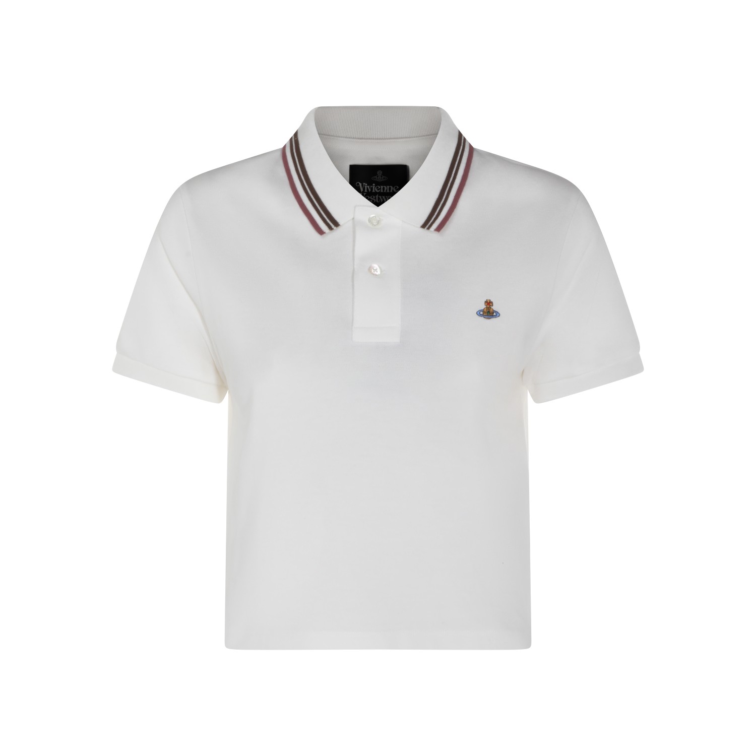 White cotton polo shirt from Vivienne Westwood featuring regular collar, buttons fastening, short sleeves, logo and short length.