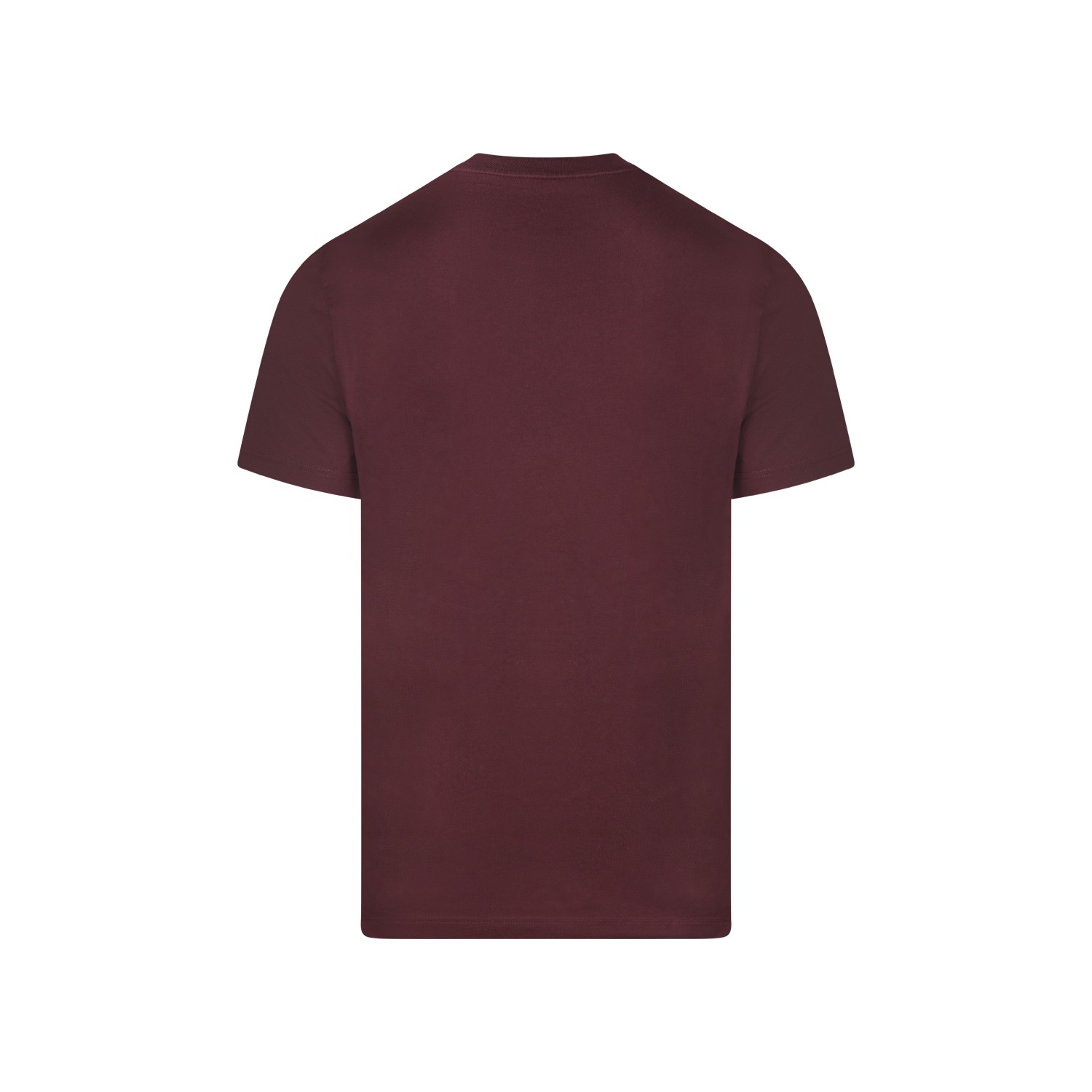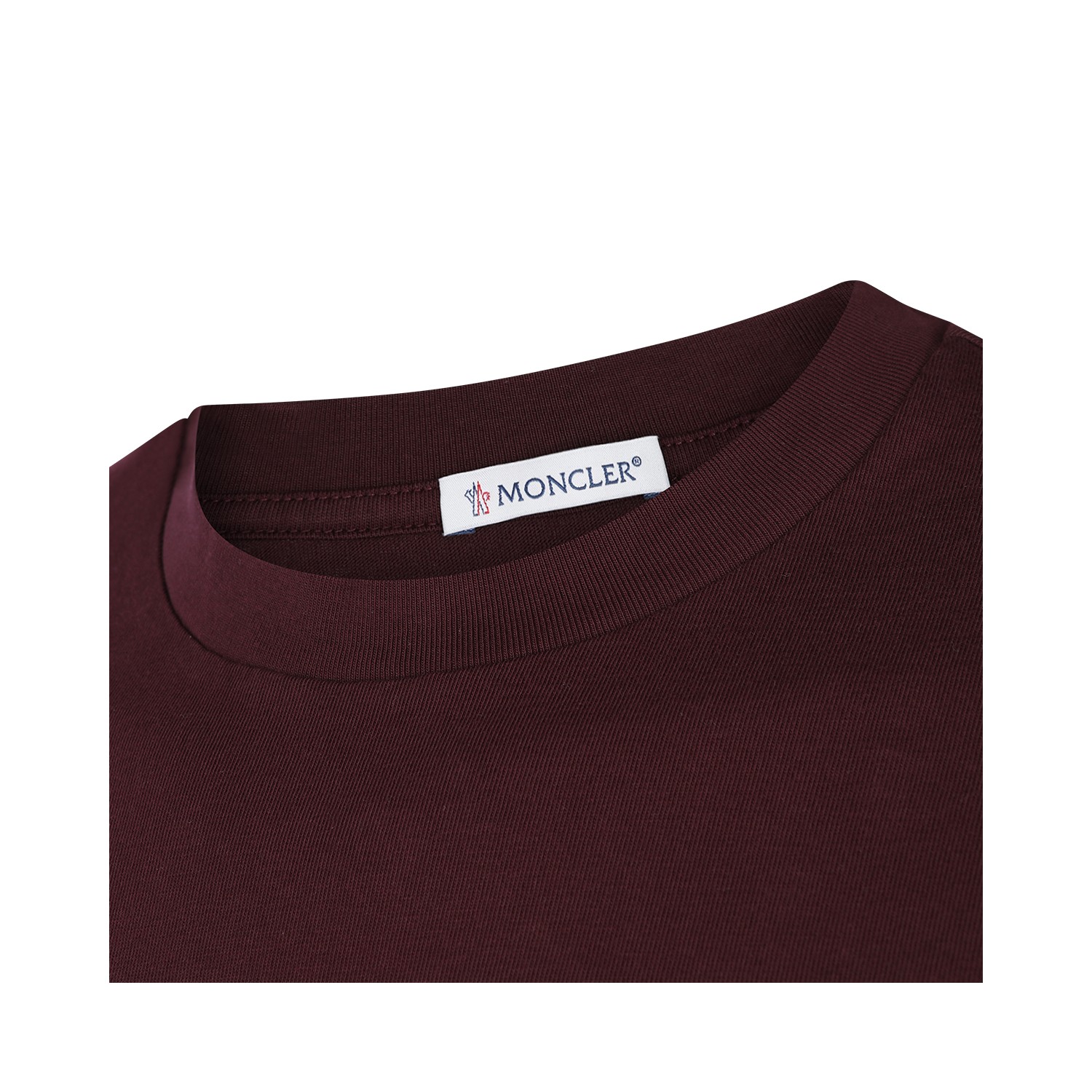 Bordeaux cotton t-shirt from Moncler featuring short sleeves, round collar, frontal logo, sleeve logo patch and regular vestibility.