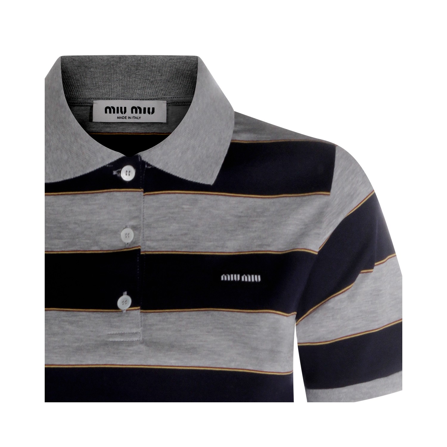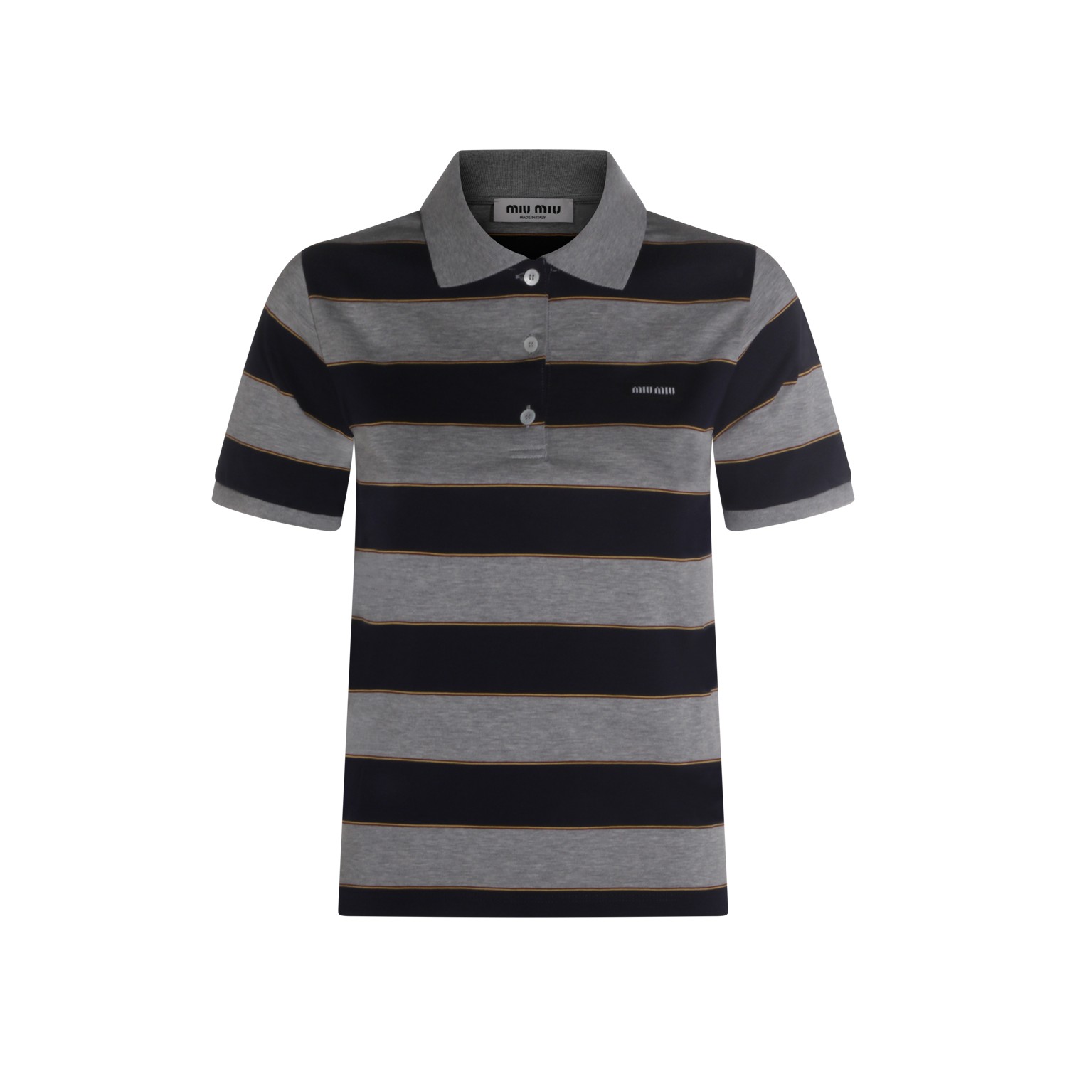 Blue and grey cotton stripe polo shirt from Miu Miu featuring all over stripe motif, short sleeves, half button closure, straight hem and embroidered logo detail at chest.