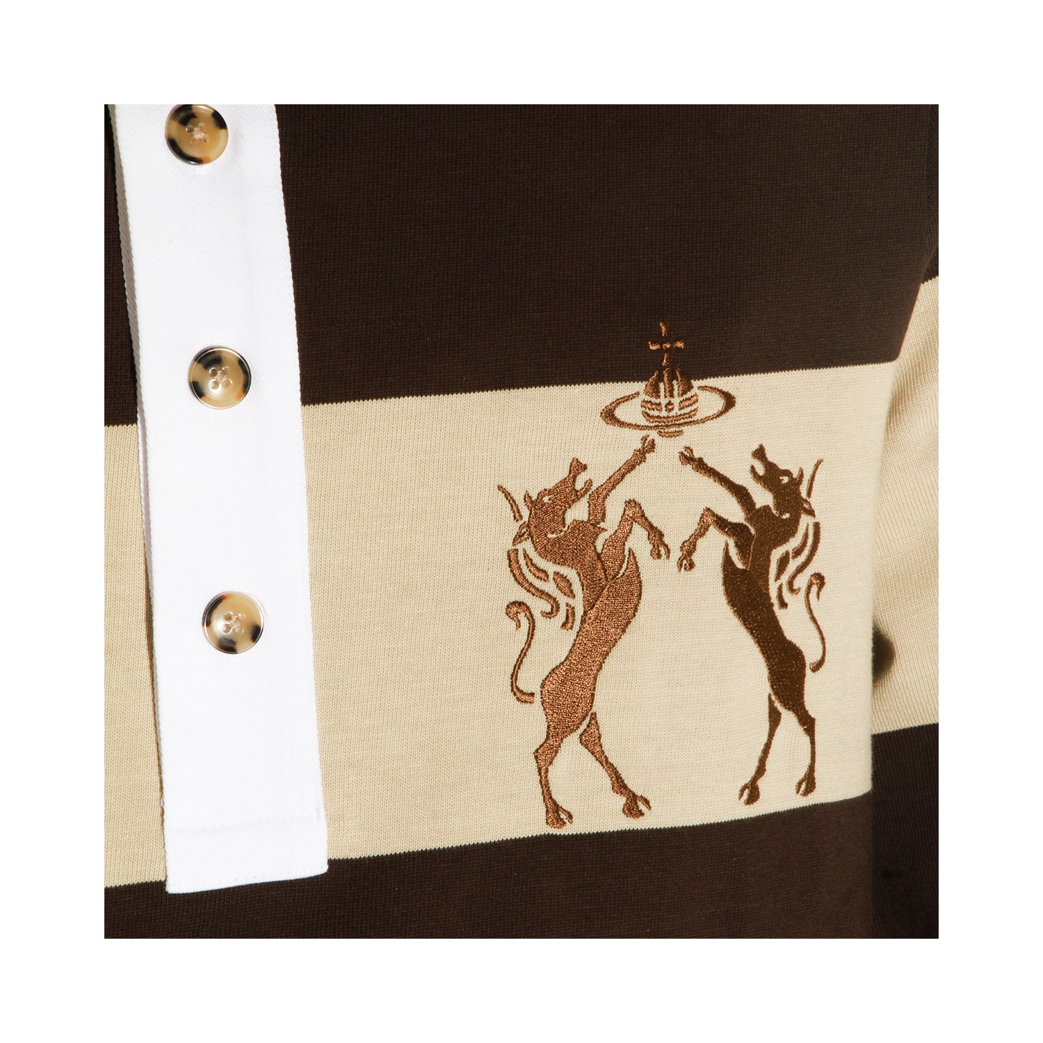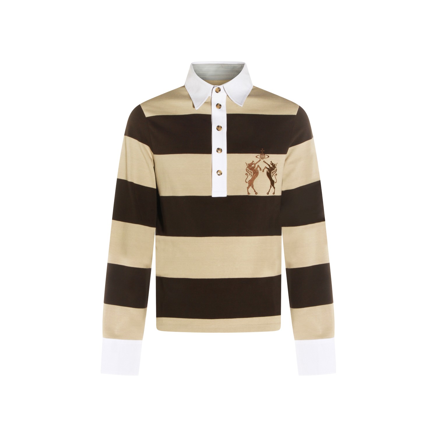 Beige and brown cotton polo shirt from Vivienne Westwood featuring polo shirt collar, long sleeves, embroidery, striped motif and regular fit.
