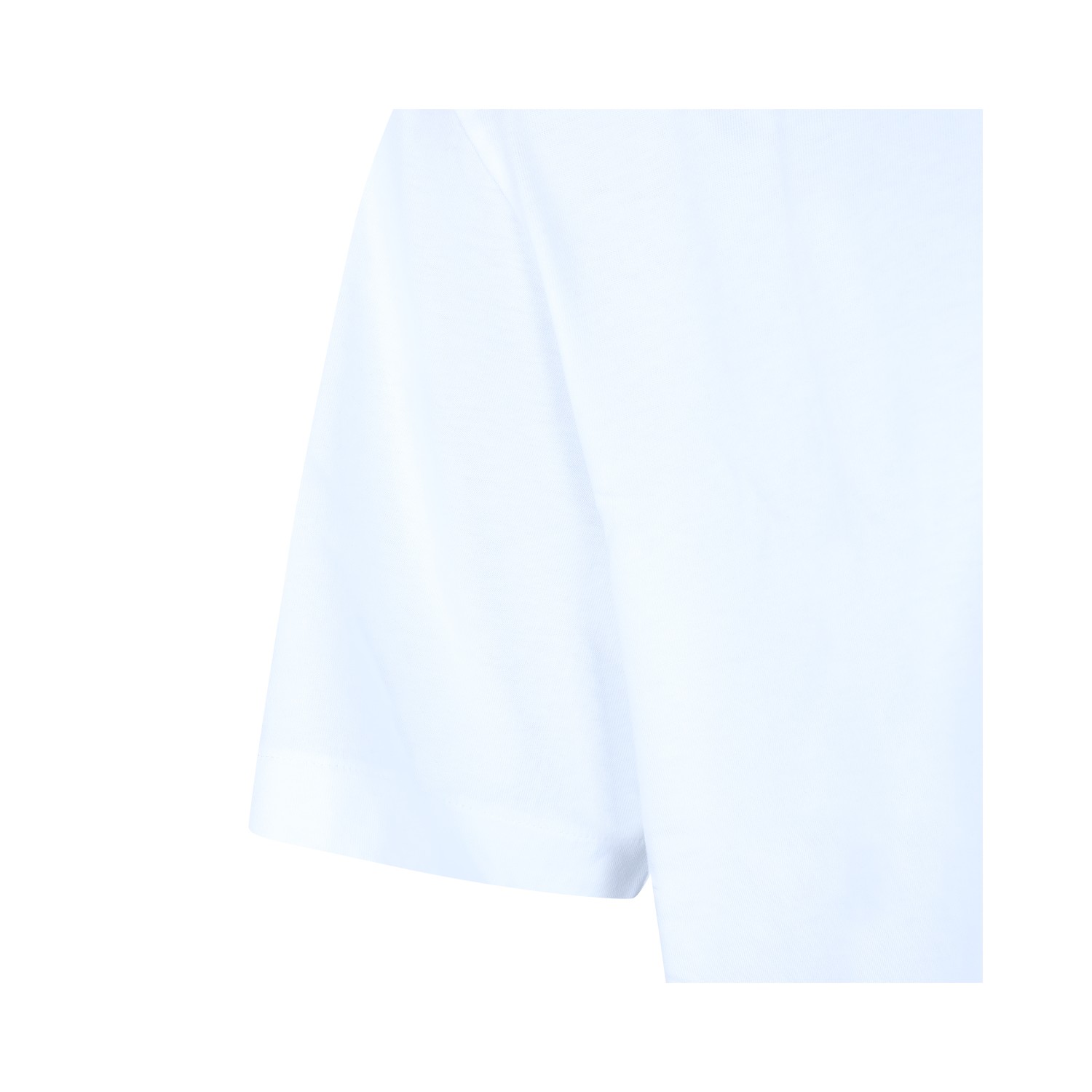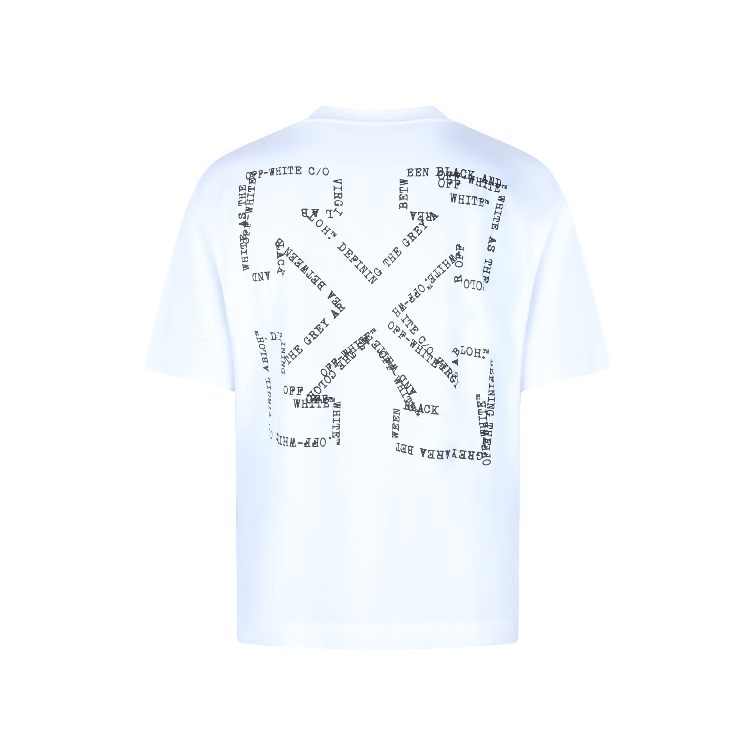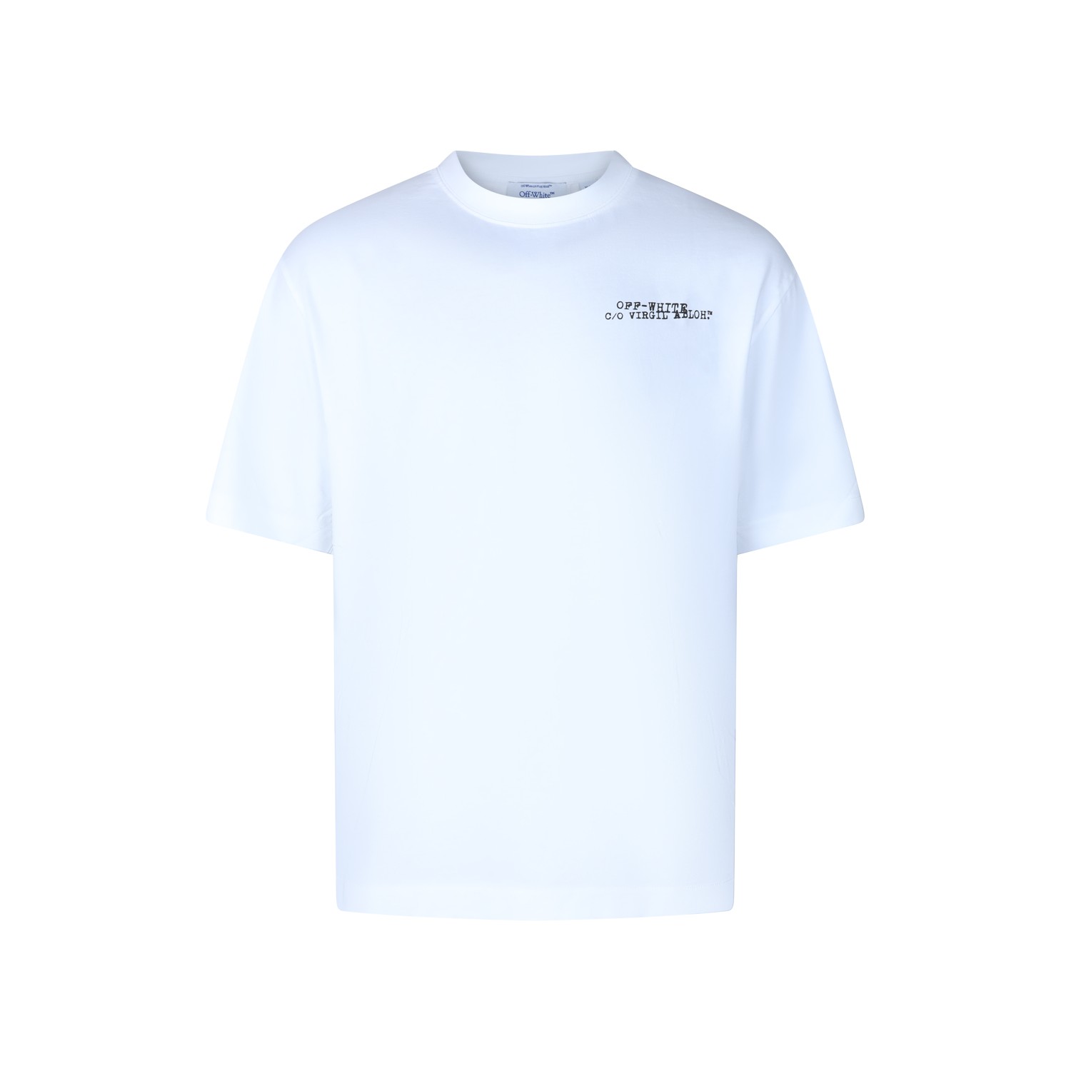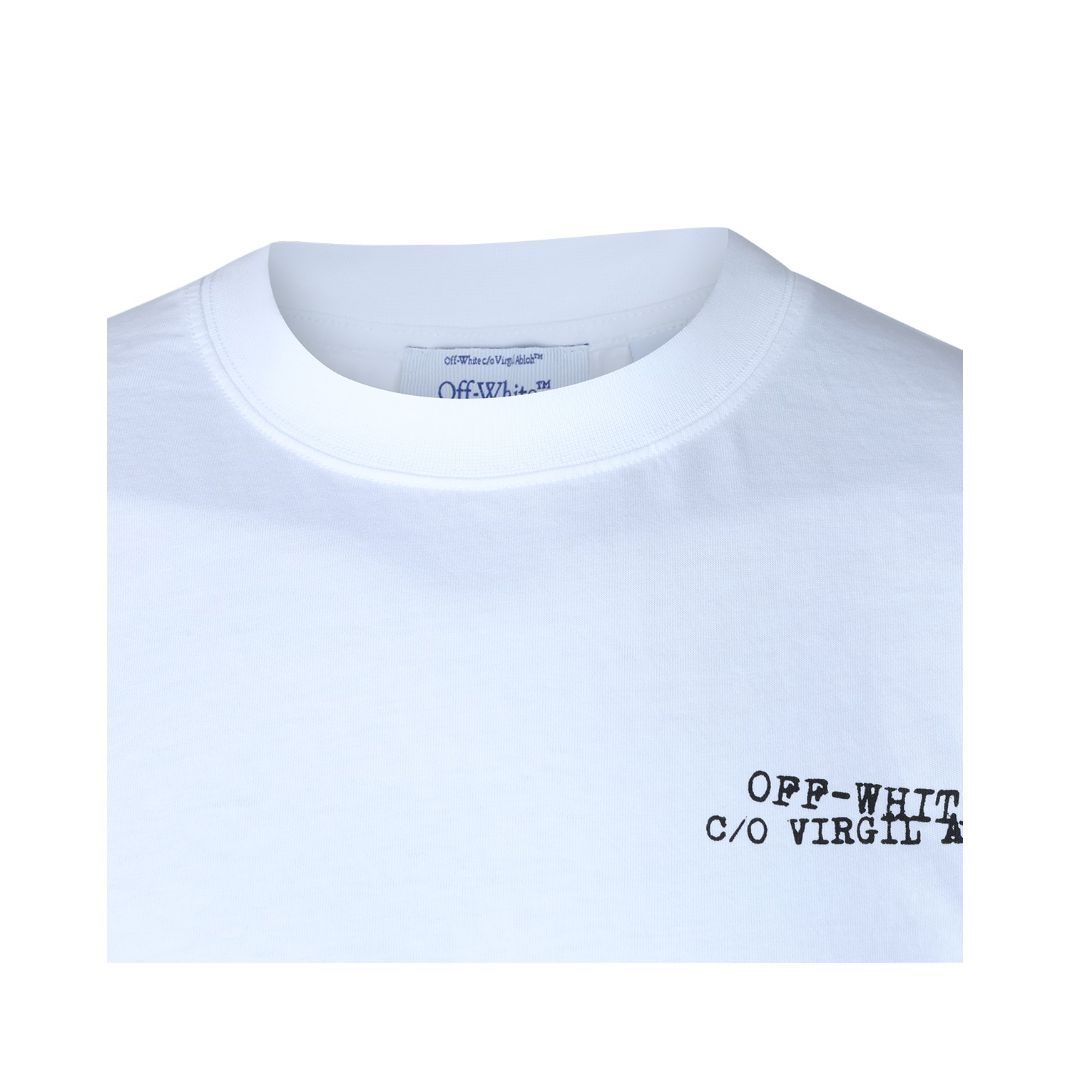 White cotton cross T-Shirt from Off-White featuring short sleeves, round neck, straight hem, logo print at chest and cross metal print at back.