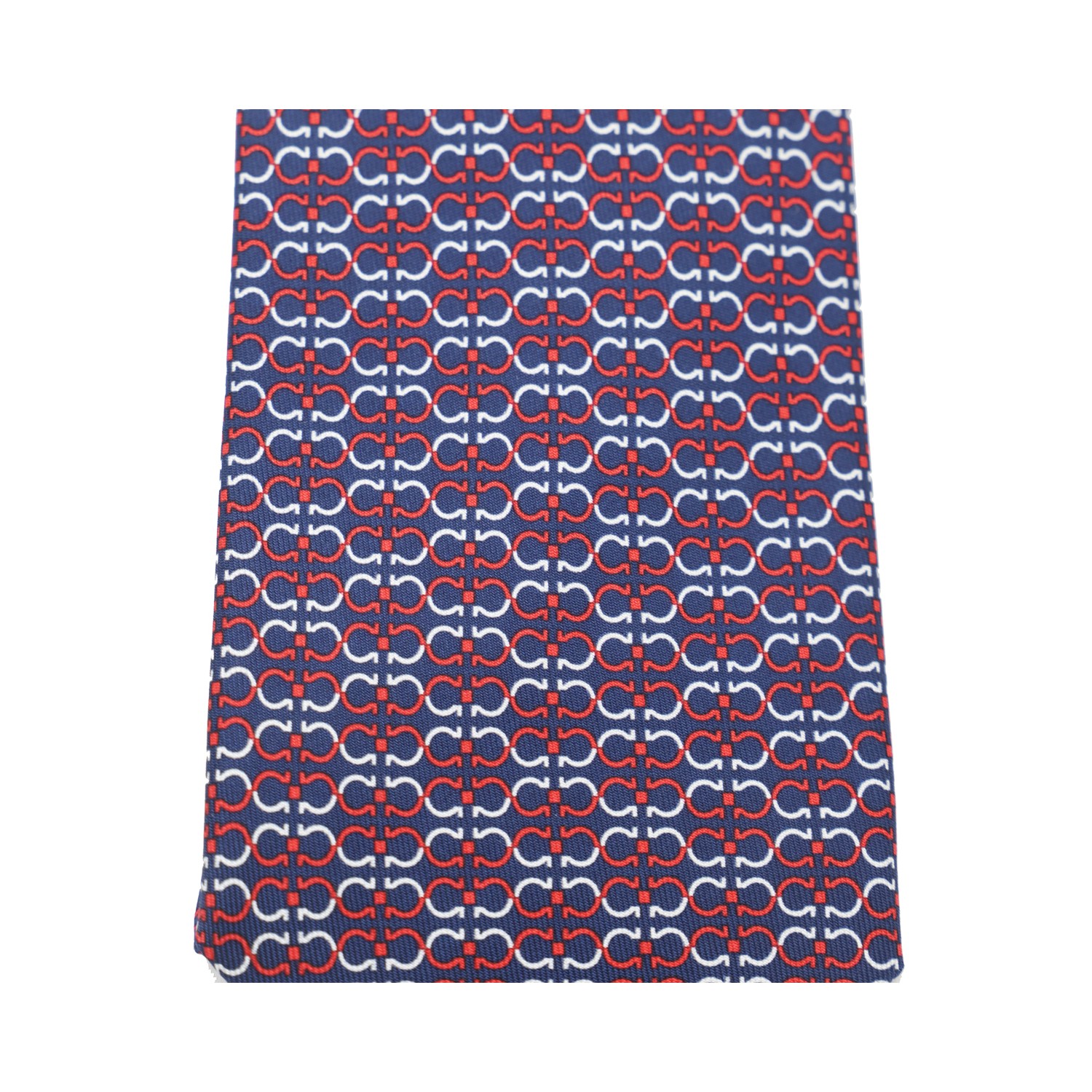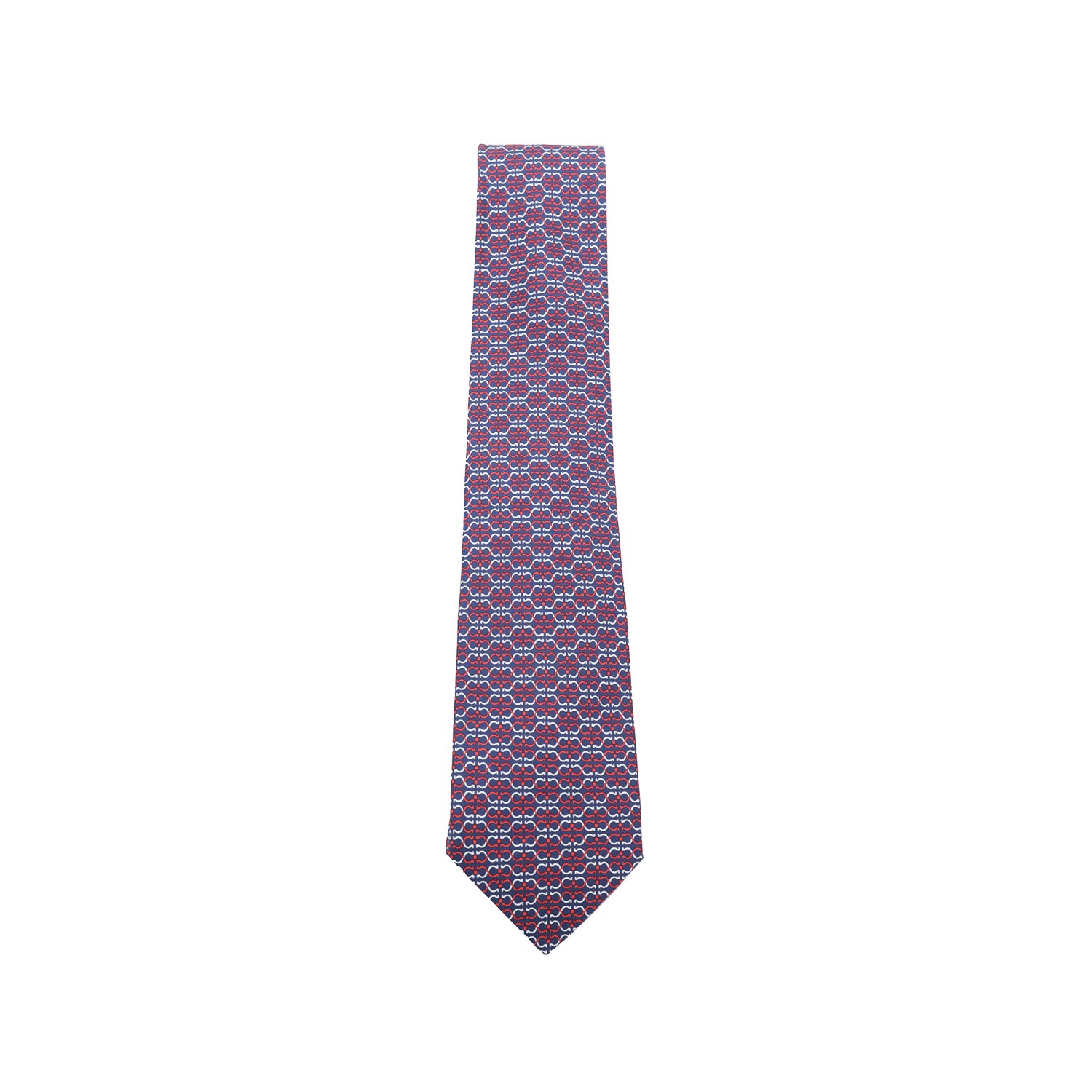 Navy and red silk tie from Ferragamo featuring all over pattern and logo patch.