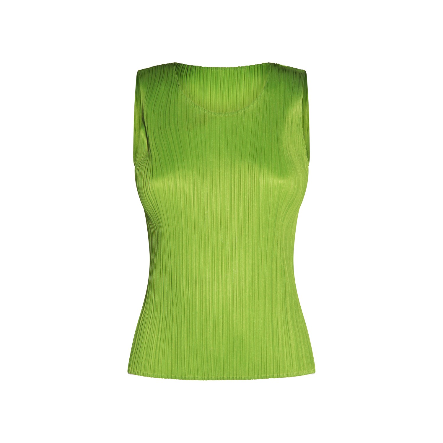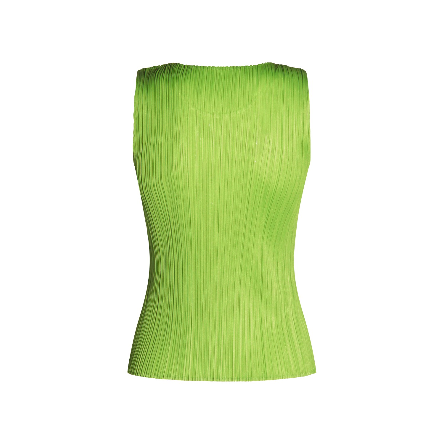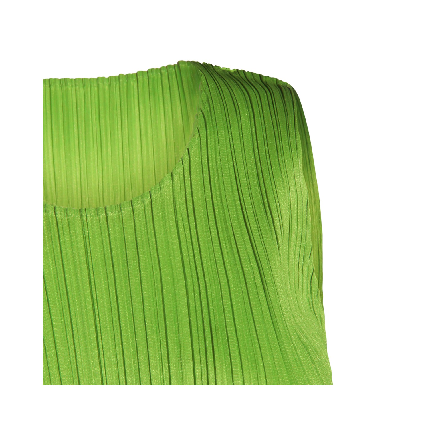 Green top from Issey Miyake Pleats Please featuring round collar, sleeveless, pleated and regular vestibility.
