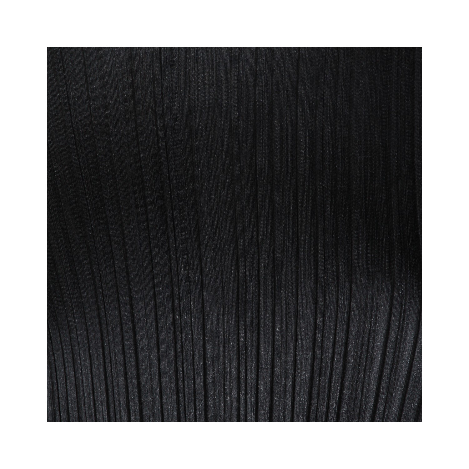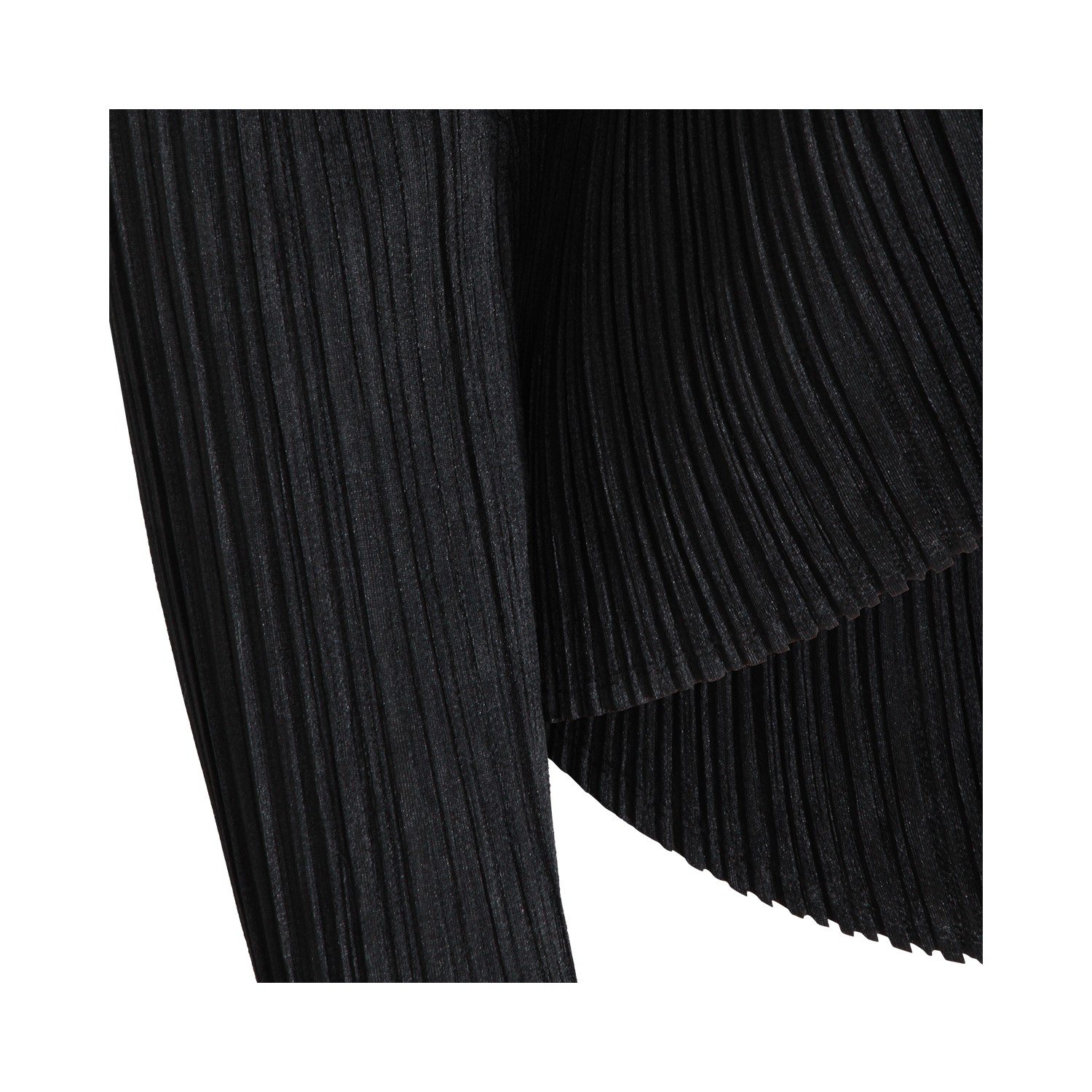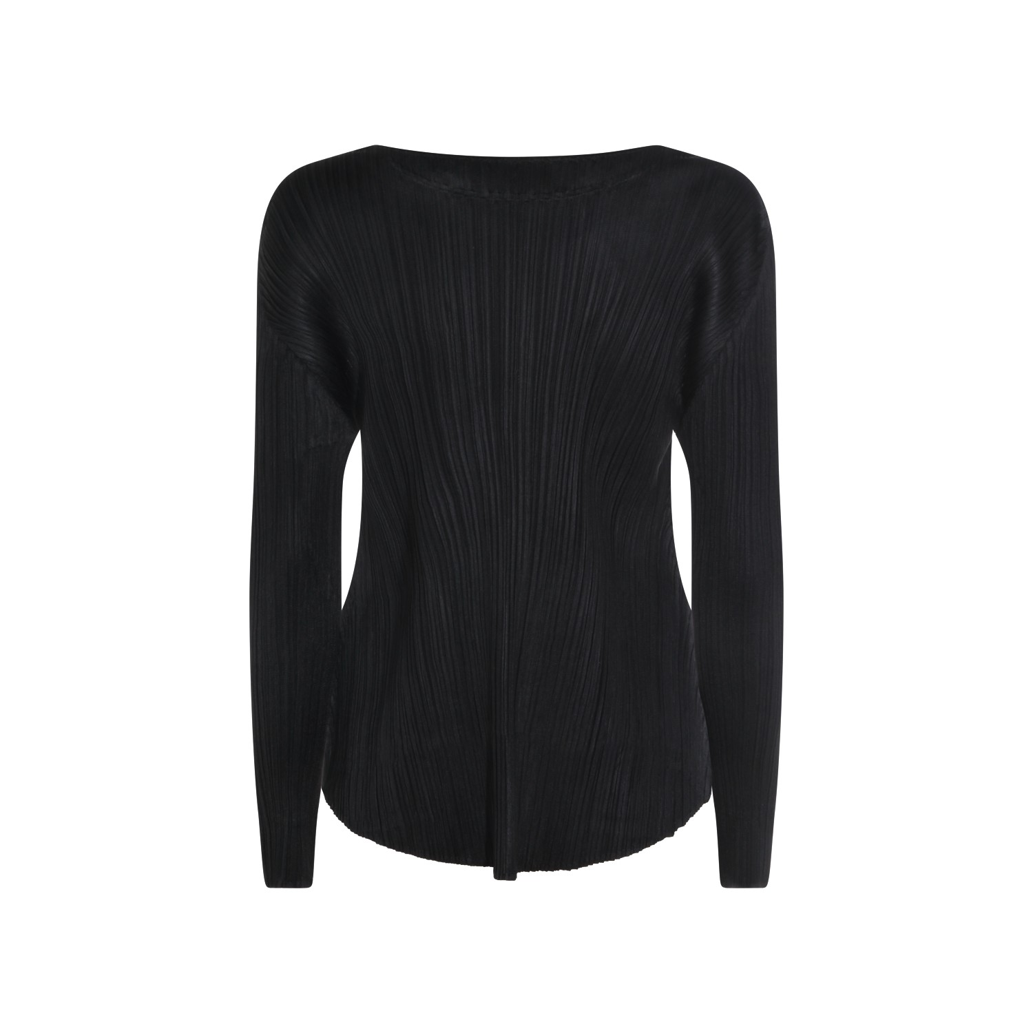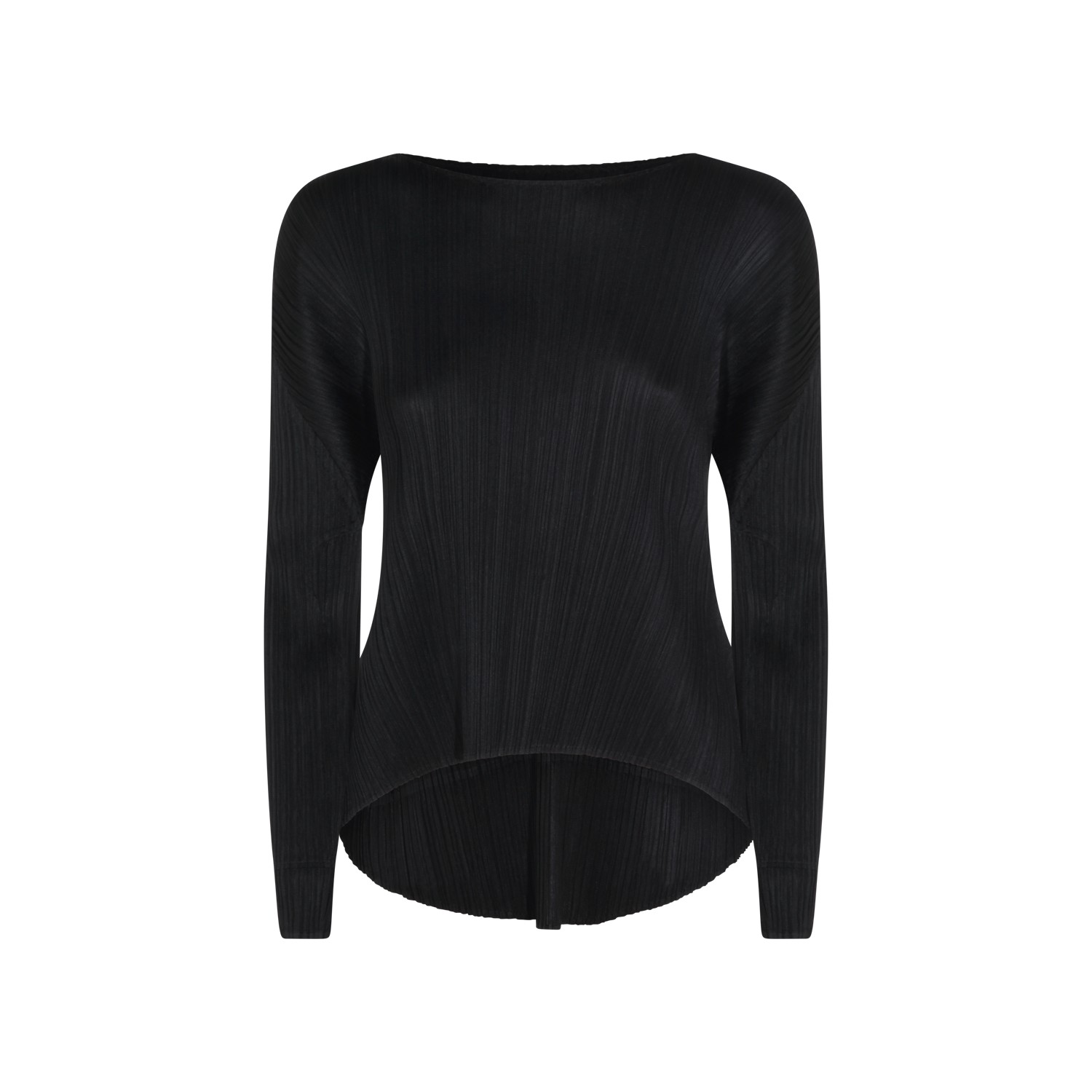 Black top from Pleats Please Issey Miyake featuring round collar, long sleeves, pleated and asymmetrical hem.