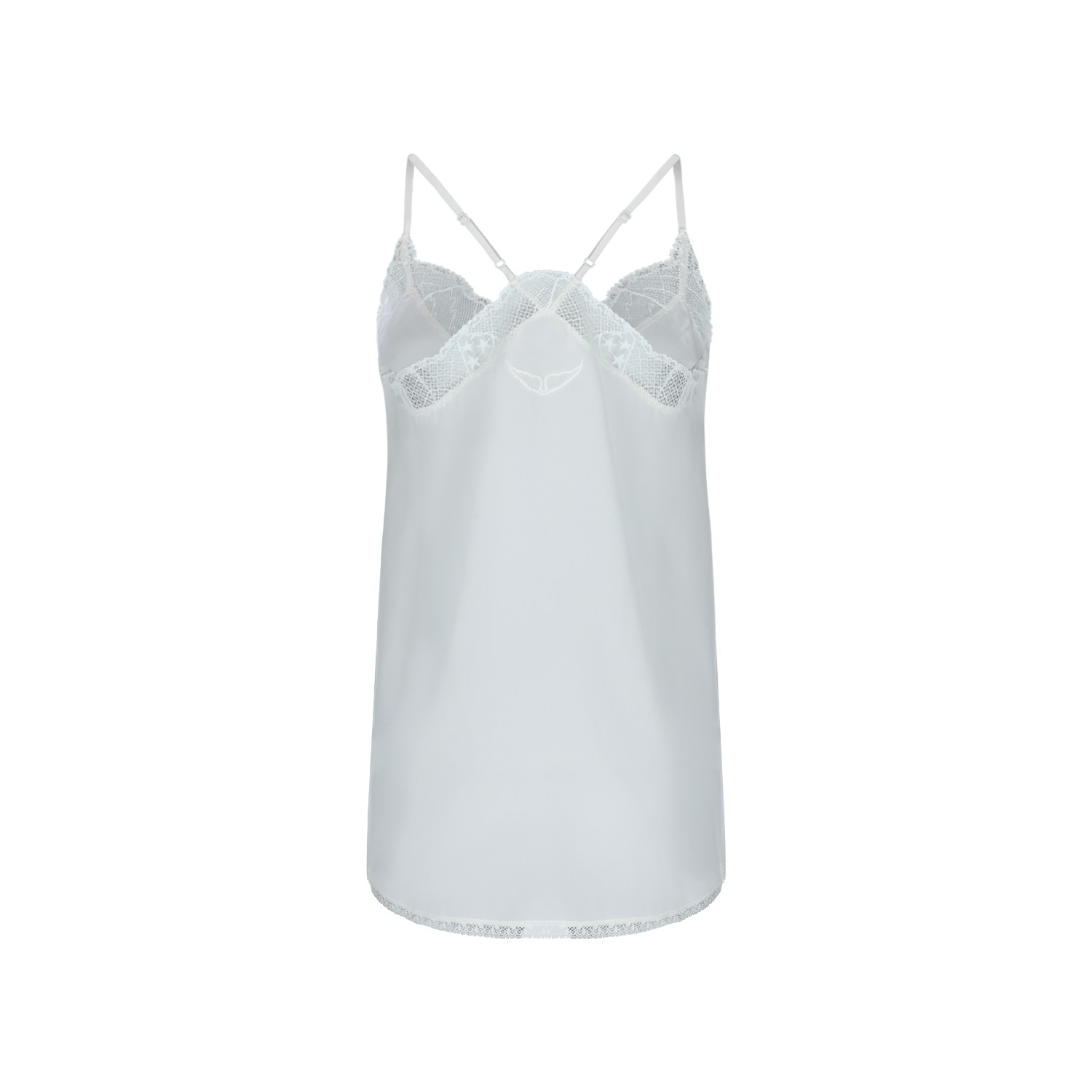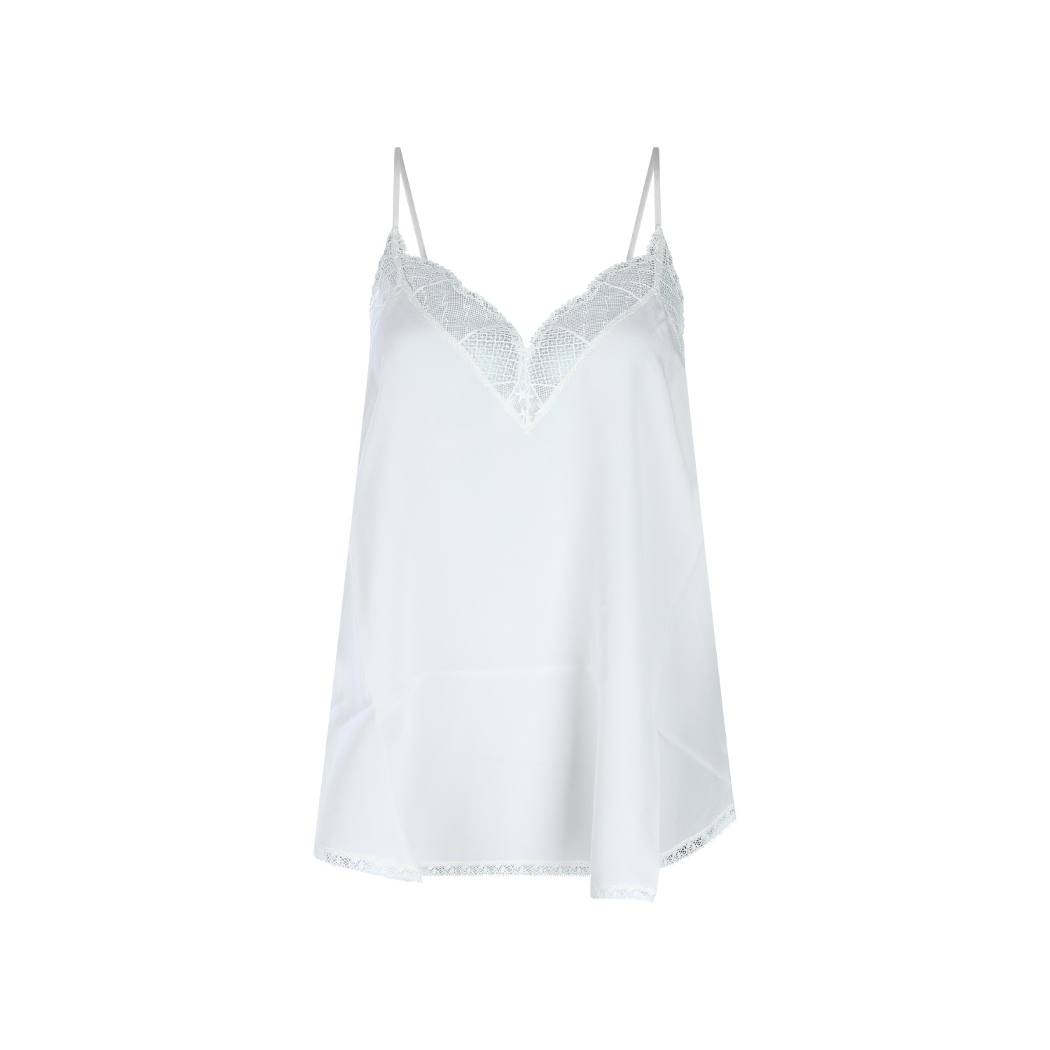 White silk top from Zadig & Voltaire featuring v neckline, sleeveless, lace details, rear logo and soft vestibility.