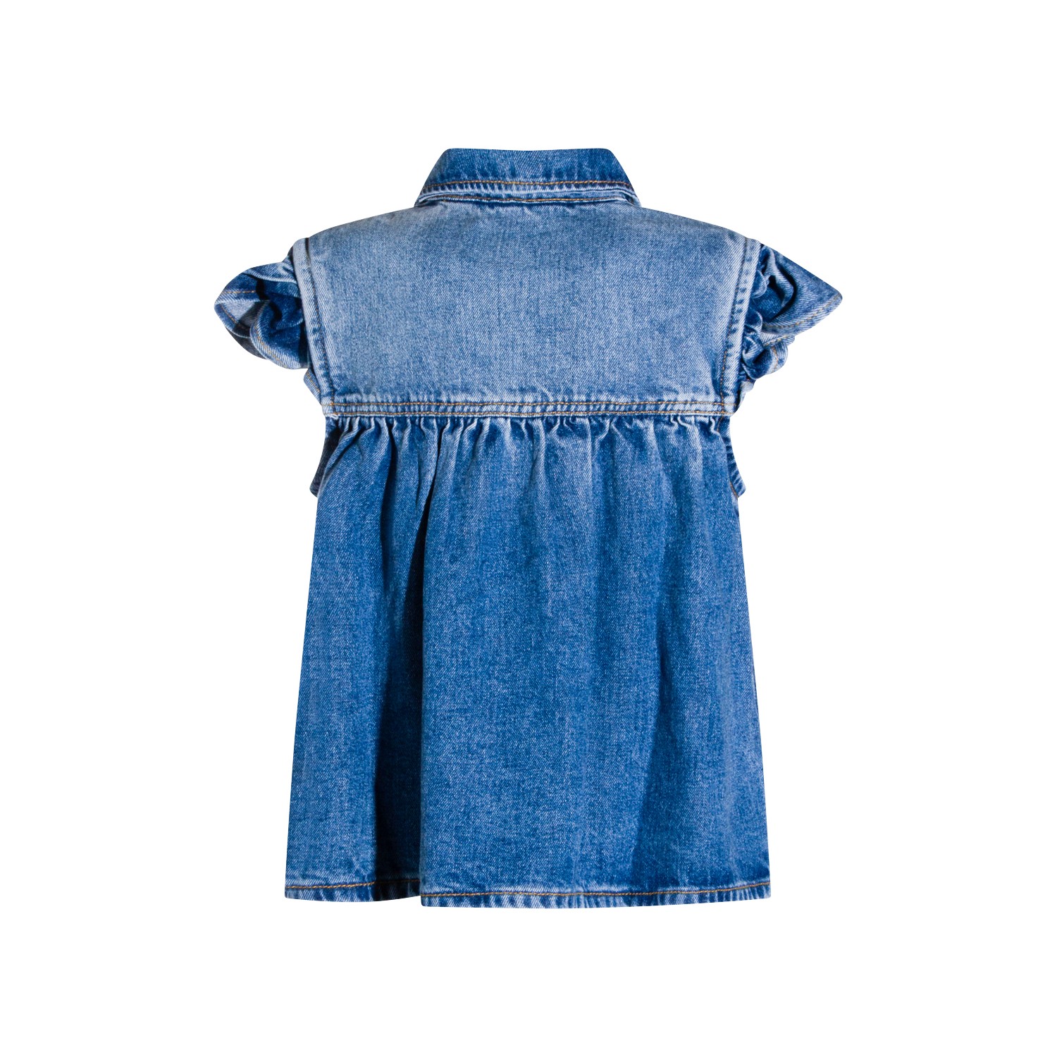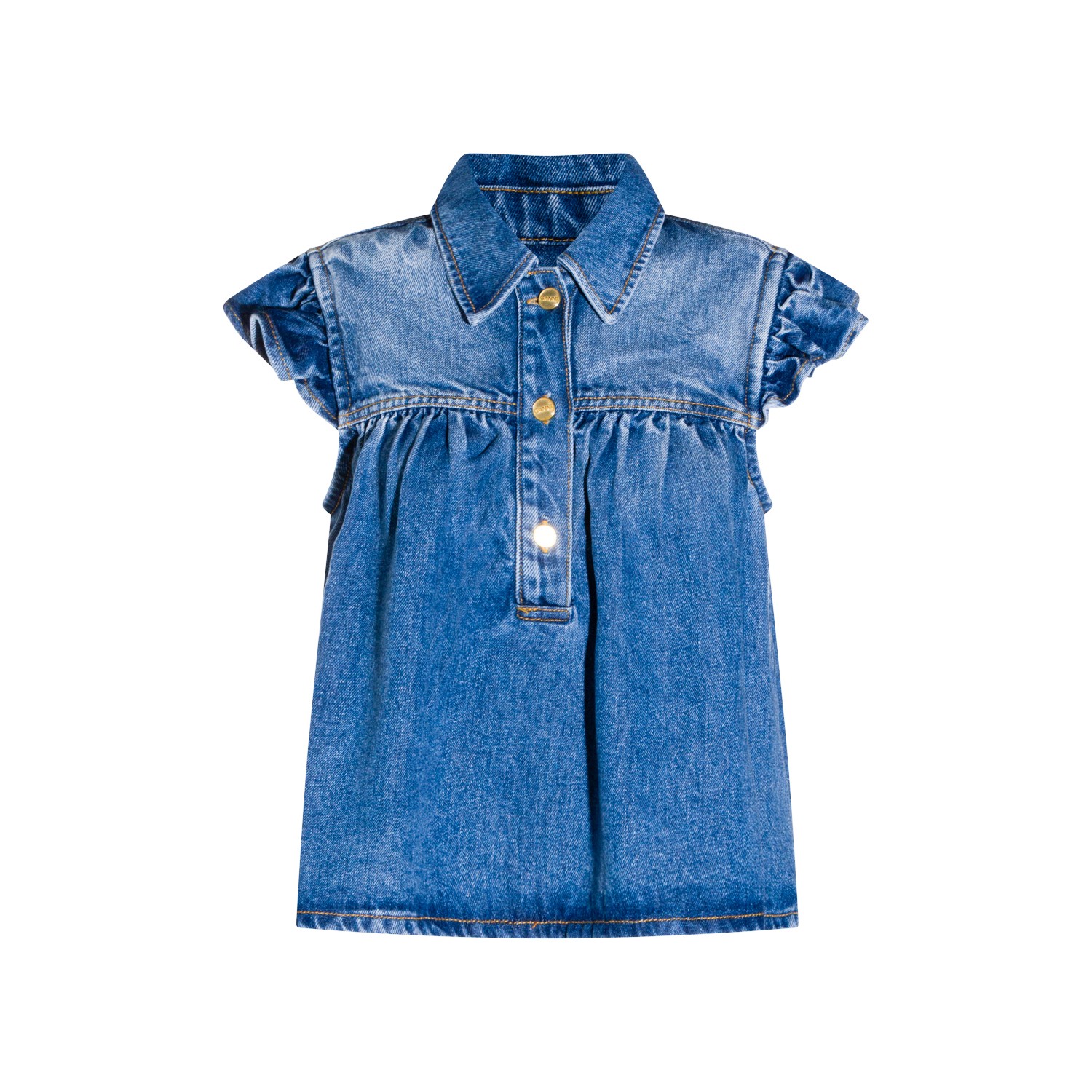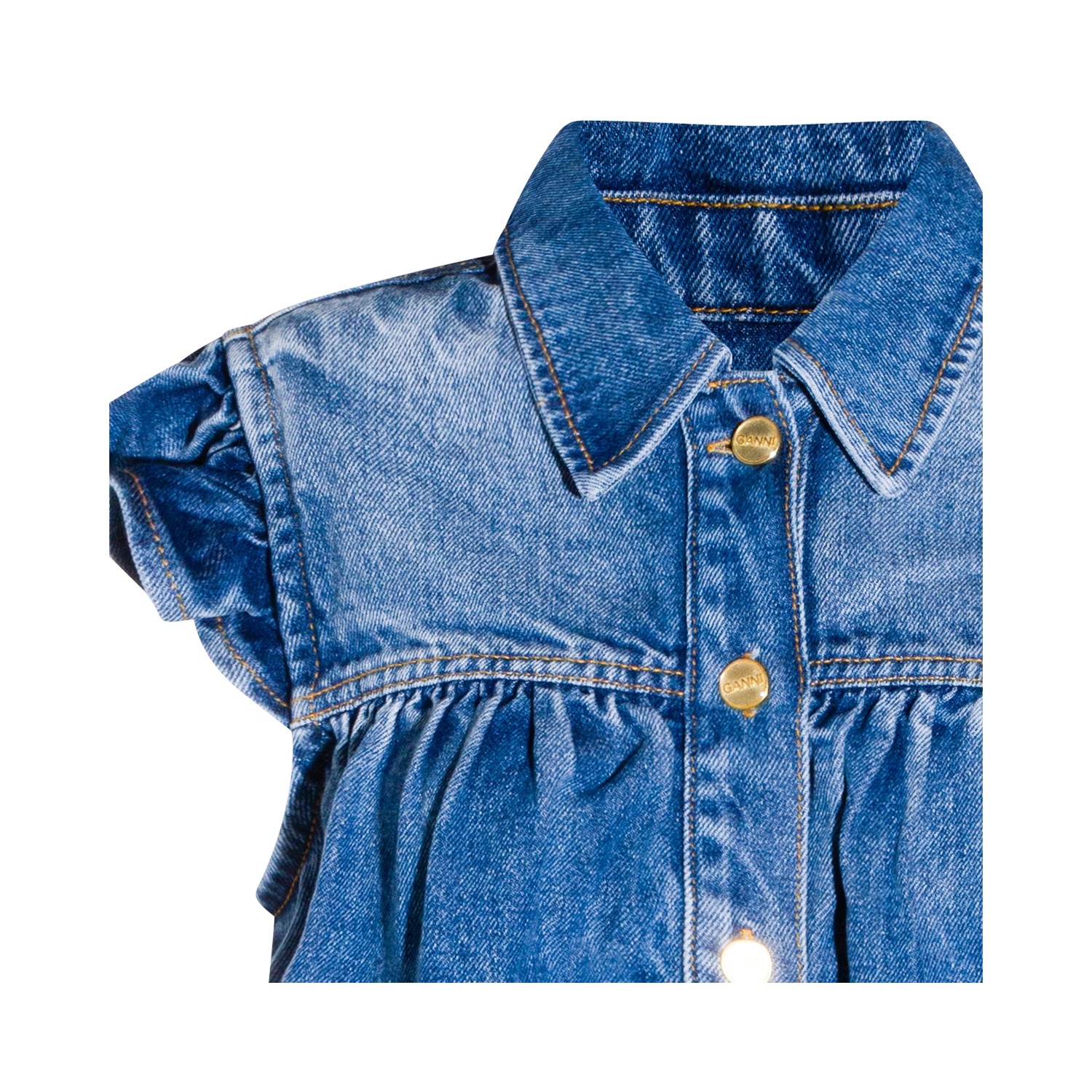 Blue denim top from Ganni featuring classic colalr, short sleeves, frontal buttons fastening, ruffles and regular fit.