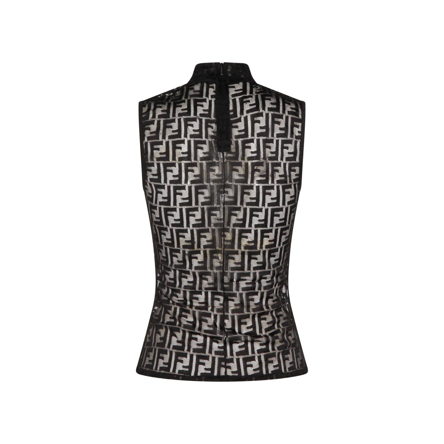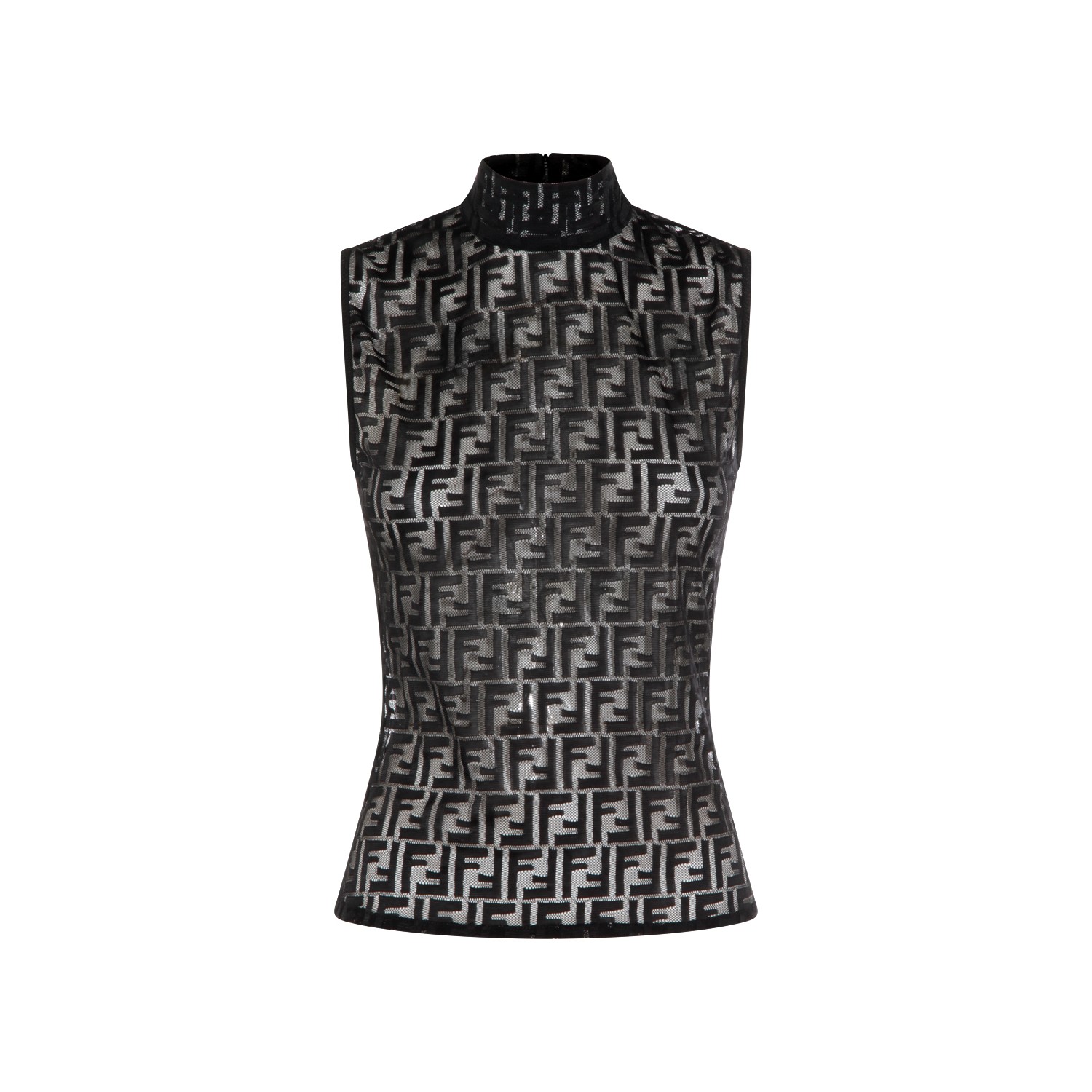 Black top from Fendi featuring high neck, sleeveless, transparency, all over monogram and regular vestibility.