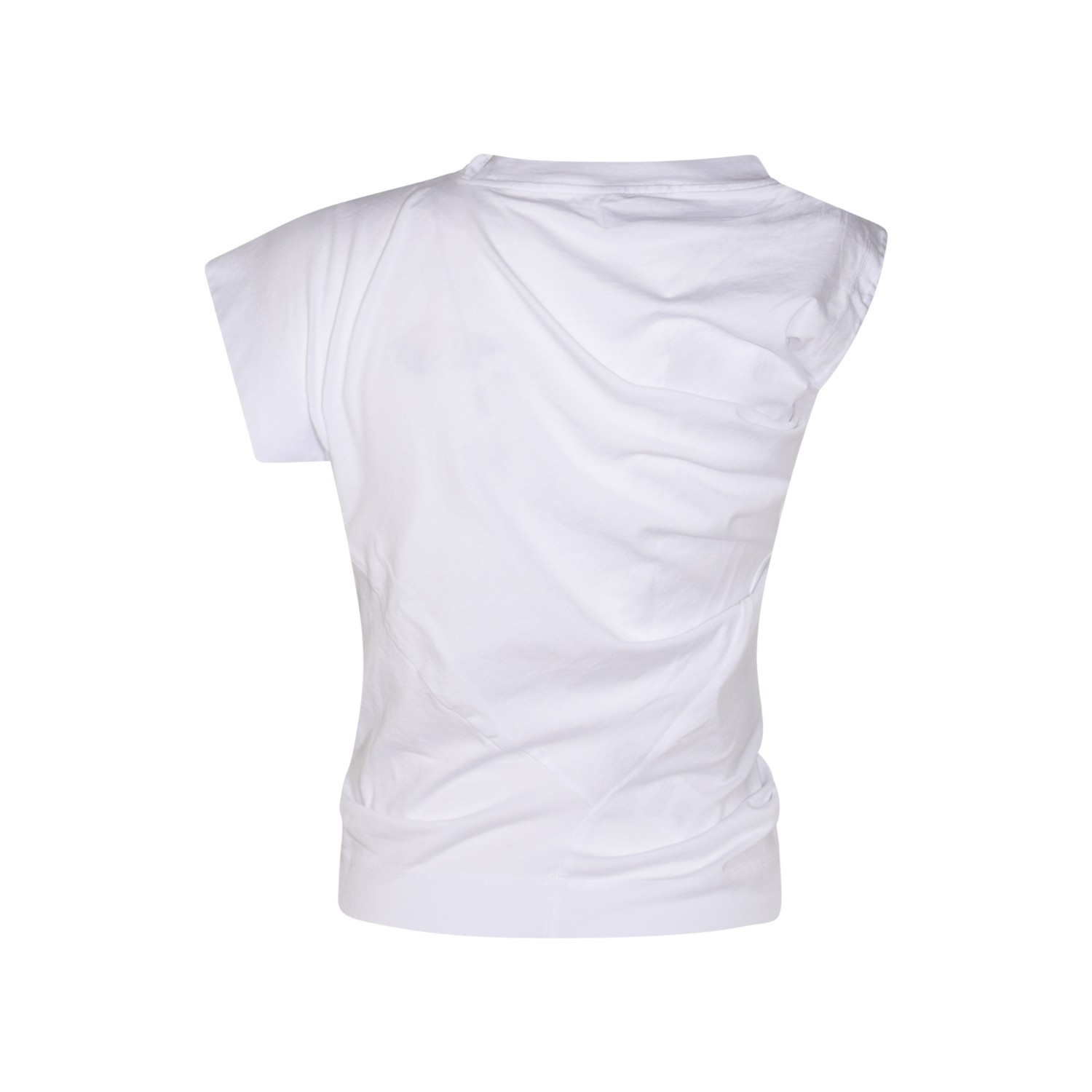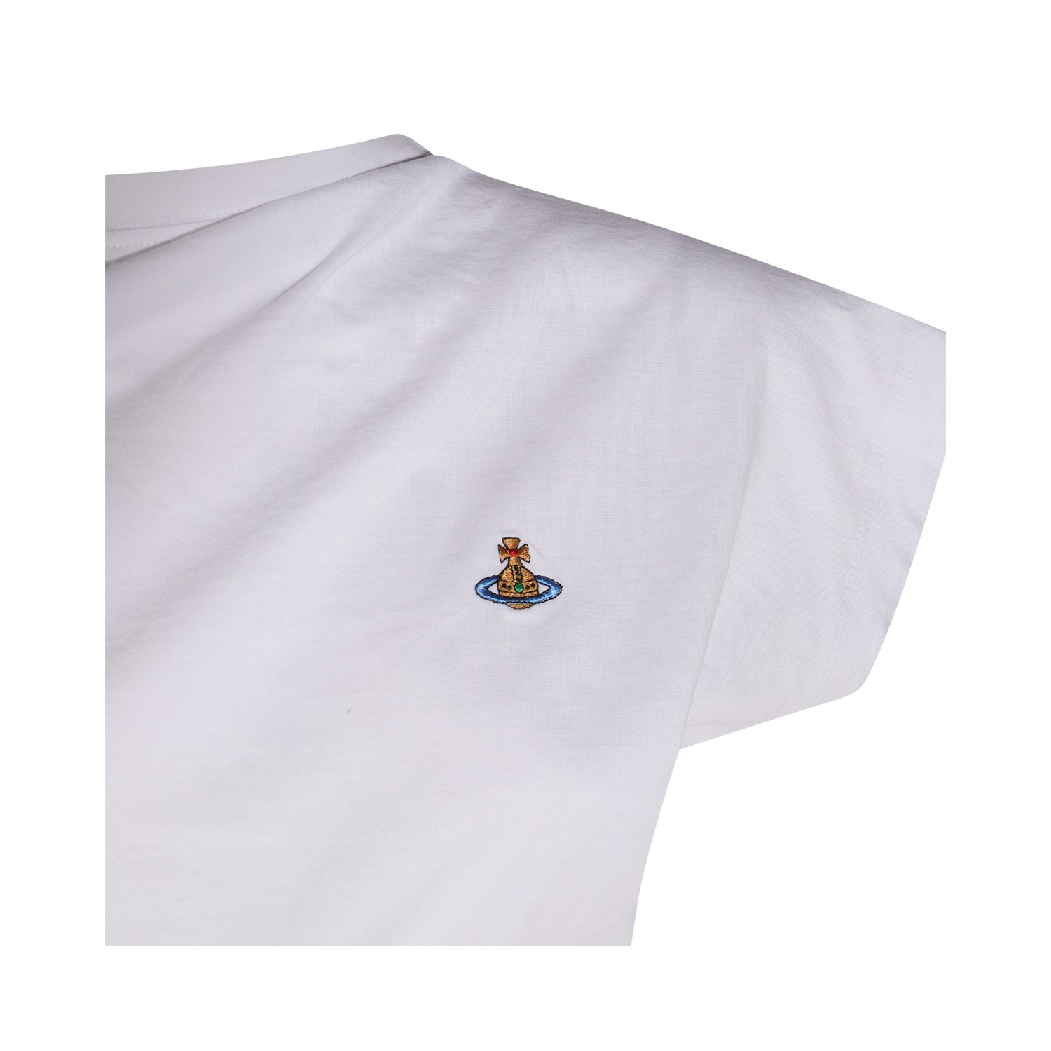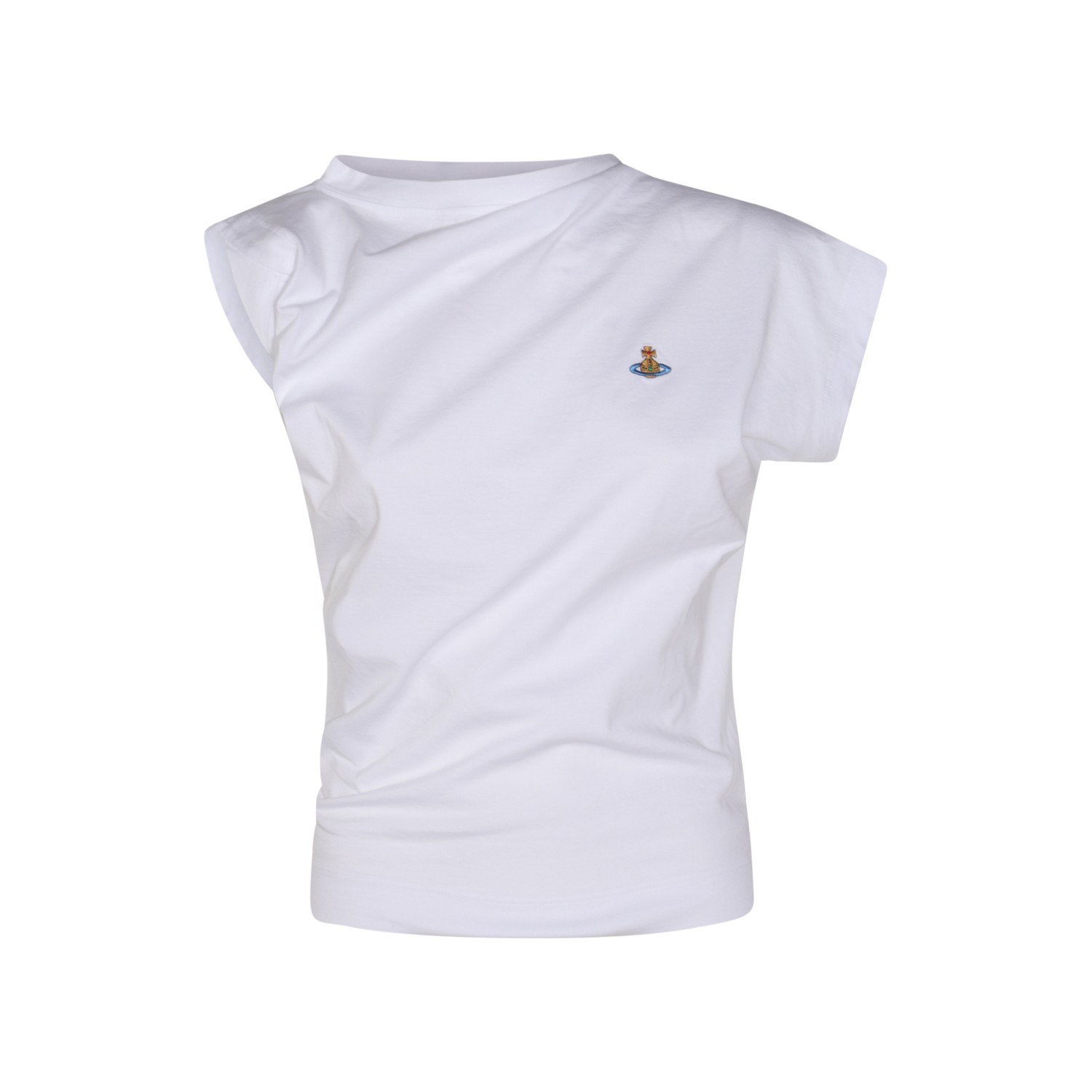 White cotton top from Vivienne Westwood featuring round collar, short sleeves and logo.