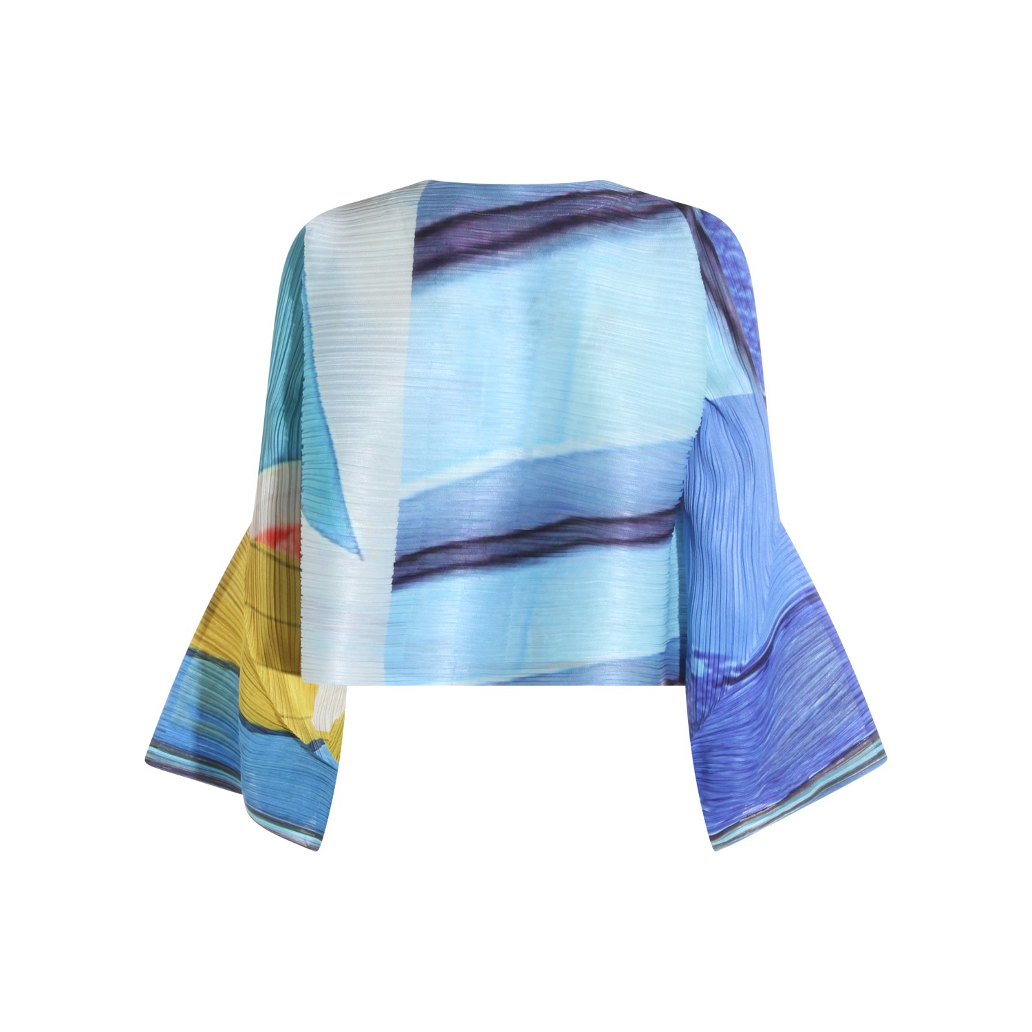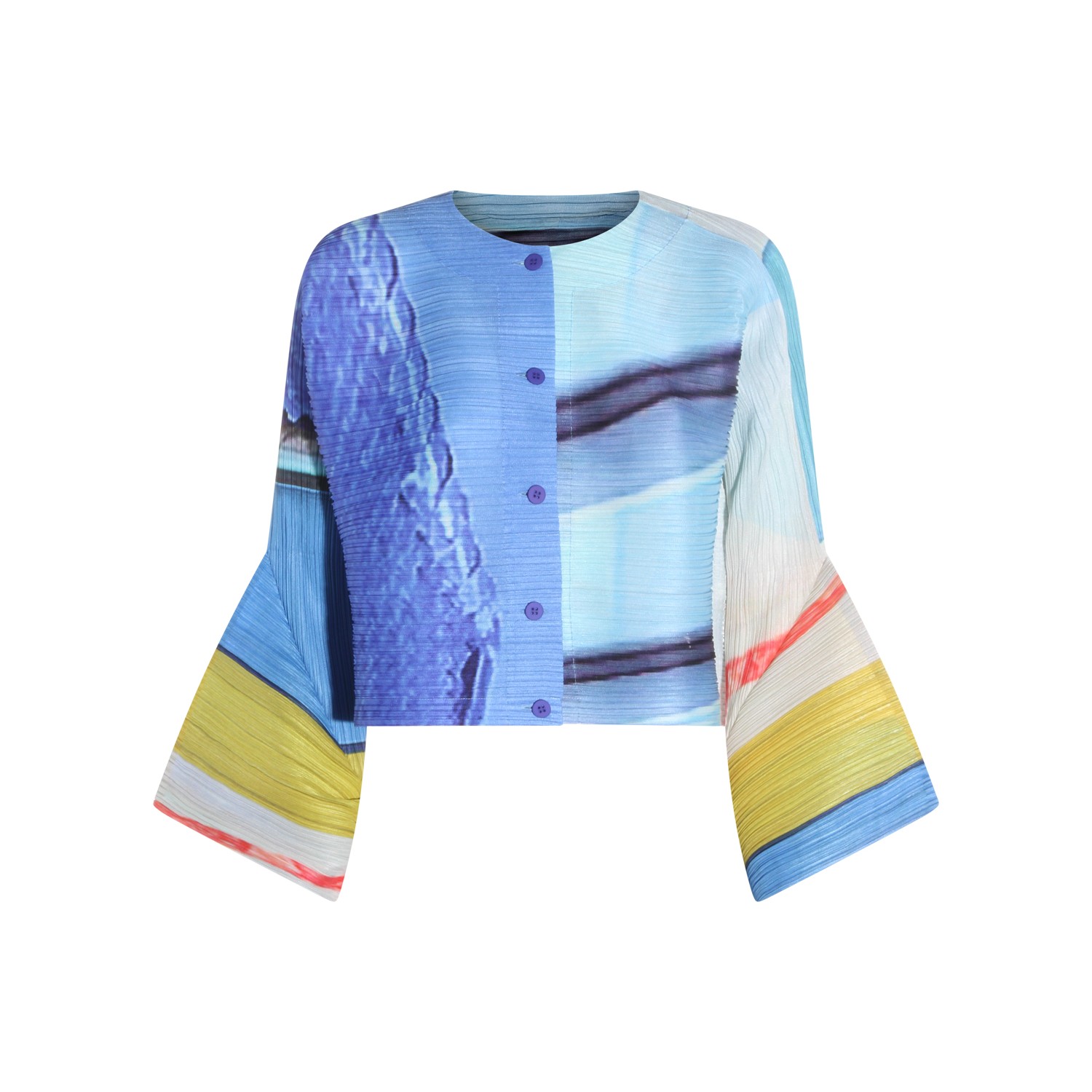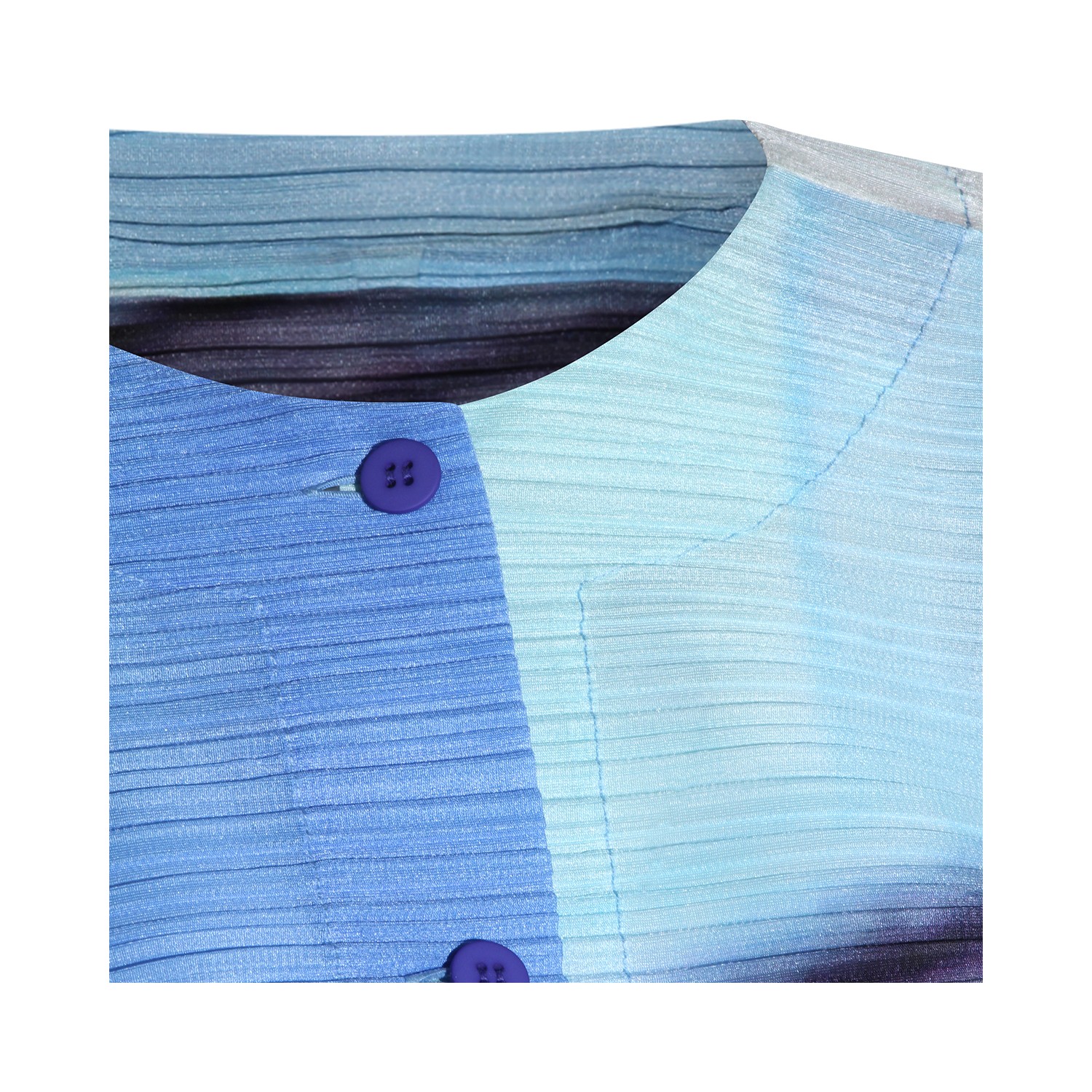 Blue and yellow pleated top from Pleats Please Issey Miyake featuring long sleeves, round collar, all over stamp, buttons fastening and loose fit.
