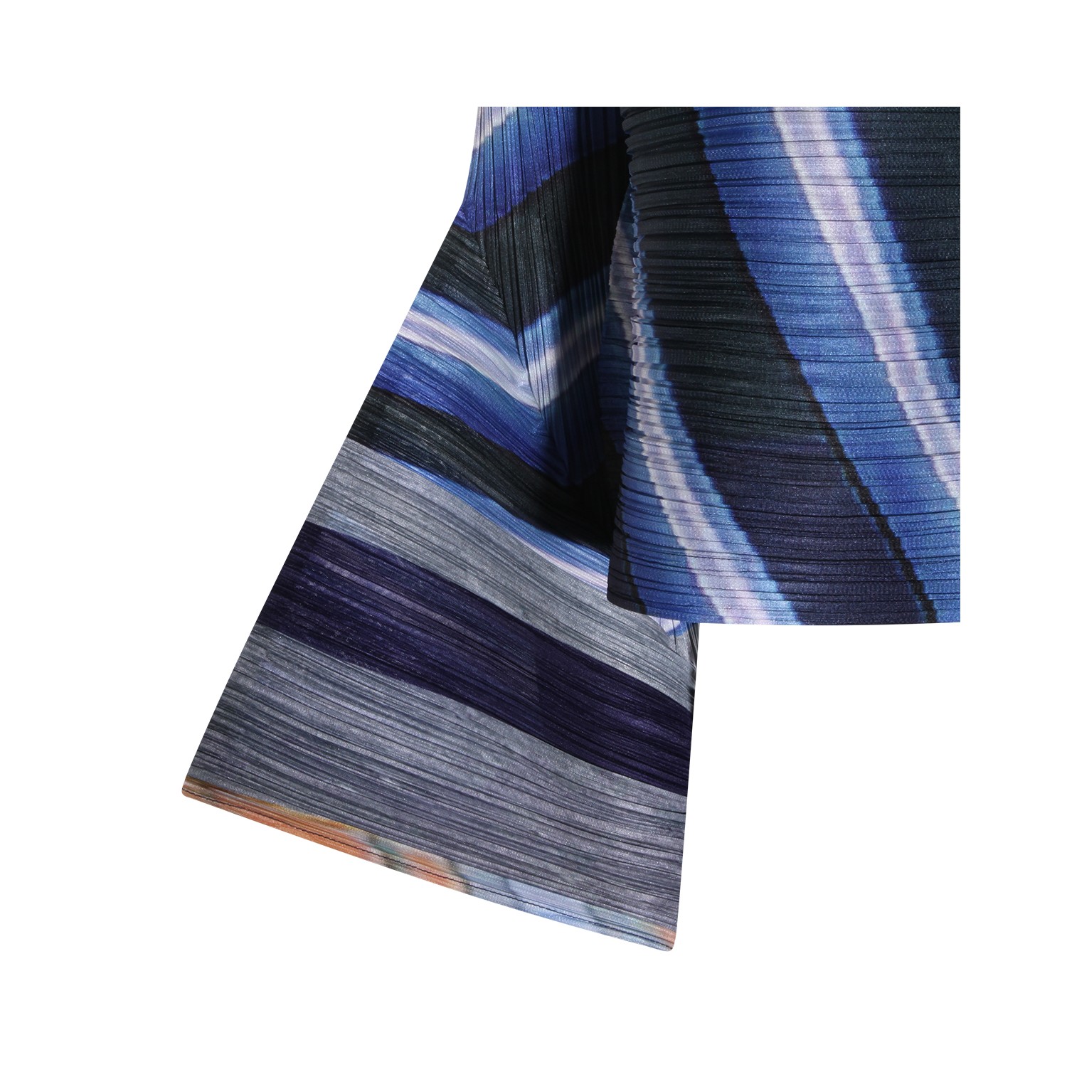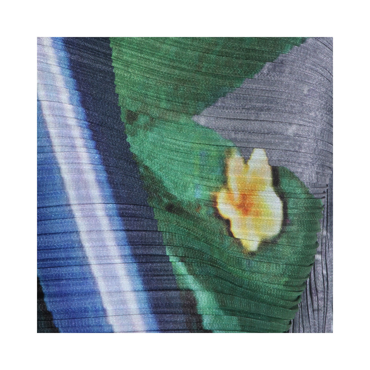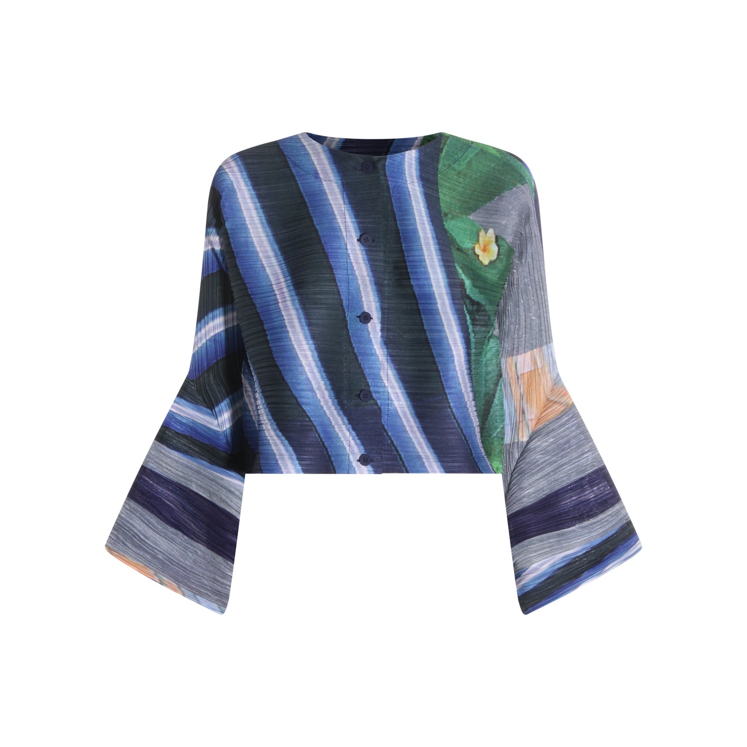 Gray and navy pleated top from Pleats Please Issey Miyake featuring long sleeves, all over stamp, buttons fastening, round collar and loose fit.