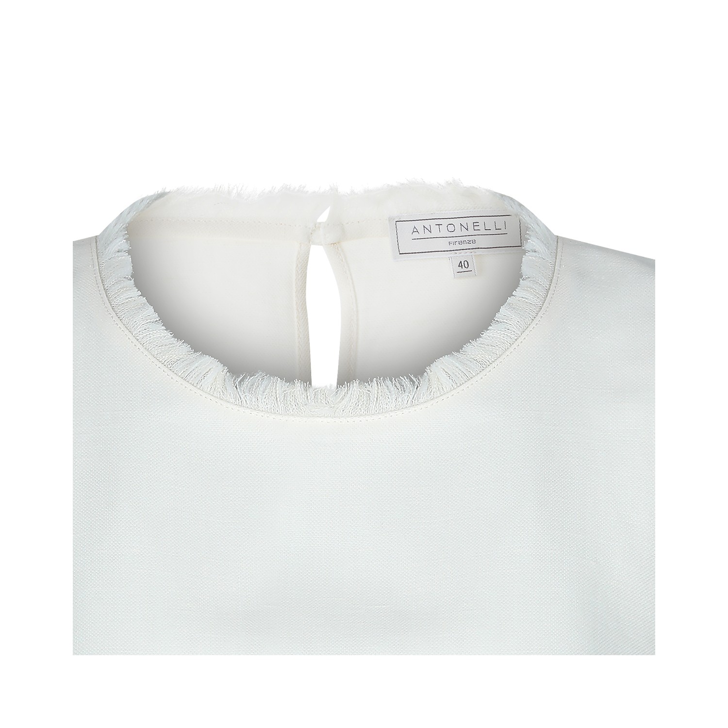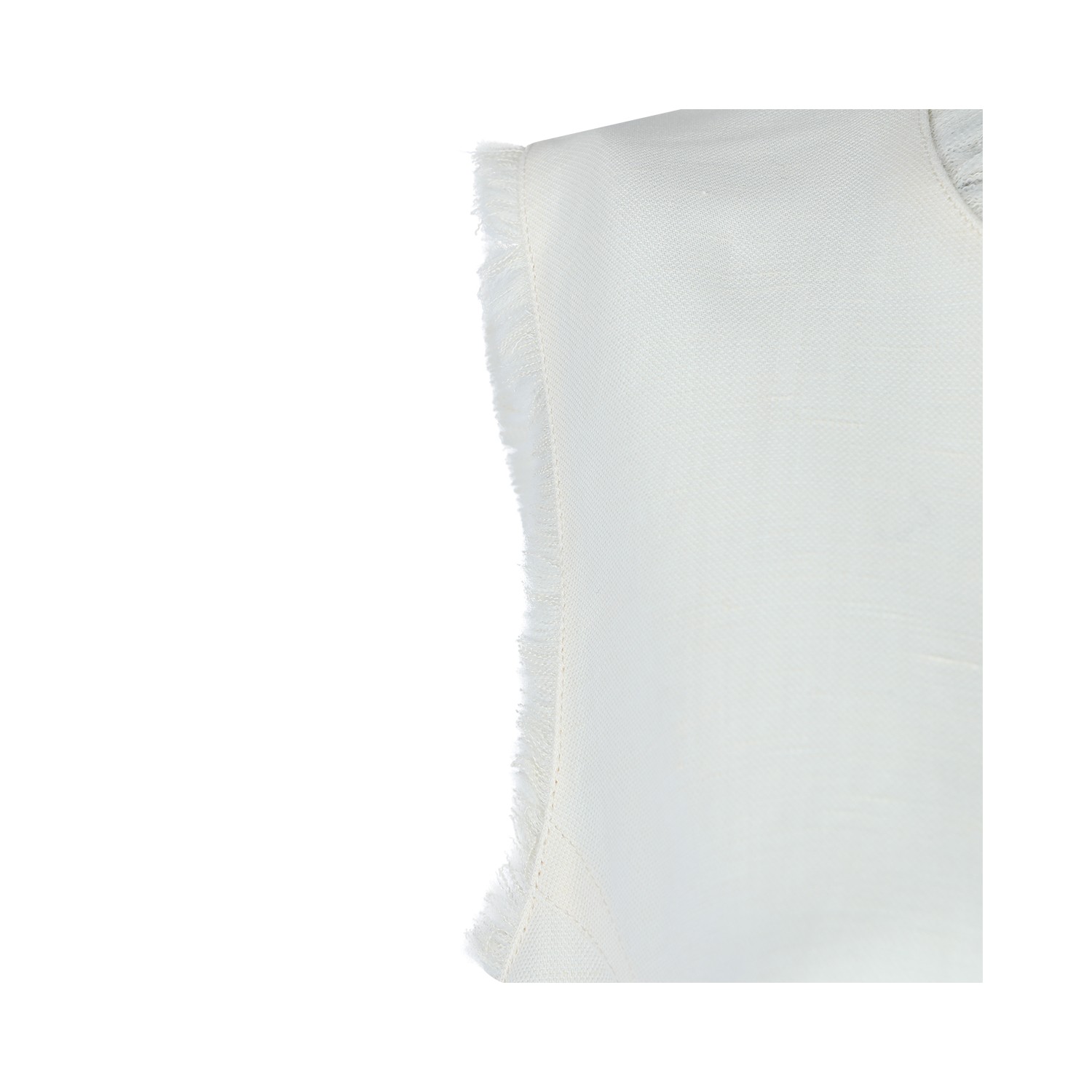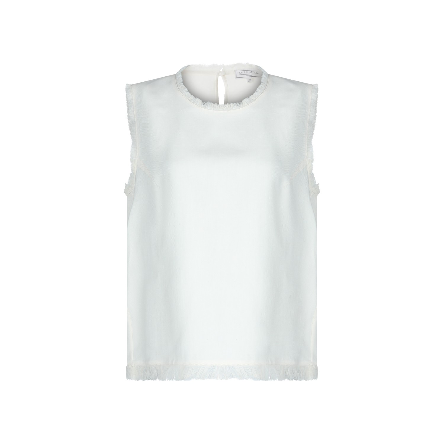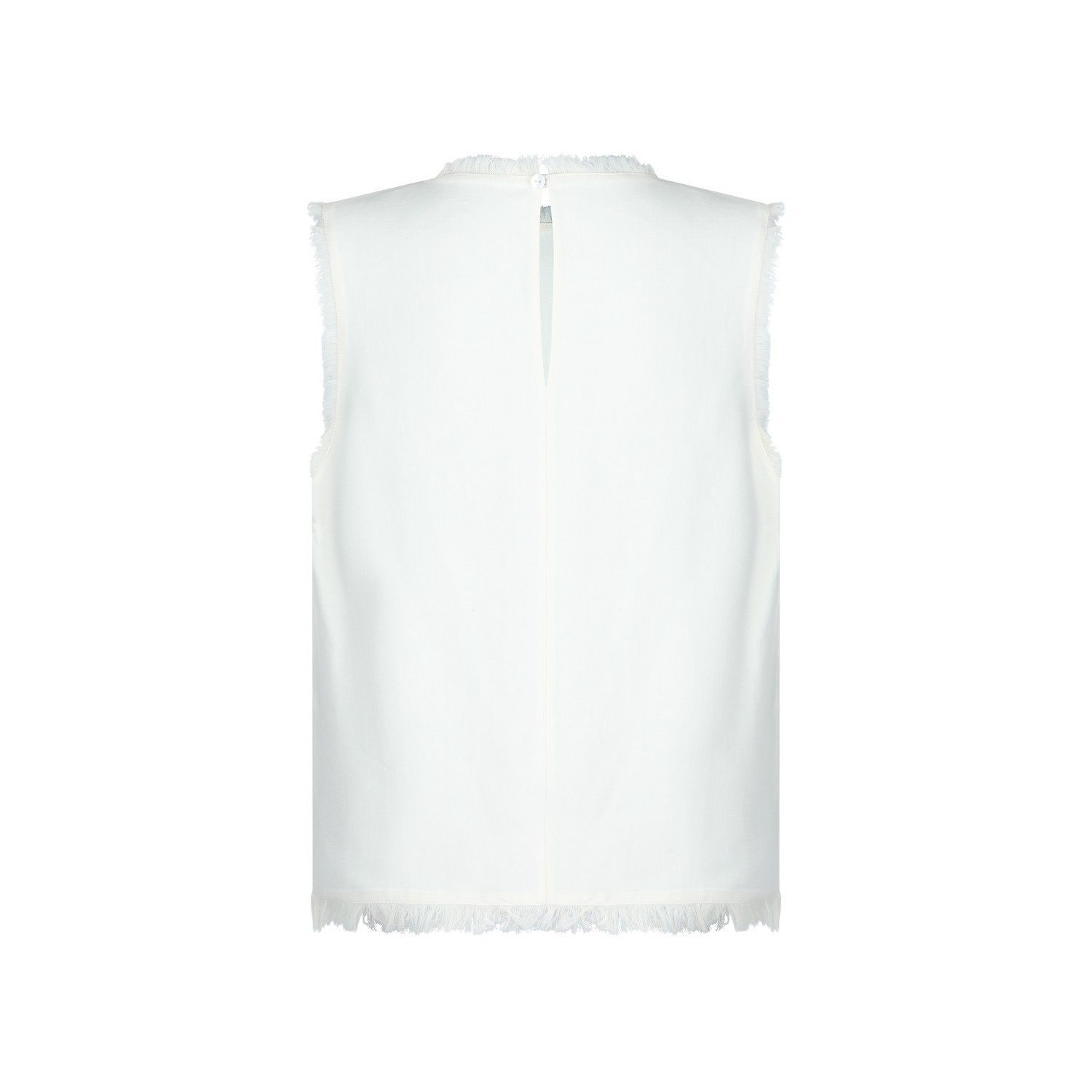 Butter viscose and linen blend top from Antonelli Firenze featuring sleeveless, round neck, fringed hems and button clsoure at back.