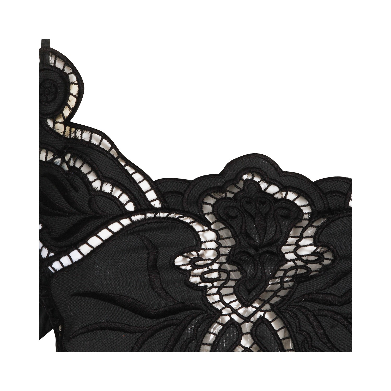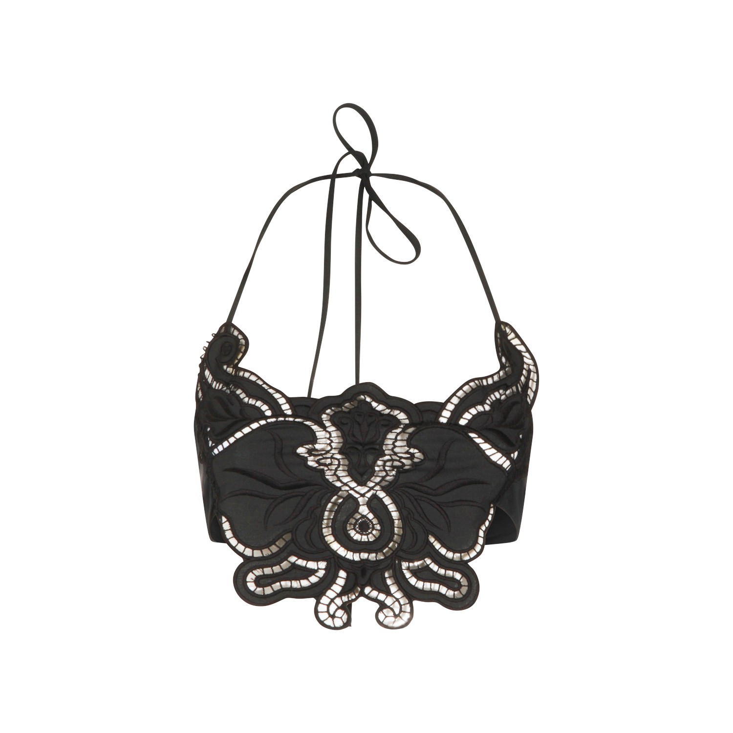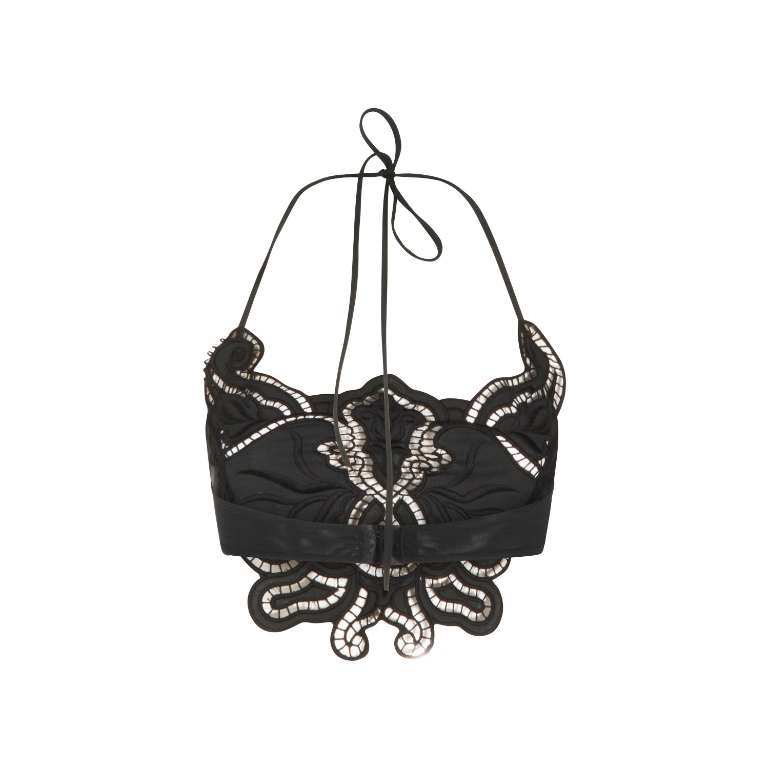 Black lace floreal top from Blumarine featuring cropped line, lace inserts and thin straps closure at back.