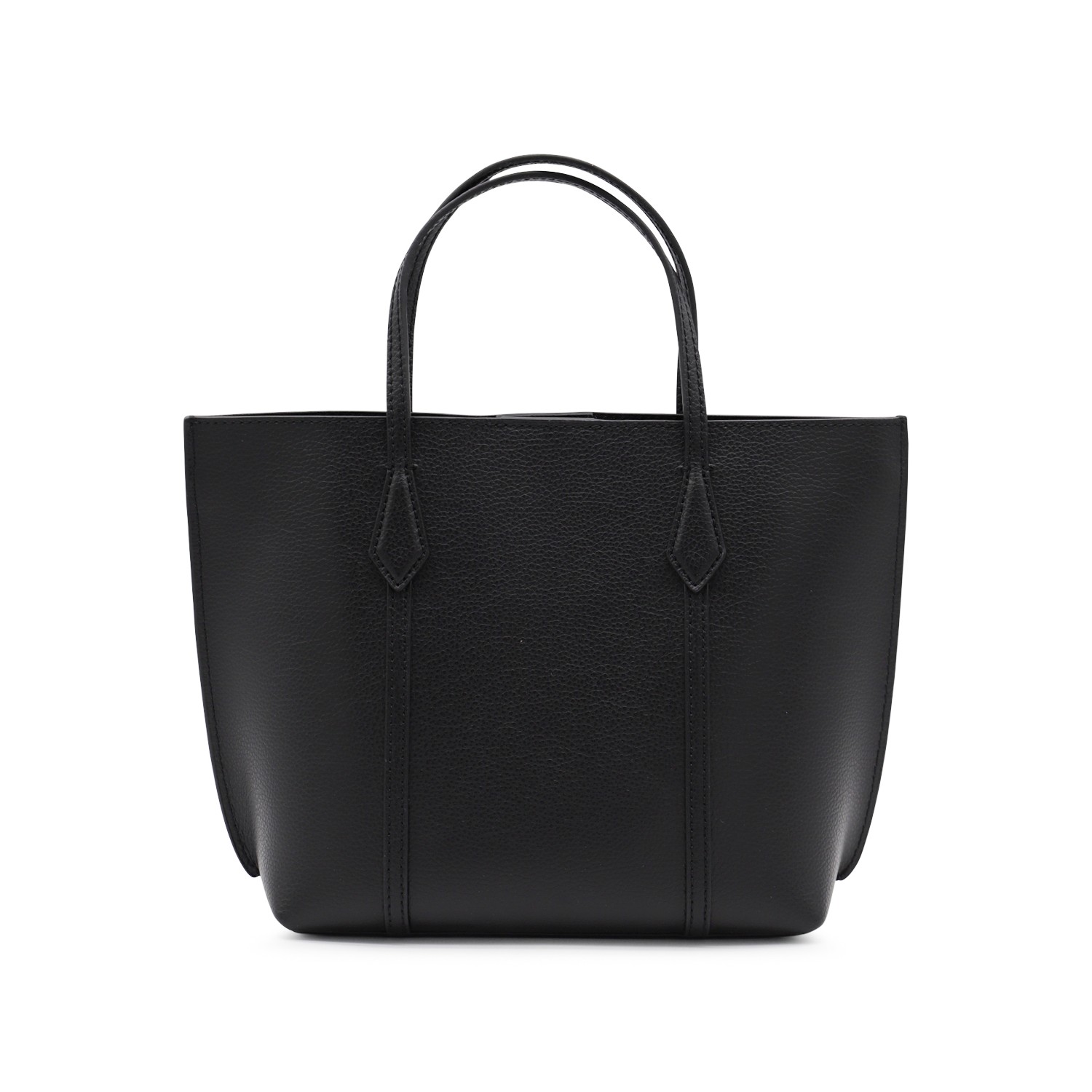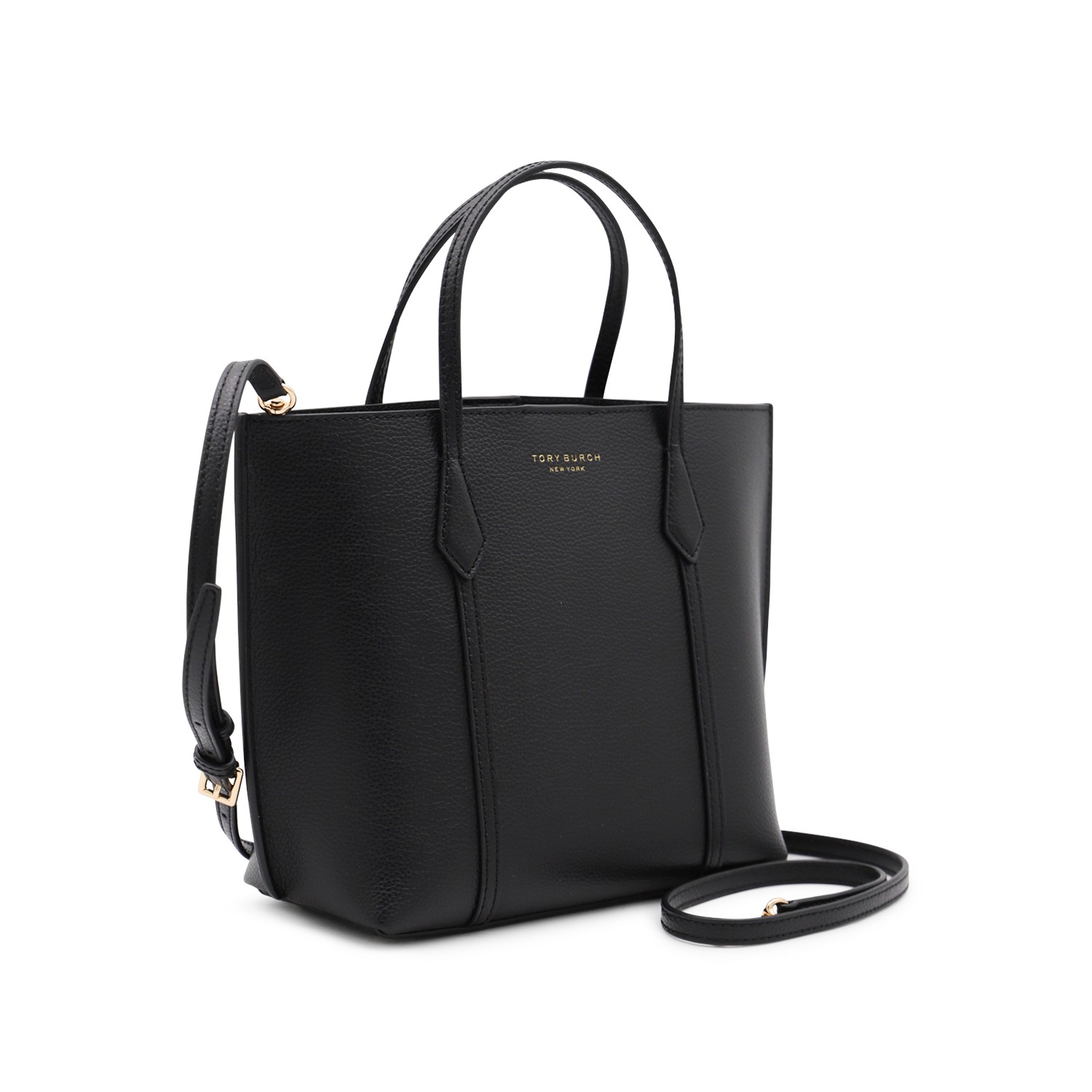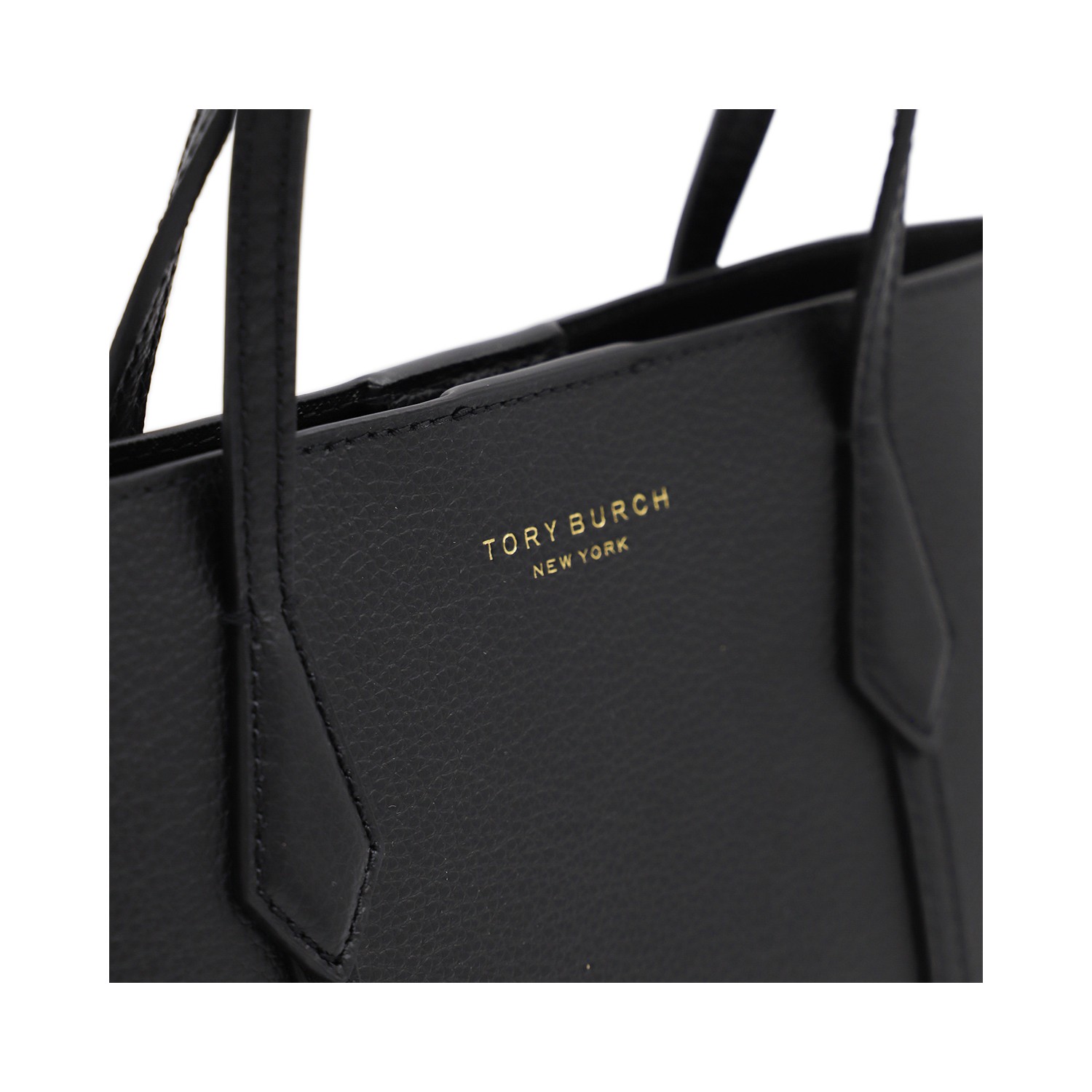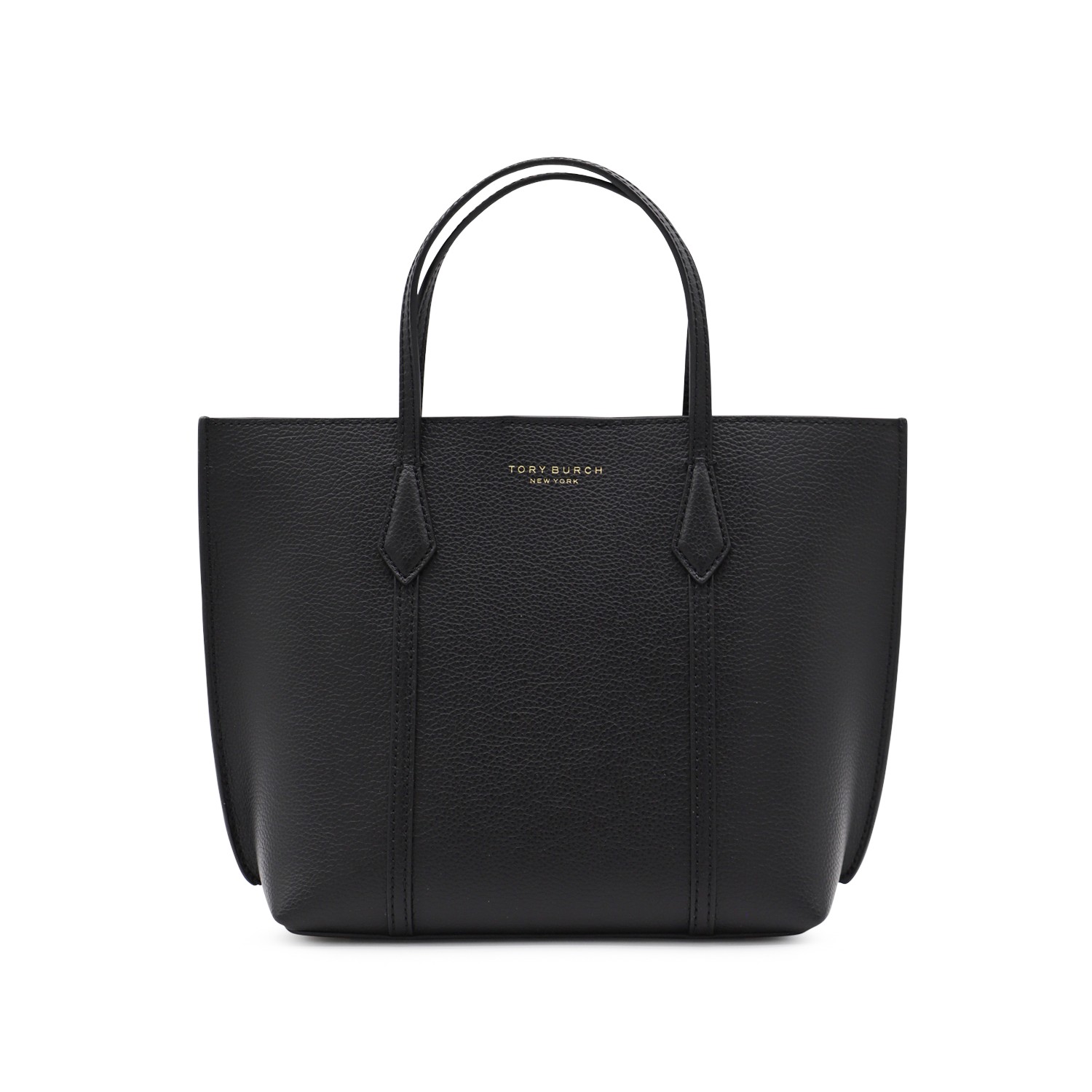 Black leather small Perry totes from Tory Burch featuring top handles, frontal logo, upper fastening and pocket.