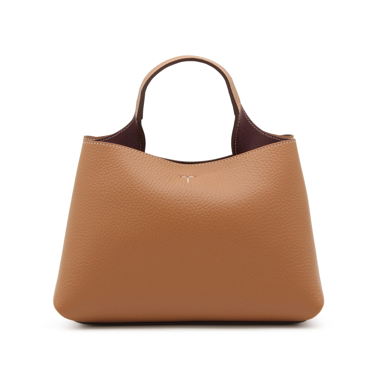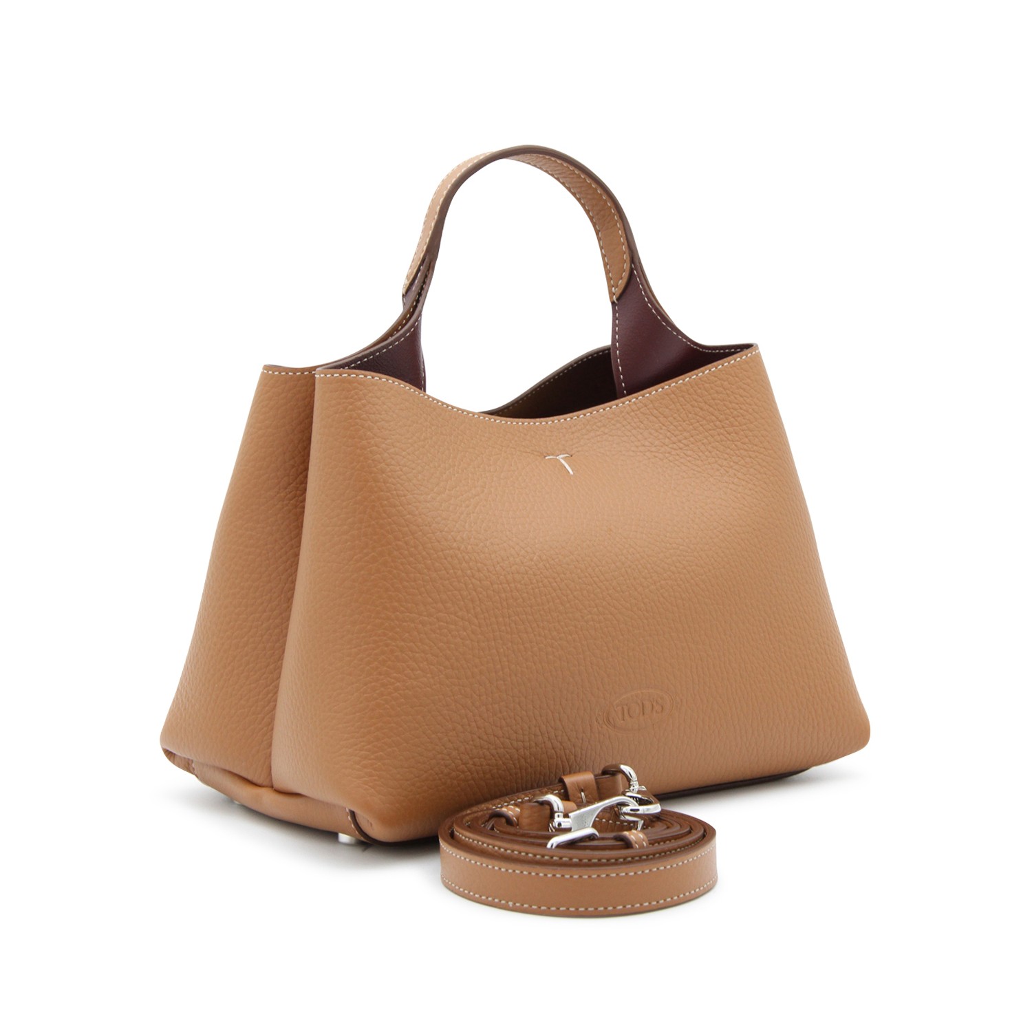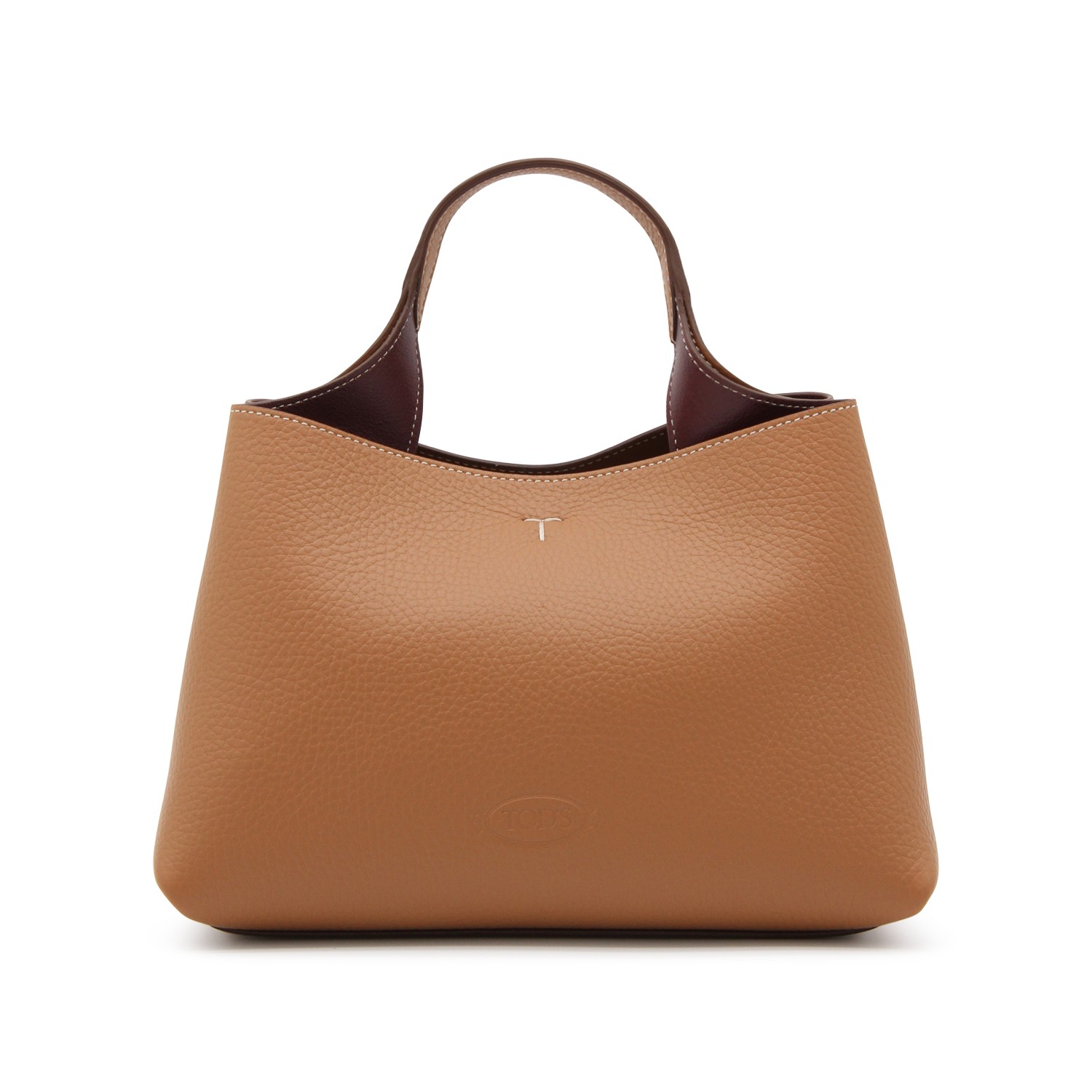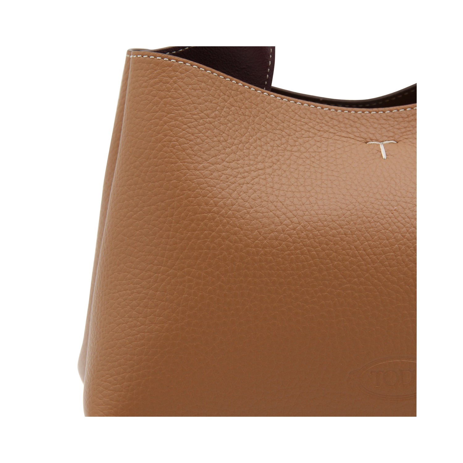 Brown leather tote bag from Tod's featuring grained texture, debossed logo to the front, logo pendant, hook fastening, adjustable detachable shoulder strap, single top handle, partitioned compartment, internal zip-fastening pocket and metal feet.