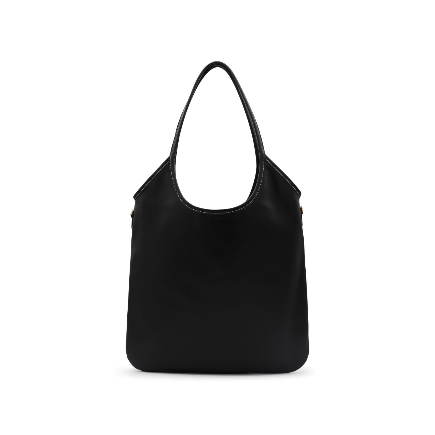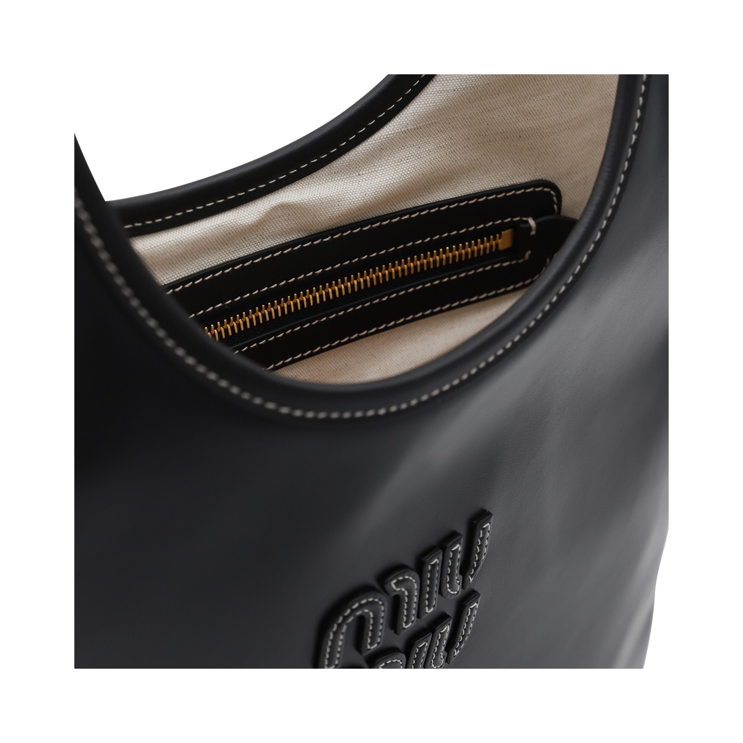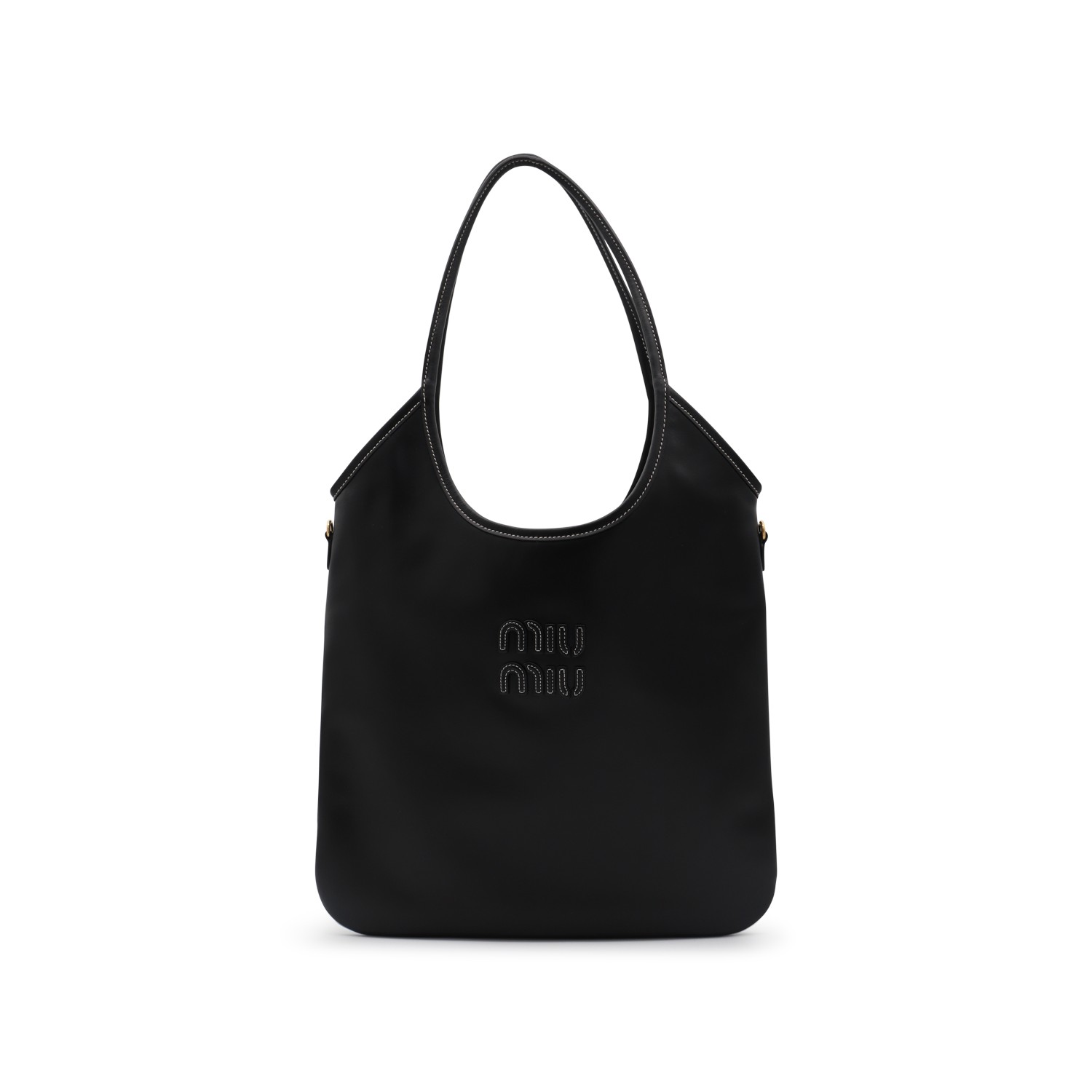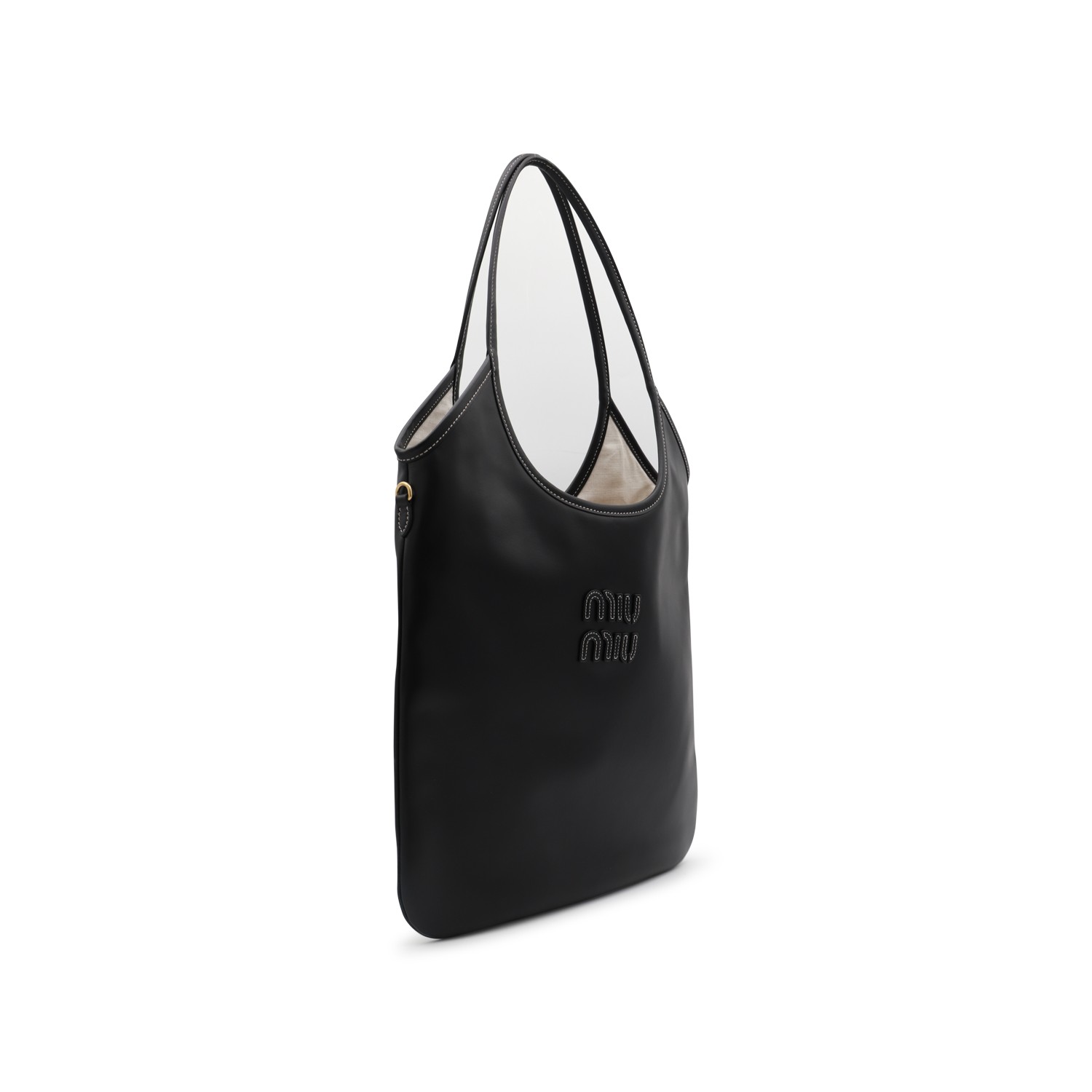 Black leather tote from Miu Miu featuring top handles, frontal logo and single compartment.